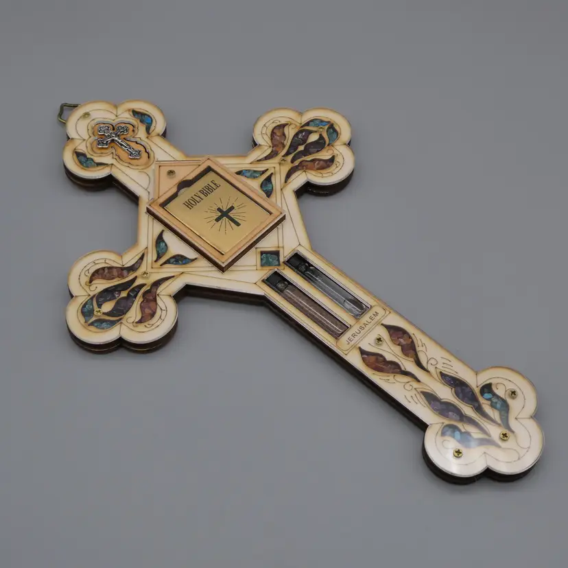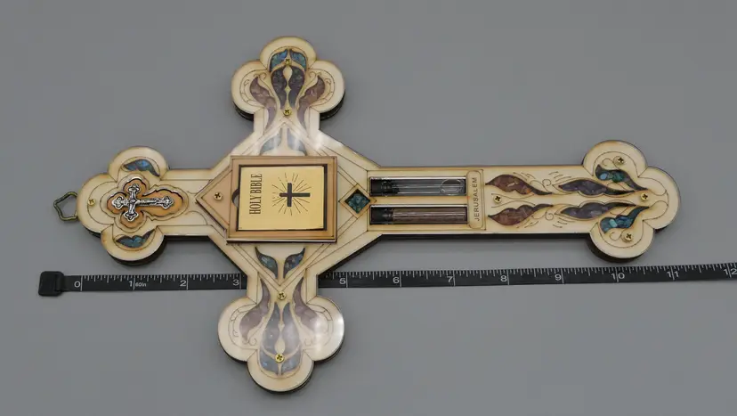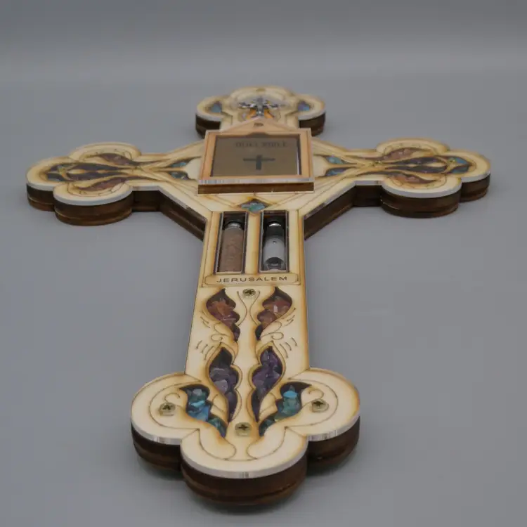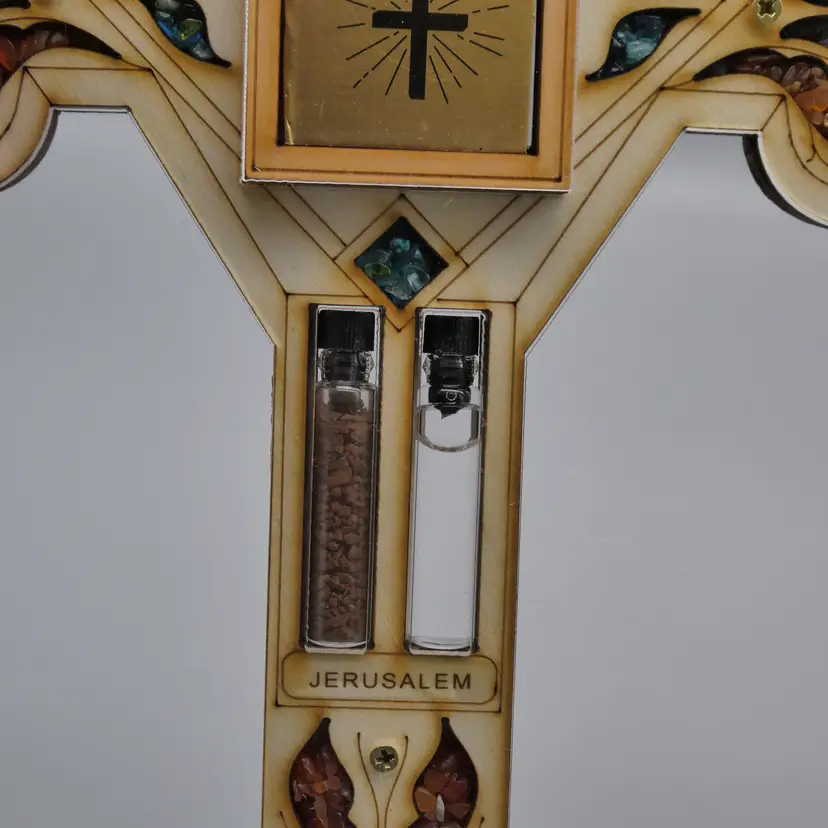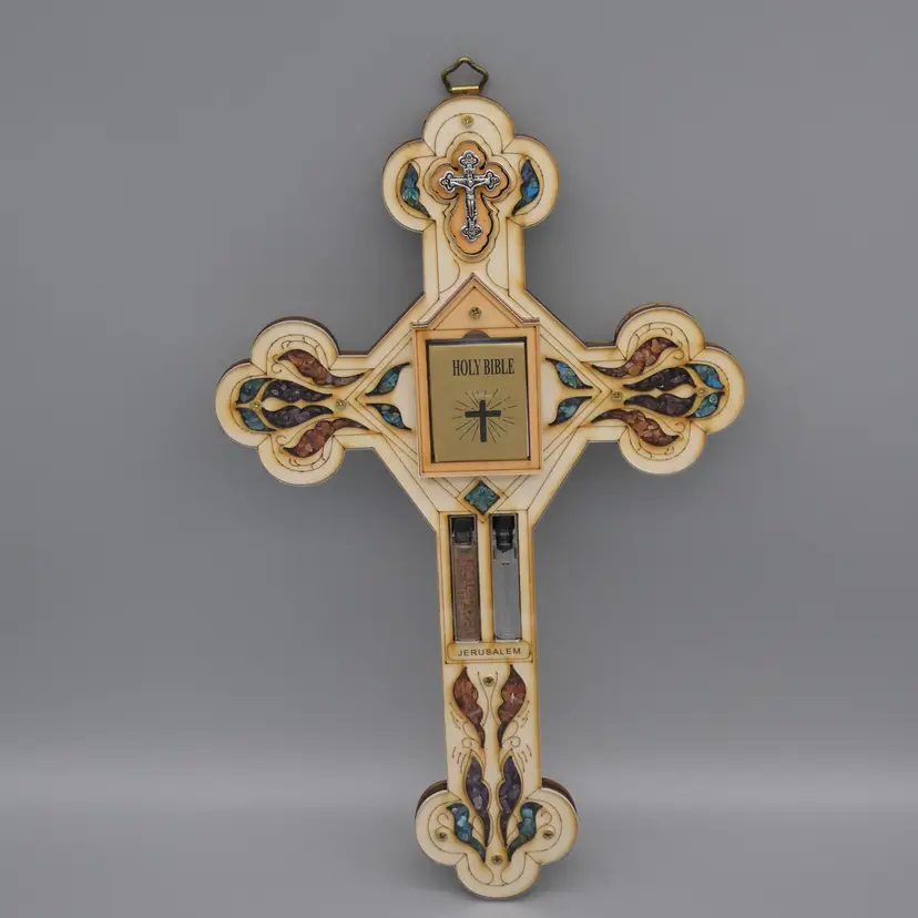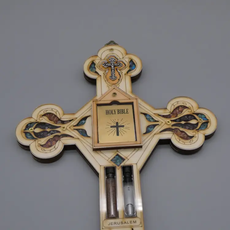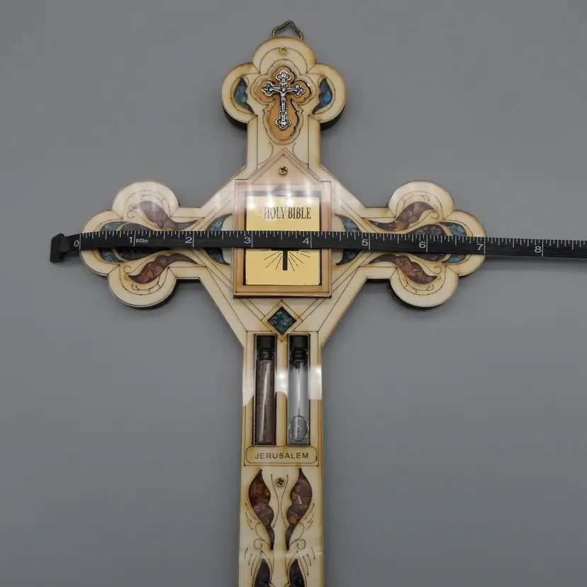 Featuring a gorgeous wall blessing cross with two inset vials of holy water and holy soil Acrylic door swivels to allow removal of the miniature bible (yes, it's real!) The top of the cross features an antiqued silver-toned crucifix Healing stone chips include amethyst, carnelian, turquoise and aquamarine (untested) Construction layers include two layers of wood and a clear acrylic top layer for protection Both layers of wood feature pyrography, including the Jerusalem text on the front Attached metal loop for wall hanging on back Original sticker label on back reads: Karma and Luck, Handmade in the Holy Land Measure overall about 11-3/4" long including hang tab x 7" wide x 3/8" deep not counting bible Weighs about 4.5 ounces before being packaged to ship