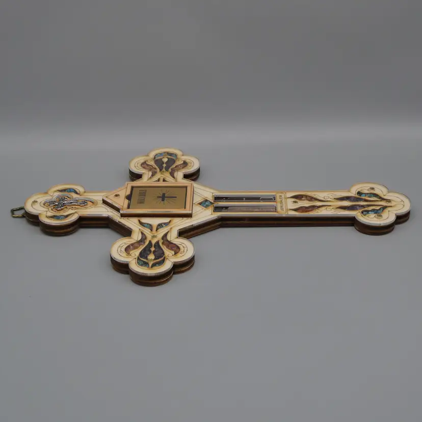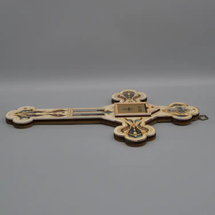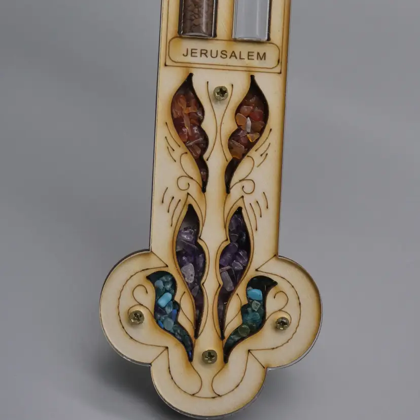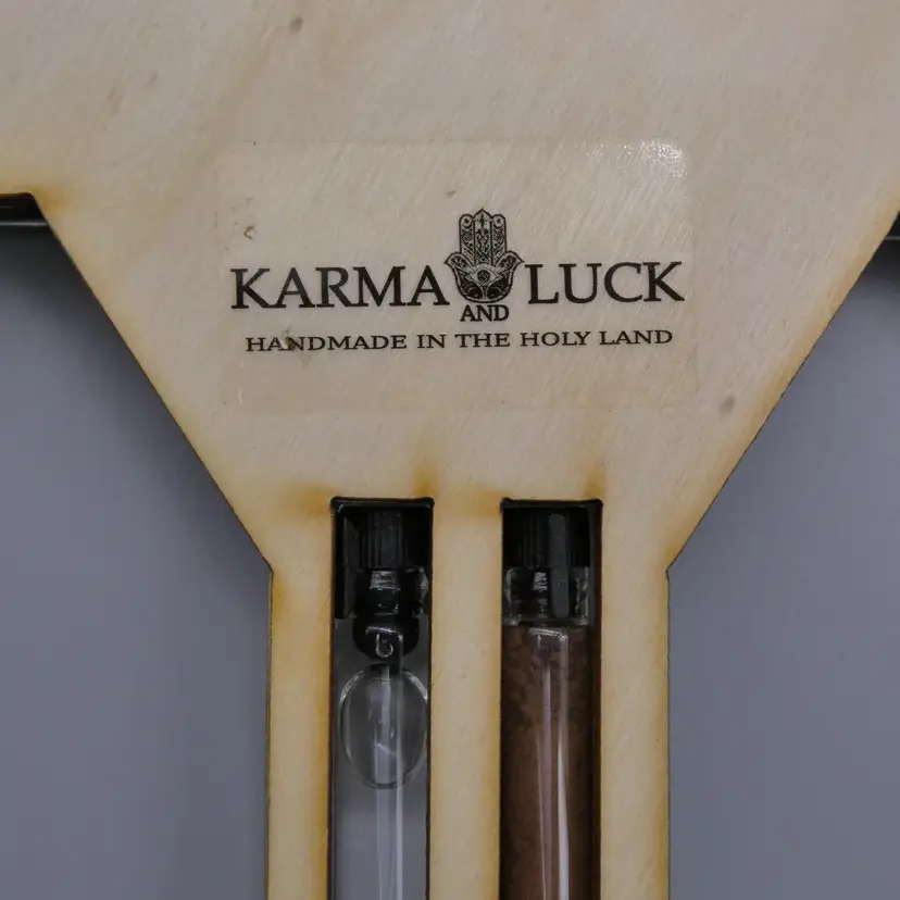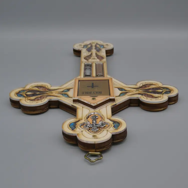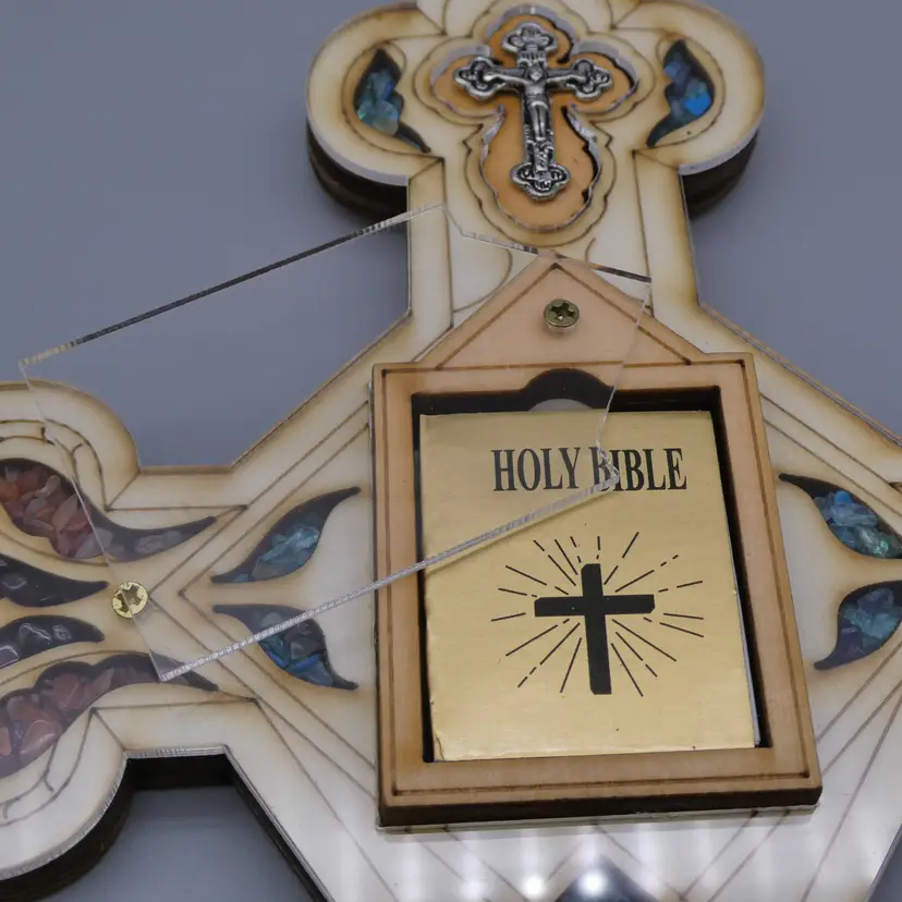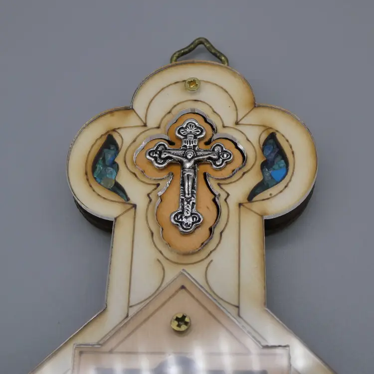 Featuring a gorgeous wall blessing cross with two inset vials of holy water and holy soil Acrylic door swivels to allow removal of the miniature bible (yes, it's real!) The top of the cross features an antiqued silver-toned crucifix Healing stone chips include amethyst, carnelian, turquoise and aquamarine (untested) Construction layers include two layers of wood and a clear acrylic top layer for protection Both layers of wood feature pyrography, including the Jerusalem text on the front Attached metal loop for wall hanging on back Original sticker label on back reads: Karma and Luck, Handmade in the Holy Land Measure overall about 11-3/4" long including hang tab x 7" wide x 3/8" deep not counting bible Weighs about 4.5 ounces before being packaged to ship