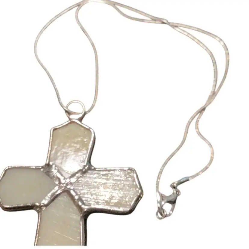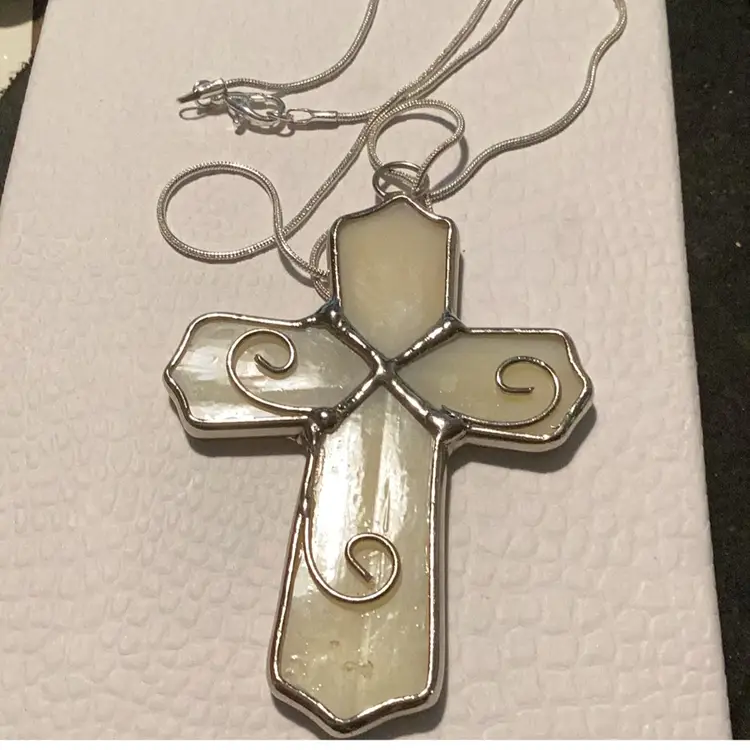 Cross stained necklace on Silvertone chain very, very pretty. It’s not heavy at all.
