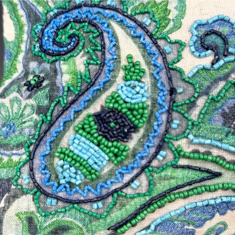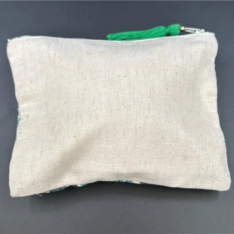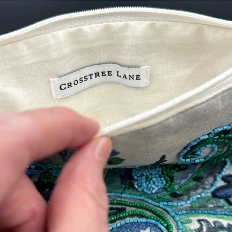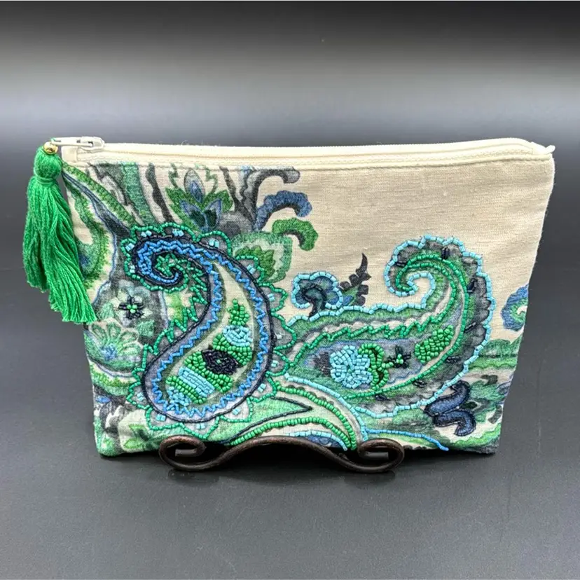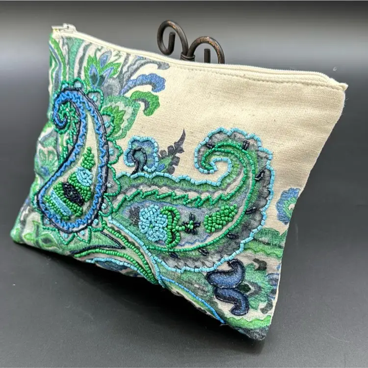 8”W 6”T The show of this item is 90% cotton and 10% linen lining is 100% cotton and beaded no beads missing in wonderful condition. There appears to be no stains and very nice clean condition.