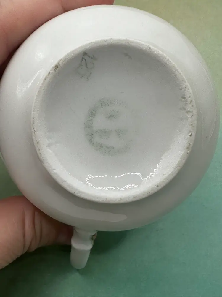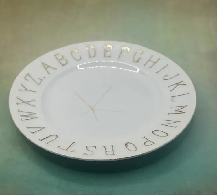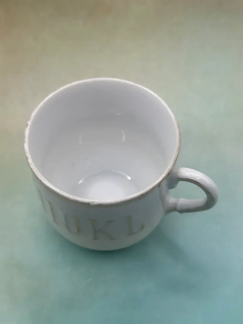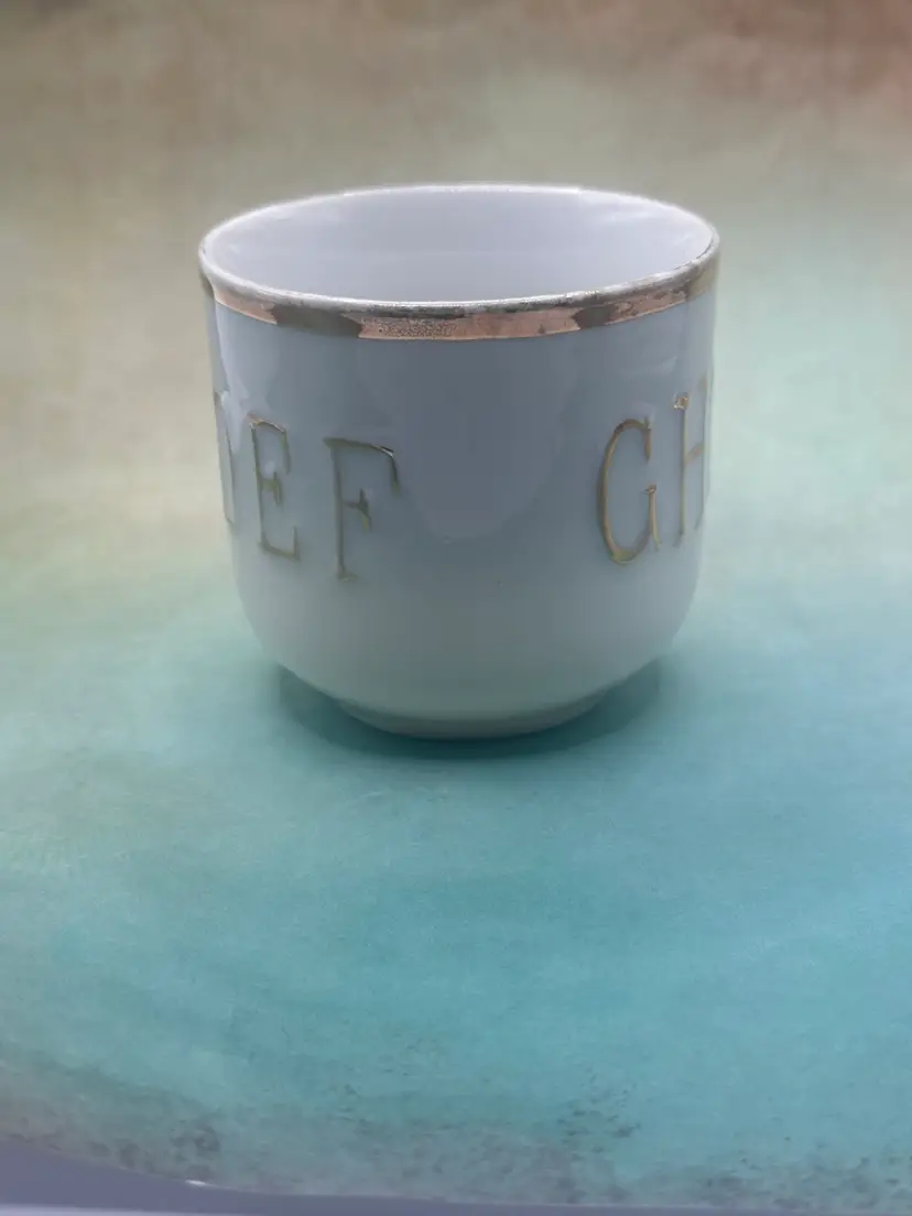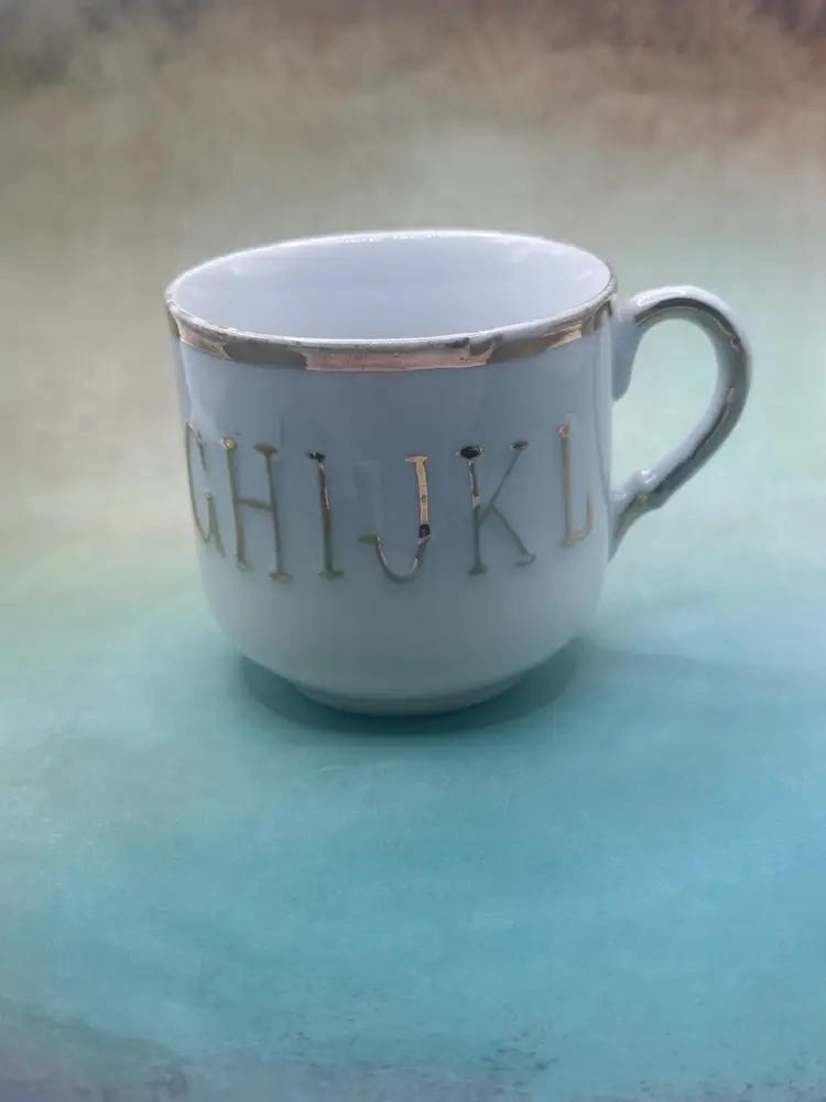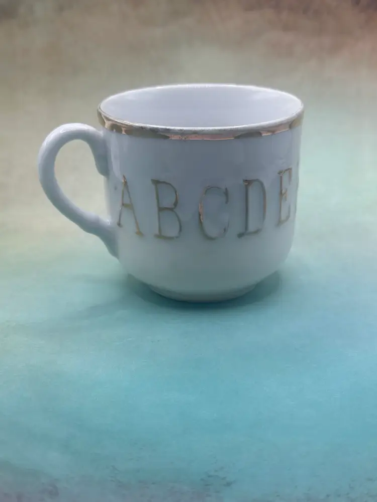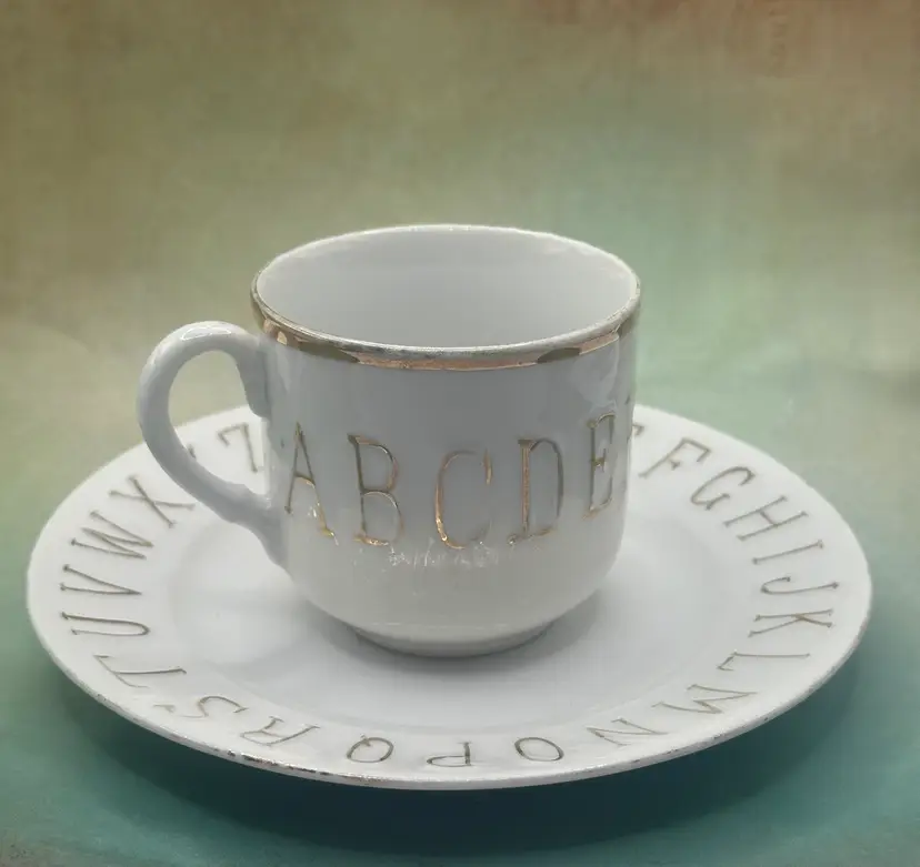 This set of 2 child's cups and plates with gold trim features a vintage design from Germany, showcasing raised letters and painted ABC's in gold. Made in Germany between 1920-1949, this unique and collectible set is not in perfect condition so please see pictures no chips along the edges. Plate is 6 inch diameter cup is 2.5 inches tall and with handle 3.5 inches length.