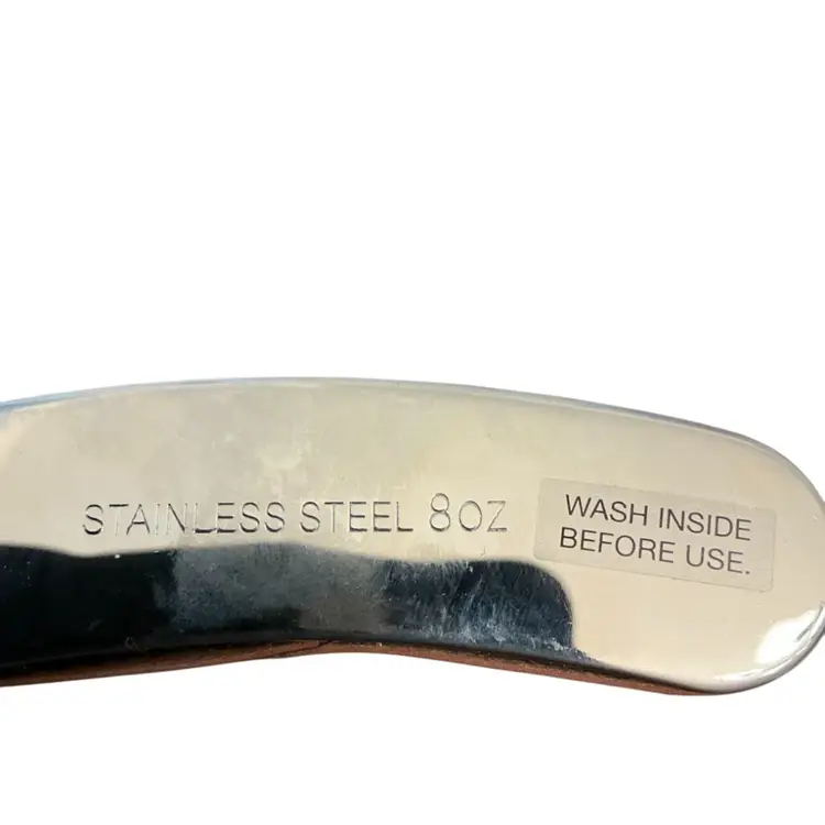 Stainless steel flask perfect for your coat pocket on those cold winter nights sitting by the campfire. 6” by 4.” Shipped empty.