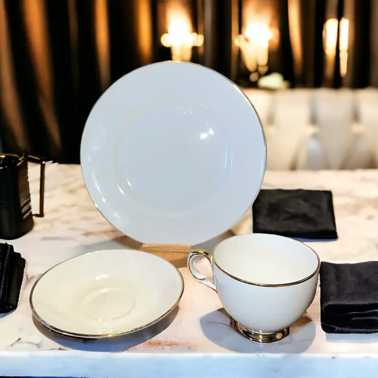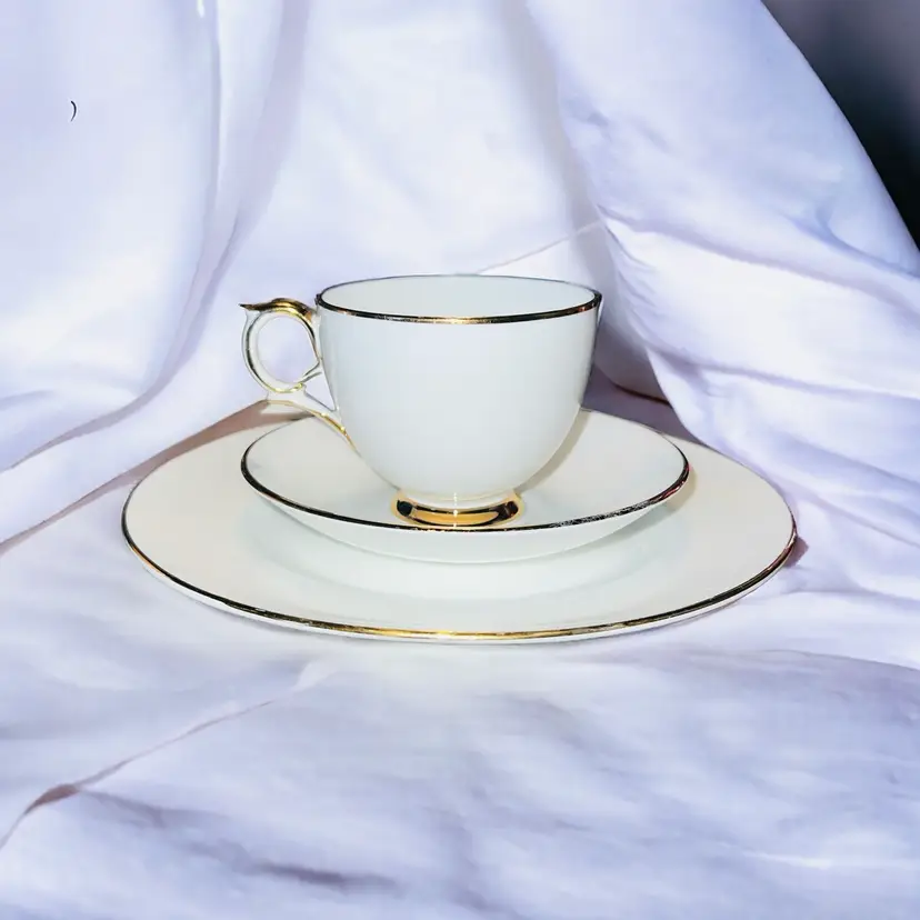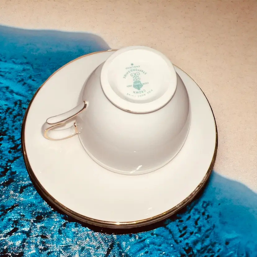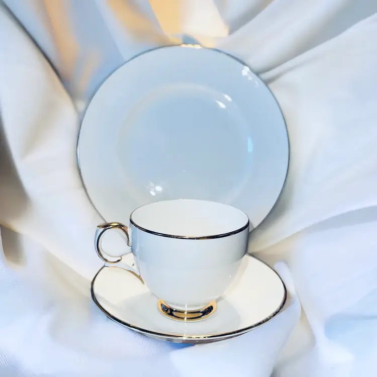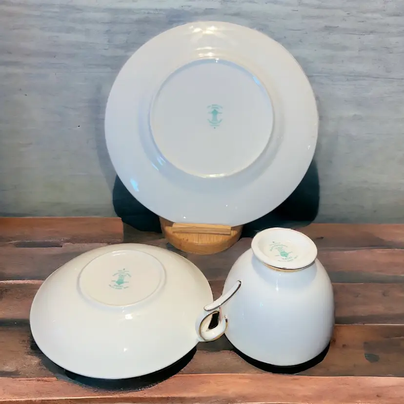 Indulge in a classic British tea experience with this elegant three-piece Crown Staffordshire set. Crafted in England with bone china, this glossy white cup, saucer, and dessert plate feature a regal crown pattern with gold trim. Perfect for any occasion, this vintage set adds a touch of sophistication to your tea time. Hand wash only and not handmade, this original production style set is a must-have for any collector or admirer of British culture.