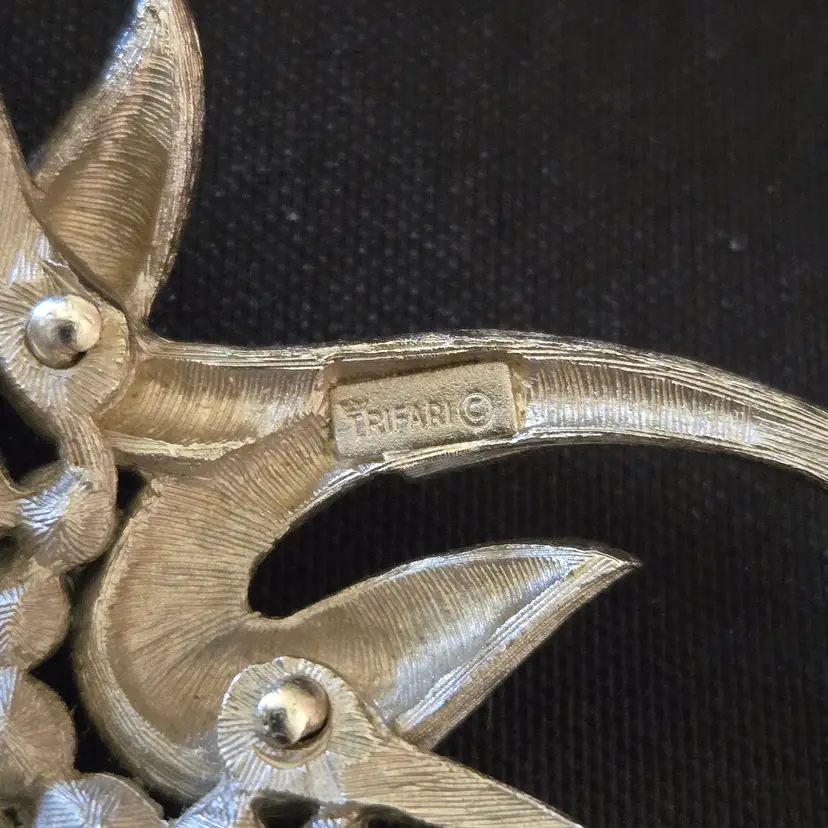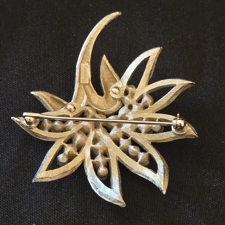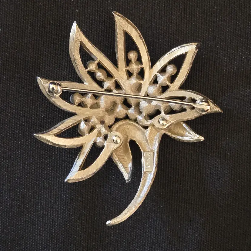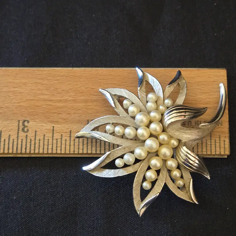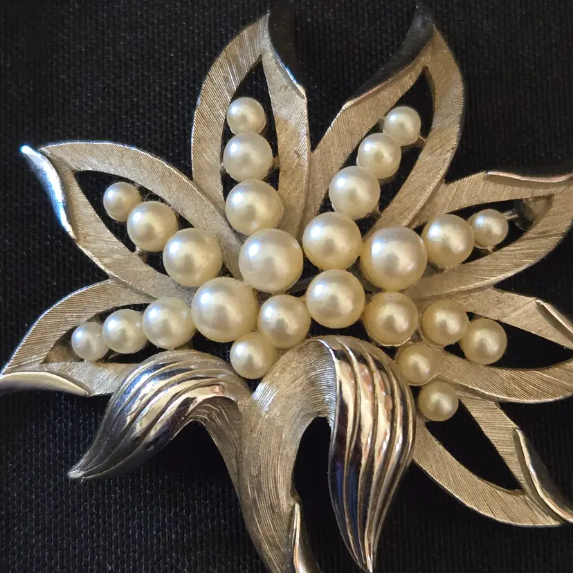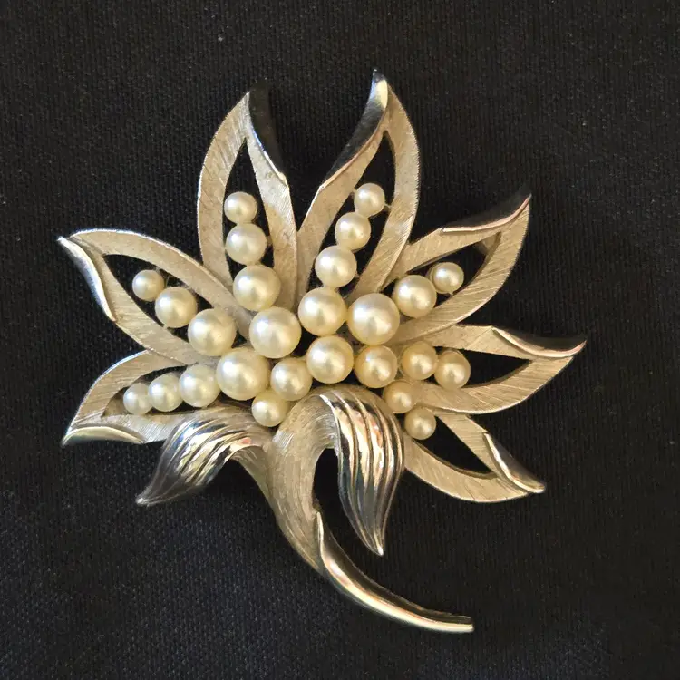 Crown Trifari Brooch Pin Flower with Faux Pearls & Silver Tone Metal Vintage Stamped on back. Used condition with some wear from use over the years. Please view all the photos and please ask any questions prior to purchase when possible.