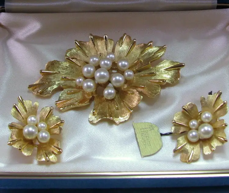 Really a wonderful vintage Trifari faux pearl brooch and earrings set.