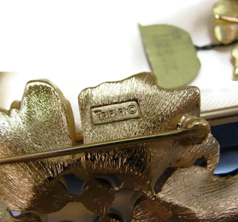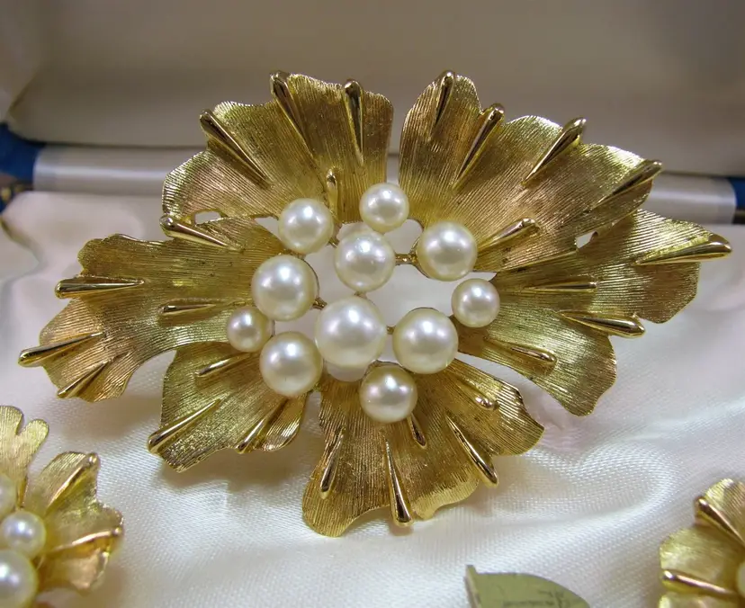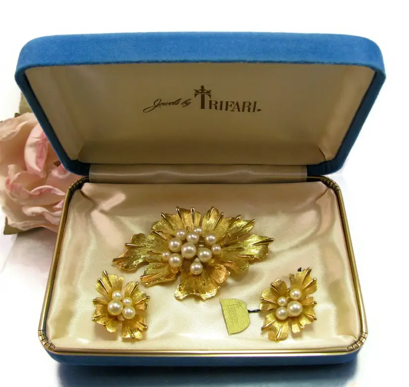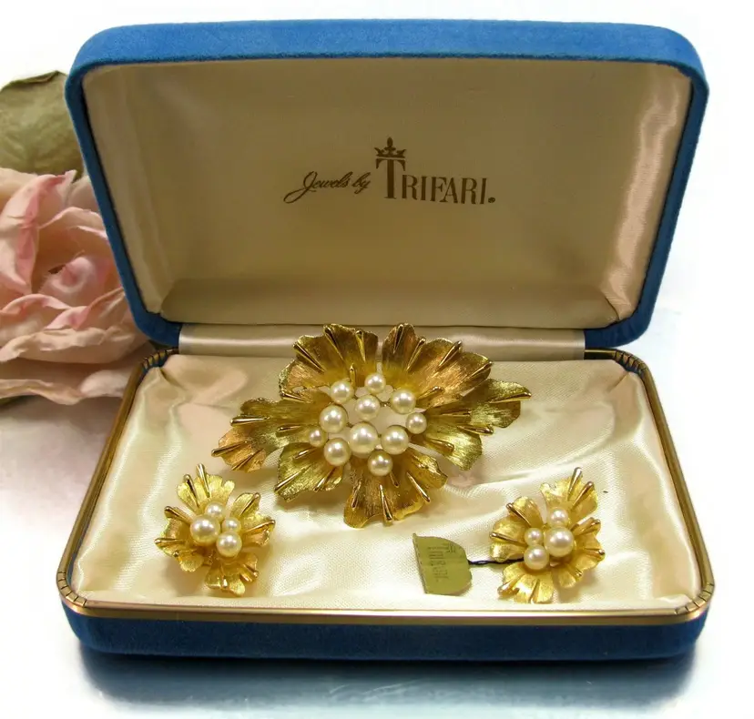 This wonderful vintage signed Crown TRIFARI gold tone pin and earring set features a floral design set with faux pearls.