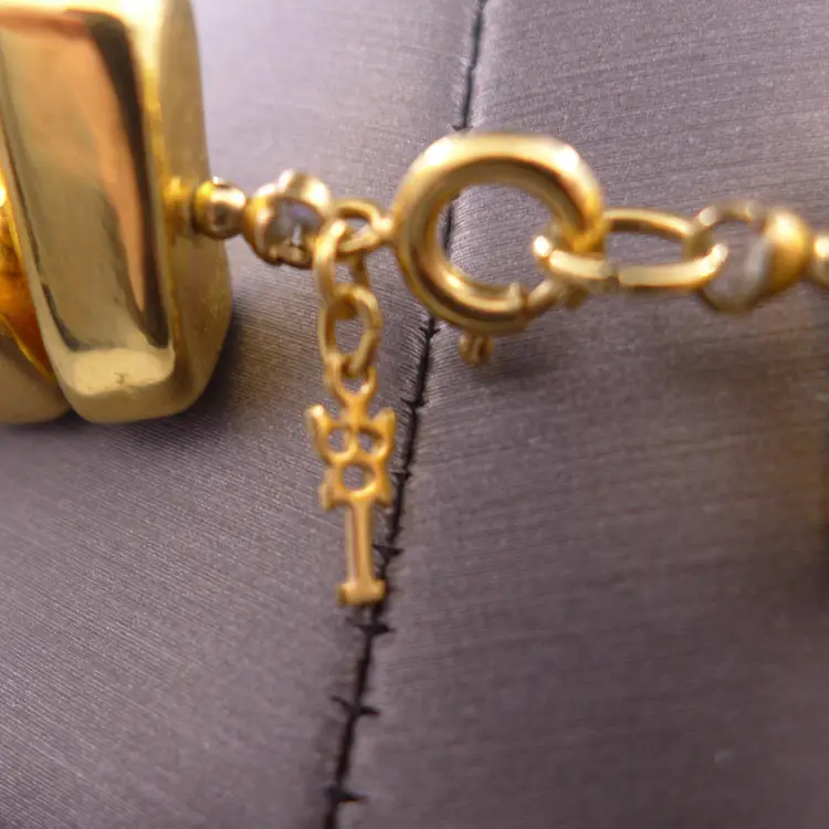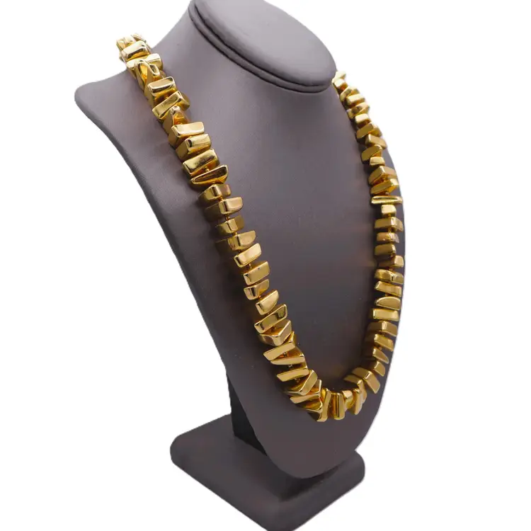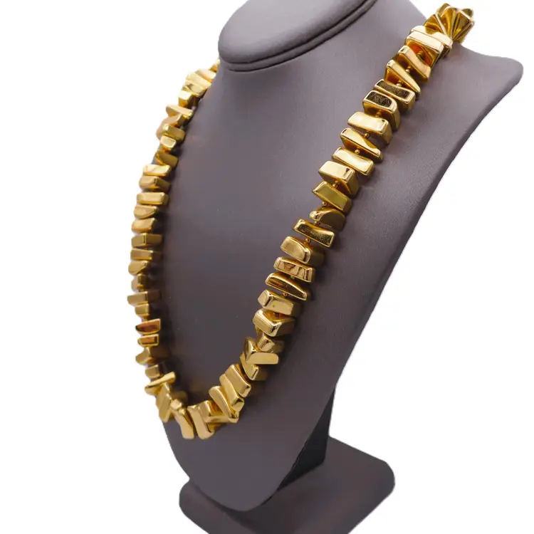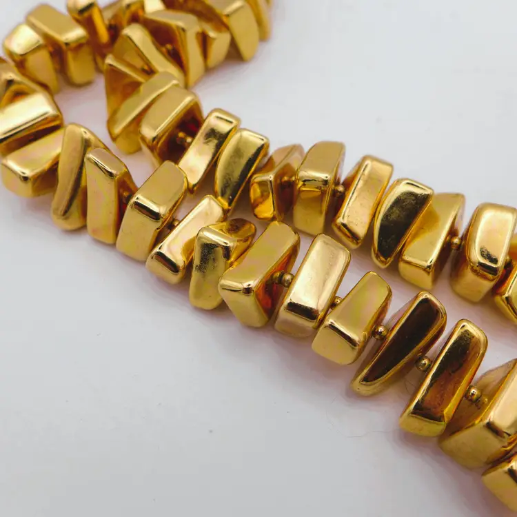 Vintage Crown Trifari gold tone chunky, shiny, brick bead necklace. The beads vary in shape from oblong to square to trapezoid shape. It has a spring ring clasp. Circa 1960s. Each bead is separated with a small round bead. Beautiful statement piece!