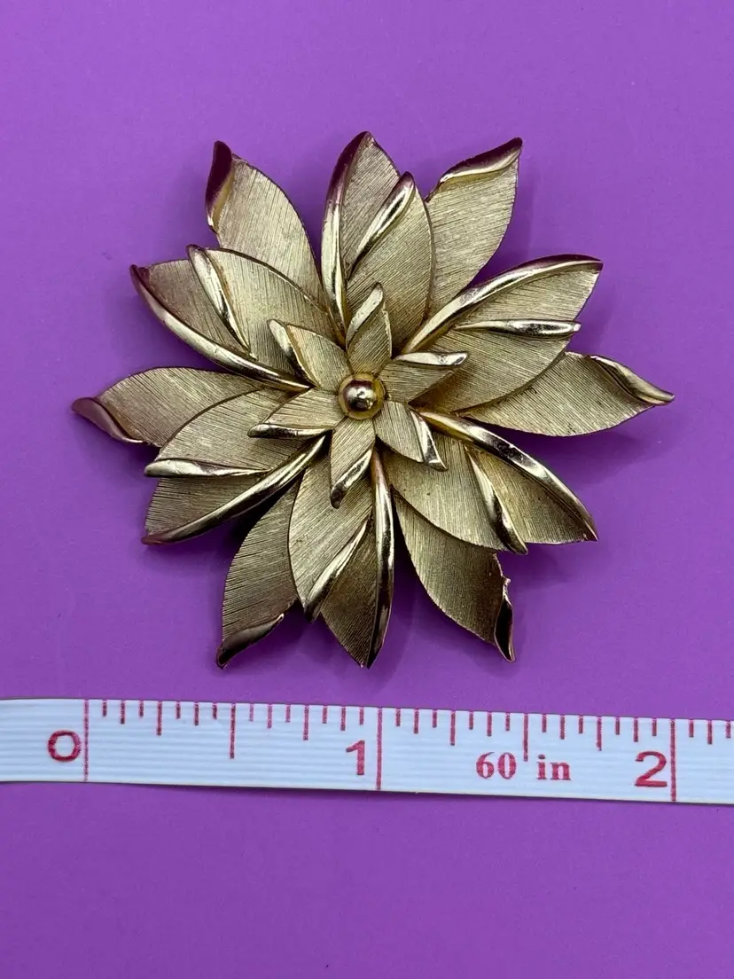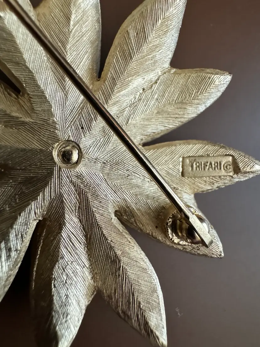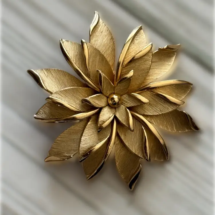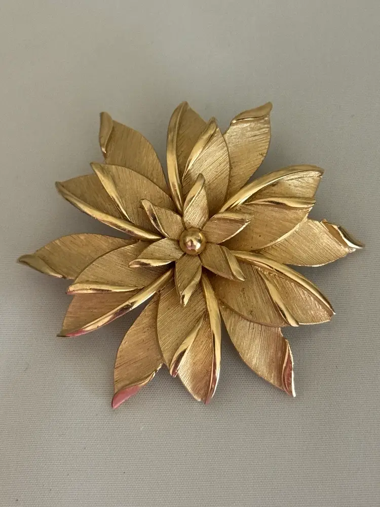 Add a touch of vintage beauty to any outfit with this Crown Trifari brooch. The intricate flower design is sure to impress. The brushed gold tone make it versatile for any occasion and the perfect addition to any fashion jewelry collection.