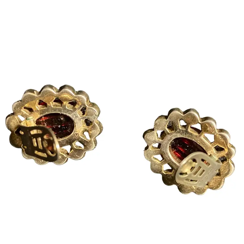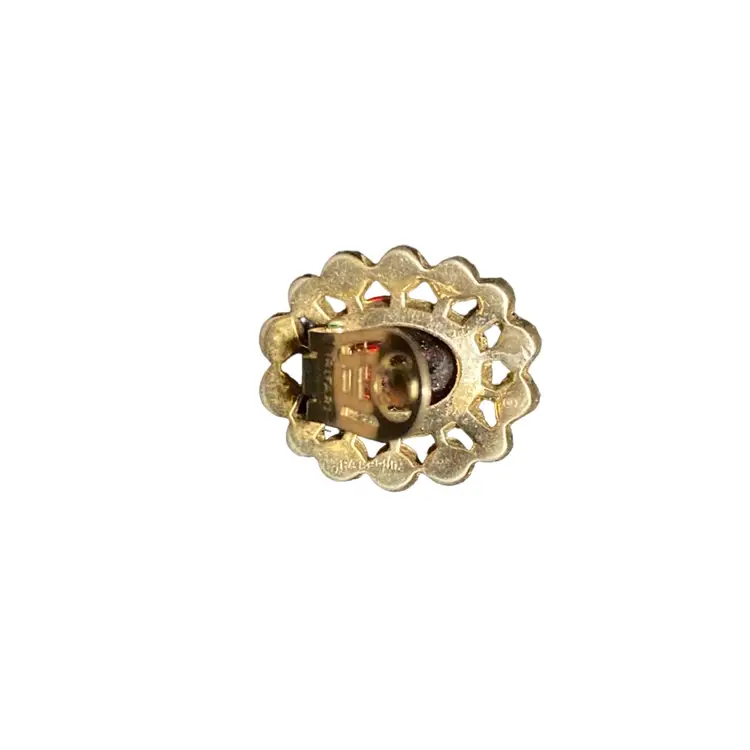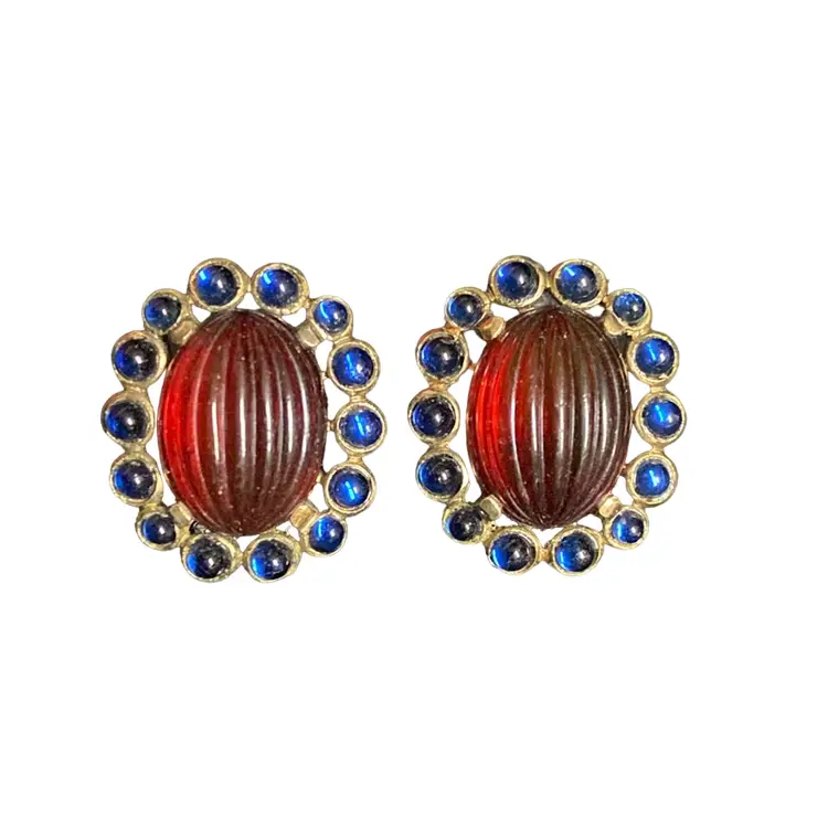 Signed Trifari with Crown Pat Pend. Red ribbed melon stone surrounded by cobalt blue cabochons. Measuring 1” x 3/4” in very good vintage condition. Designed by Alfred Philippe as part of the Jewels of India Collection