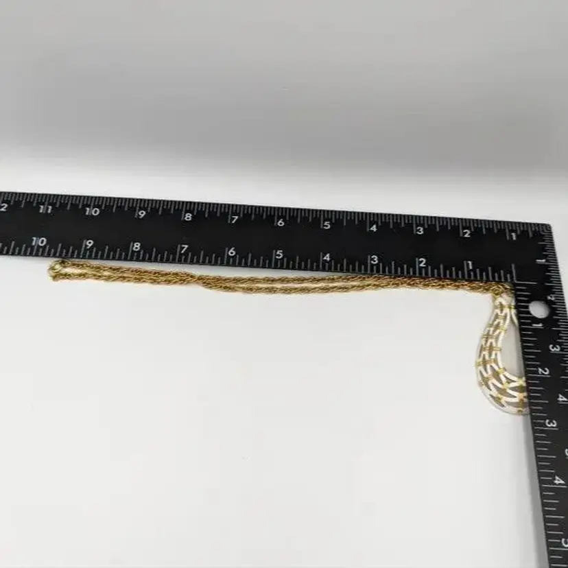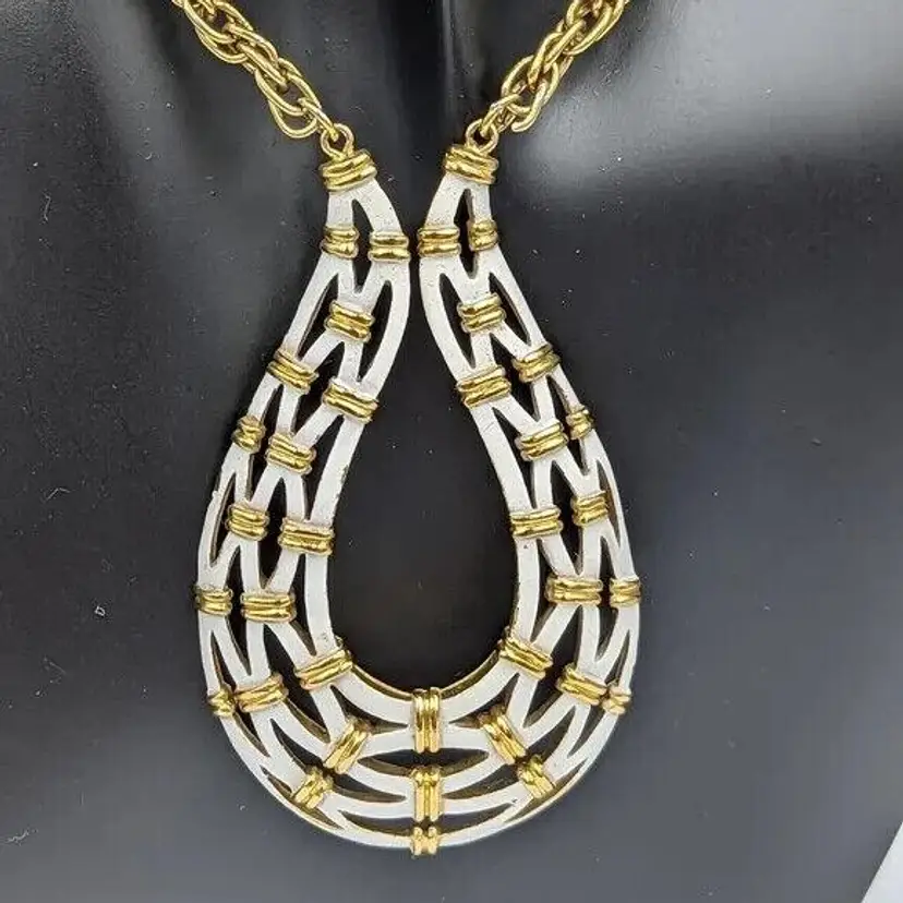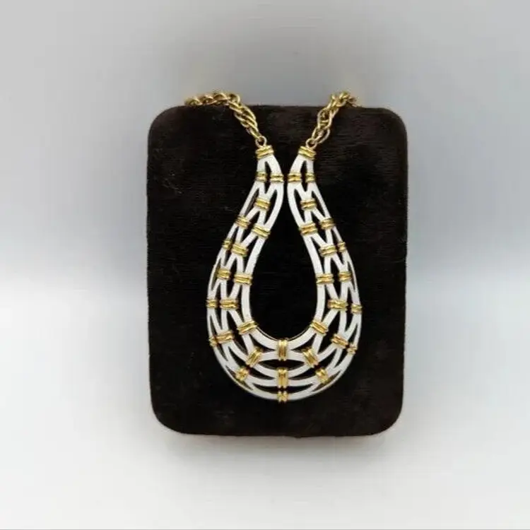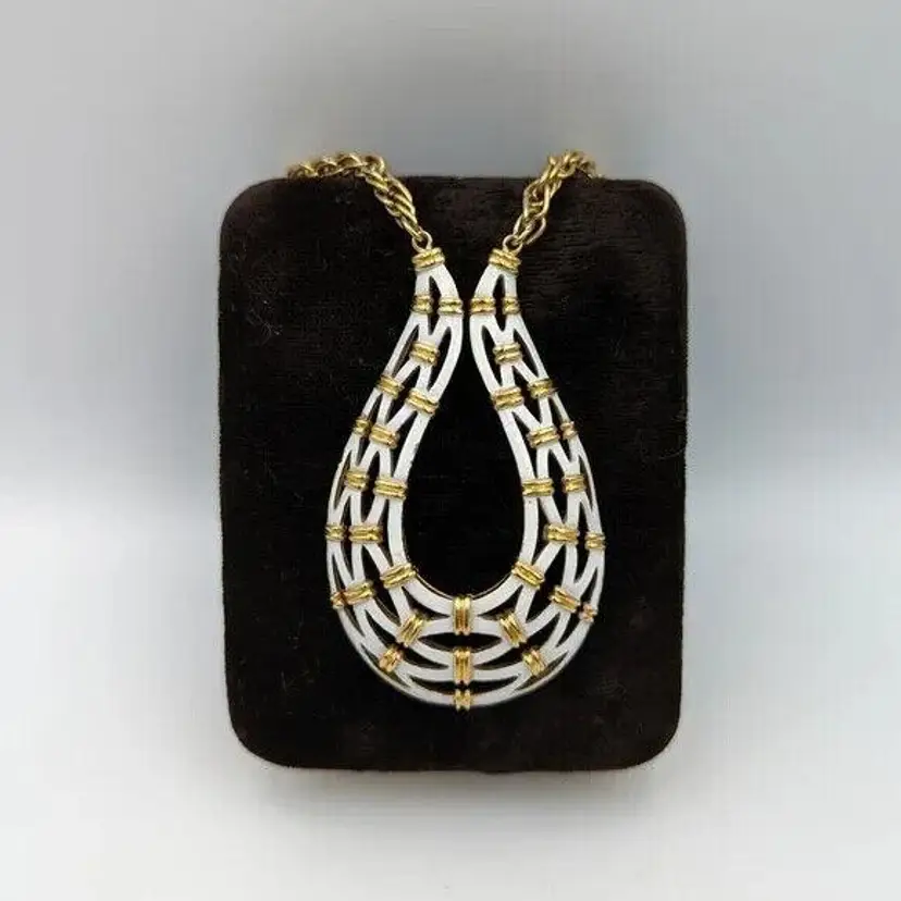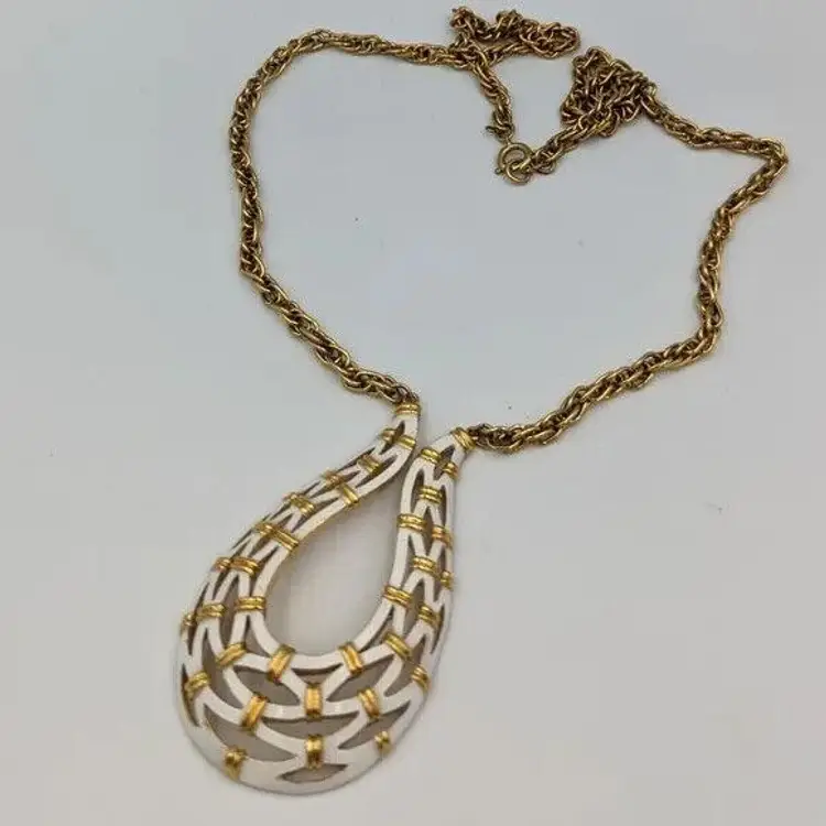 Elegant White Enamel and Gold tone Pendant Necklace by Crown Trifari - mod statement necklace Pendant and Chain are marked Trifari Clasp works. good vintage condition measurements 18" chain and 2.5" pendant