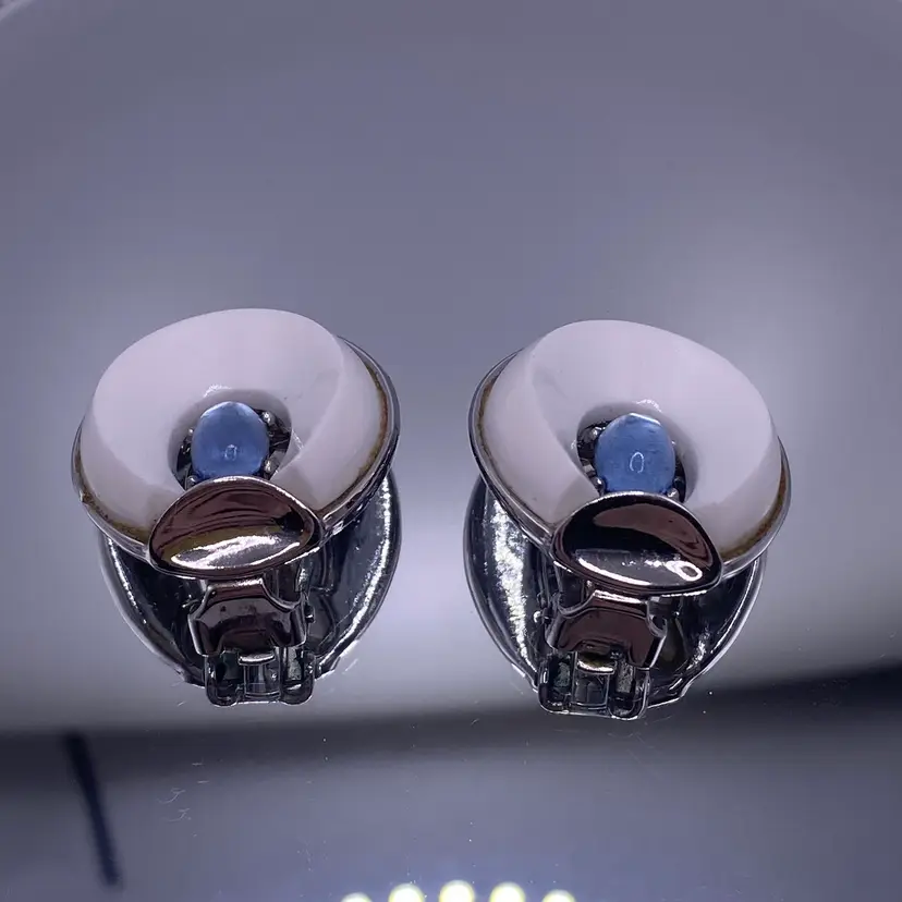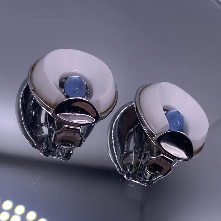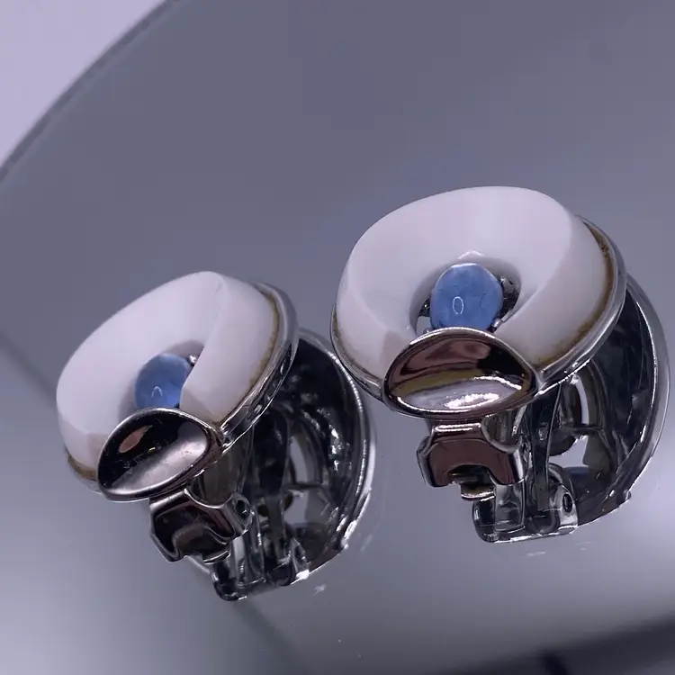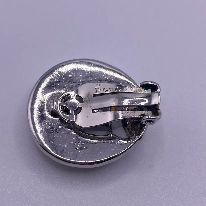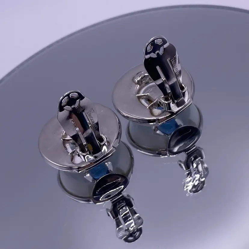 Add a touch of retro fashion to your outfit with these vintage Trifari Santa Anita earrings. The white thermoset plastic earrings feature blue faux jewels and a clip-on closure for easy wear. These earrings are perfect for both casual and formal occasions, and their retro style is sure to complement any outfit.