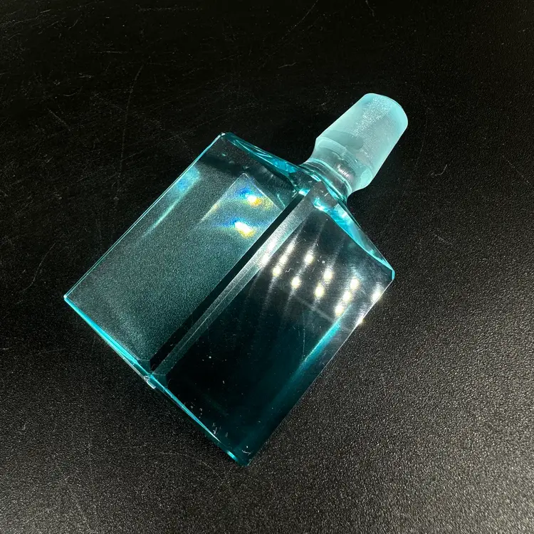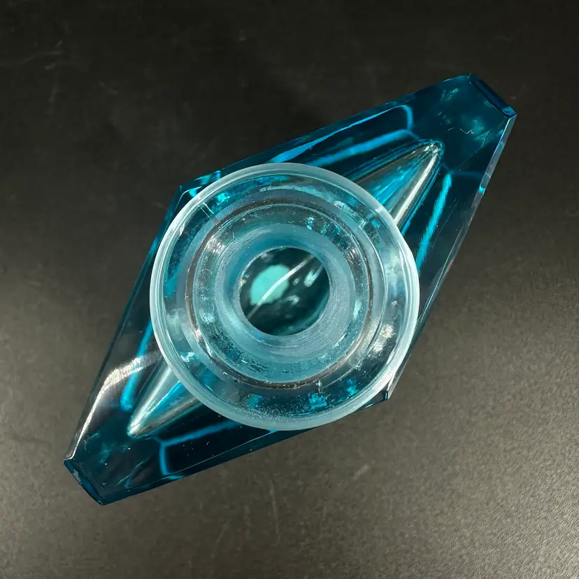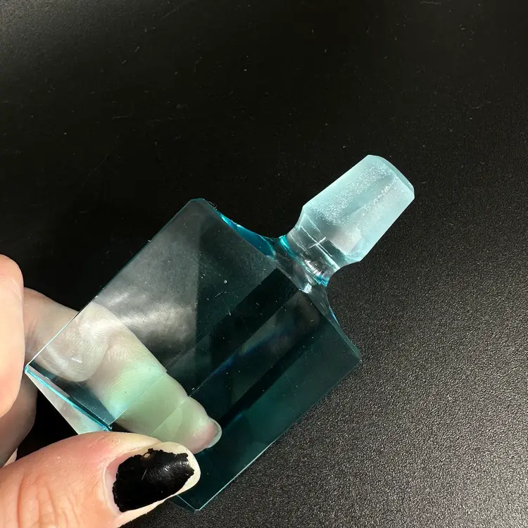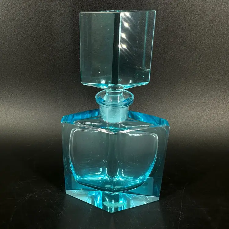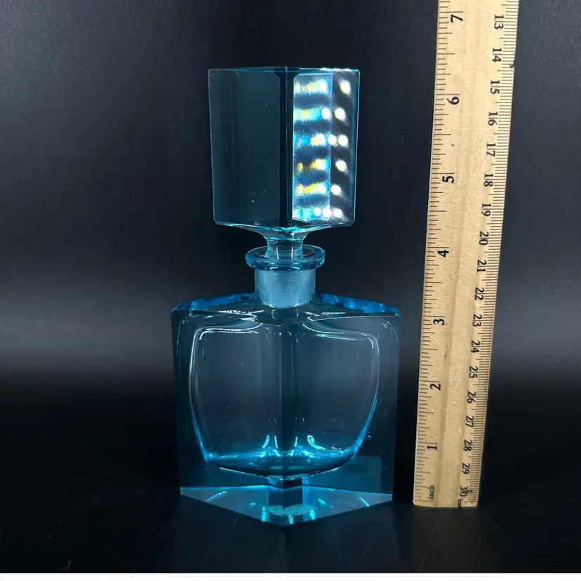 Blue crystal glass multi-faceted perfume bottle. No cracks, very minimal scratching/chipping from usage. Faded sticker on bottom. No signatures. Measures approximately 6.5” tall with stopper.