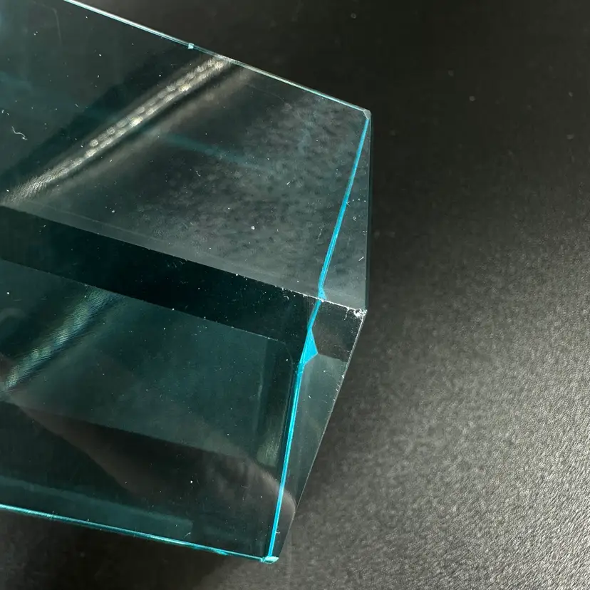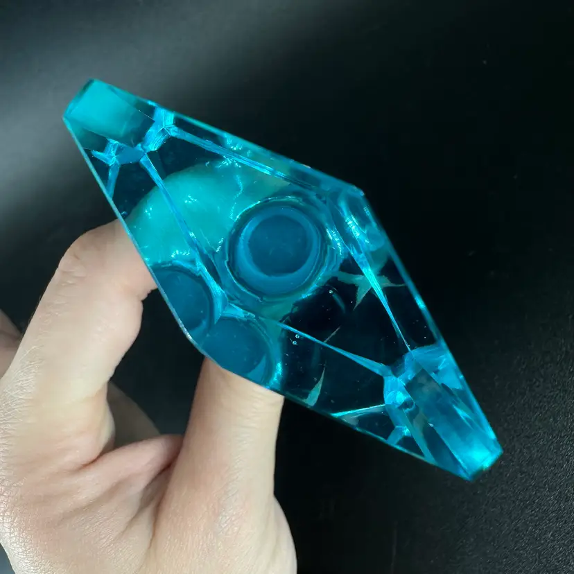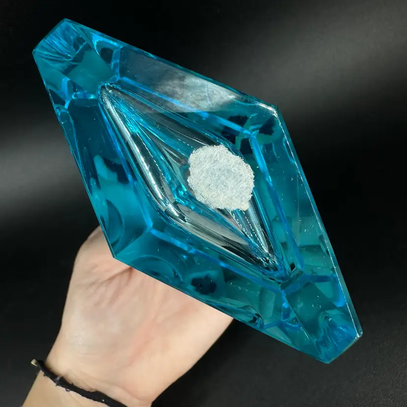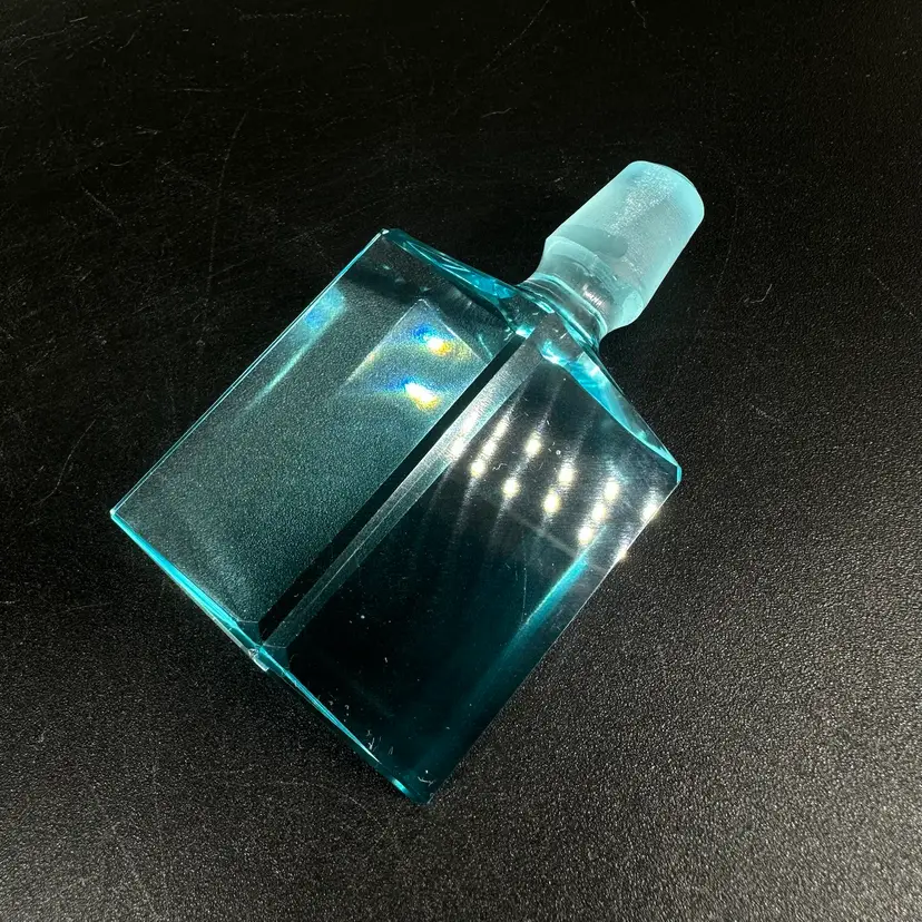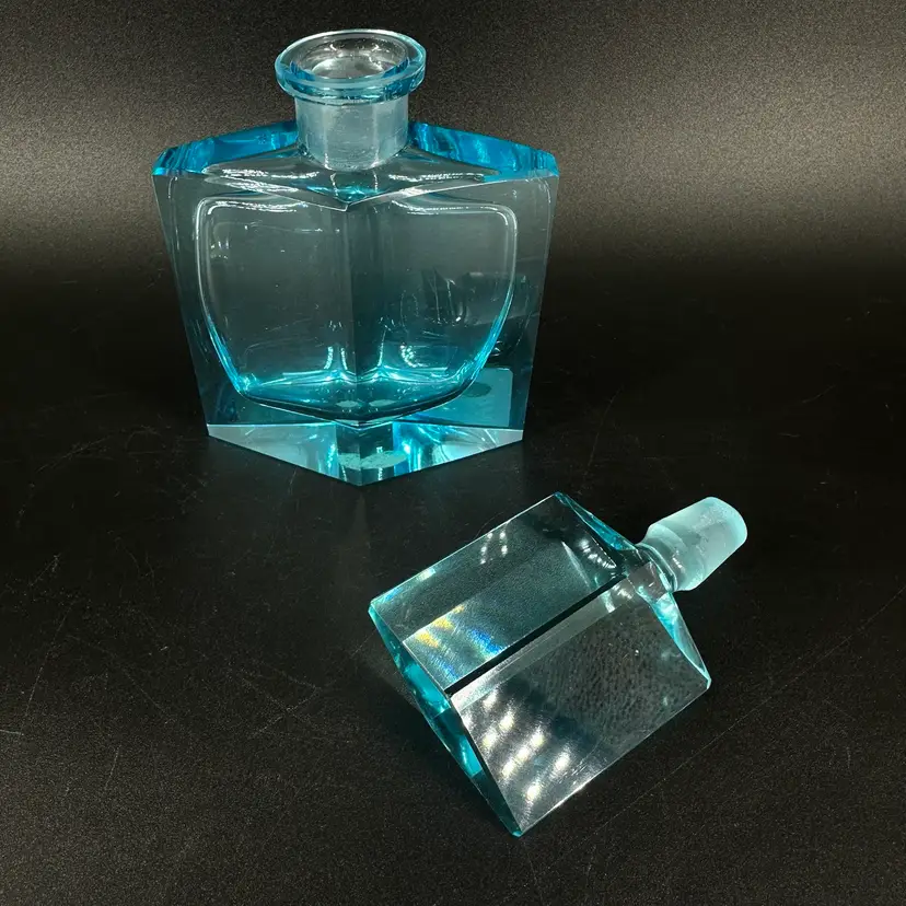Blue crystal glass multi-faceted perfume bottle. No cracks, very minimal scratching/chipping from usage. Faded sticker on bottom. No signatures. Measures approximately 6.5” tall with stopper.