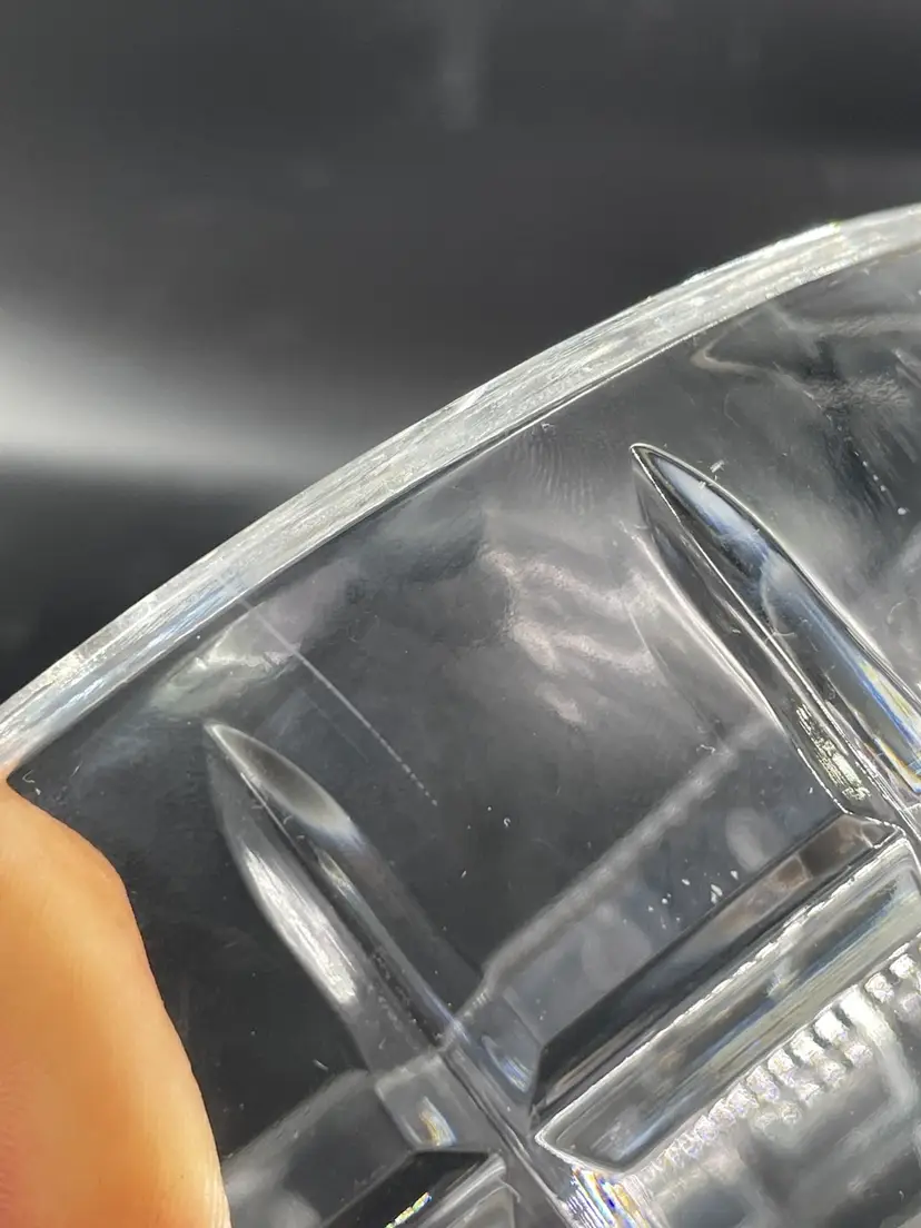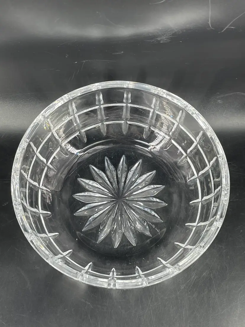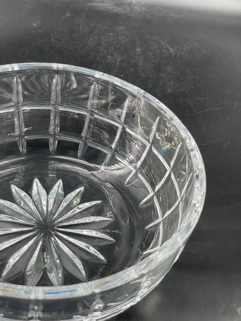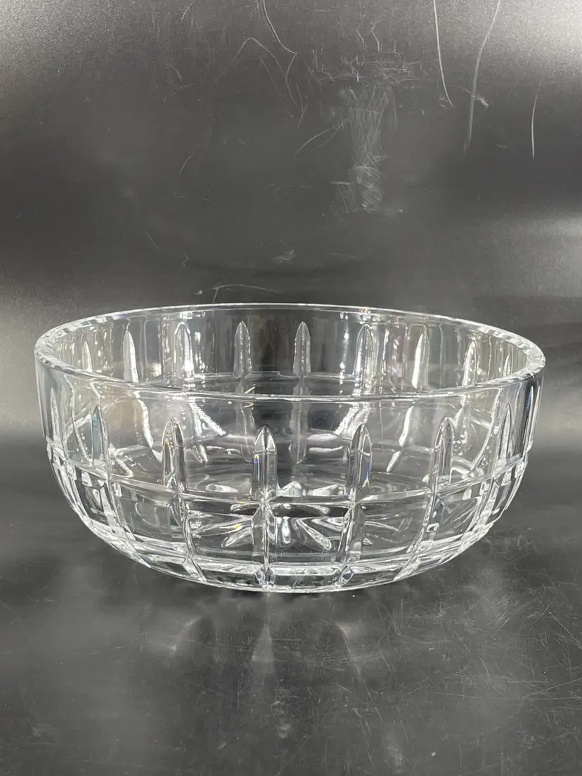 Minor surface scratches. No chips or cracks Measures 3.25” tall and 7.75” diameter crystal bowl