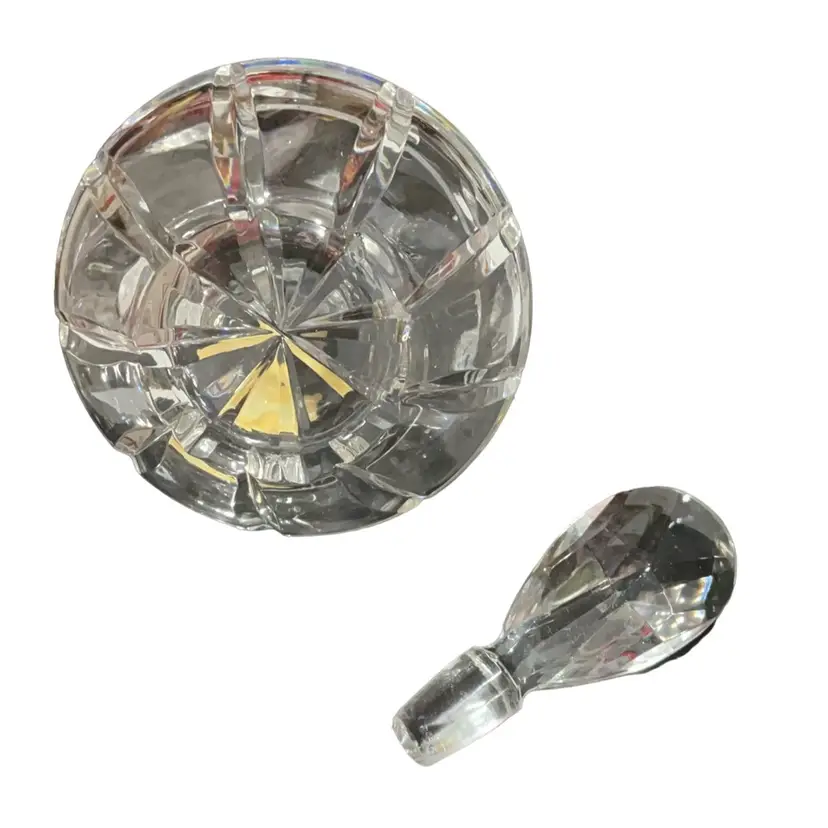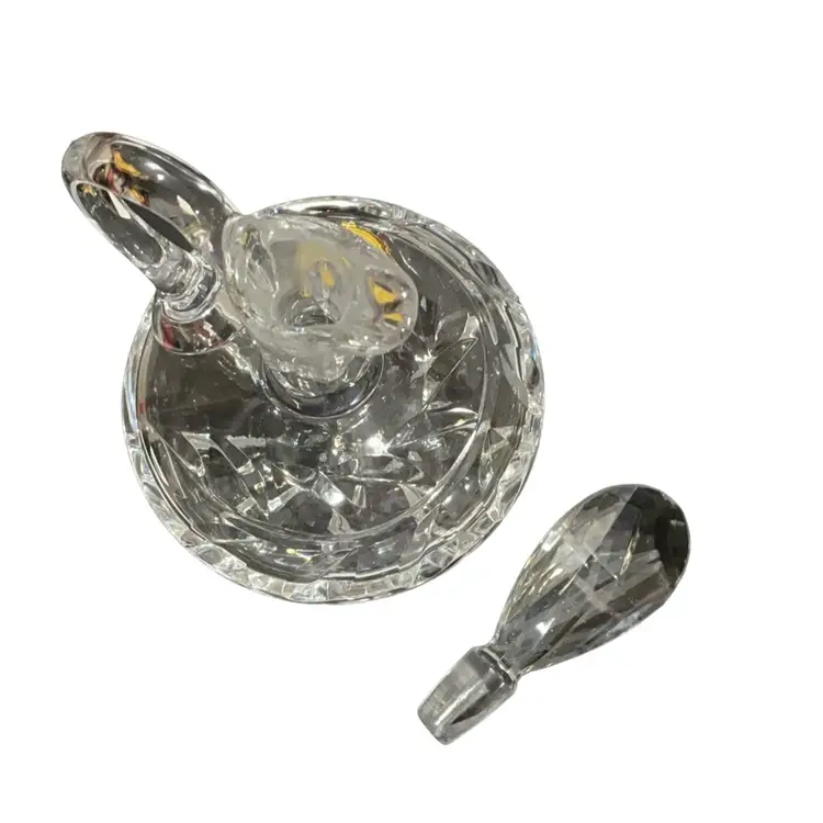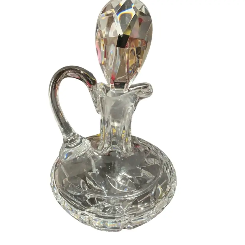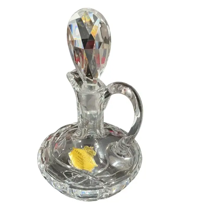 Genuine lead crystal cruet with over 24 % lead oxide handcrafted in west Germany. Little gold wheat design around glass item. Looks great for age.