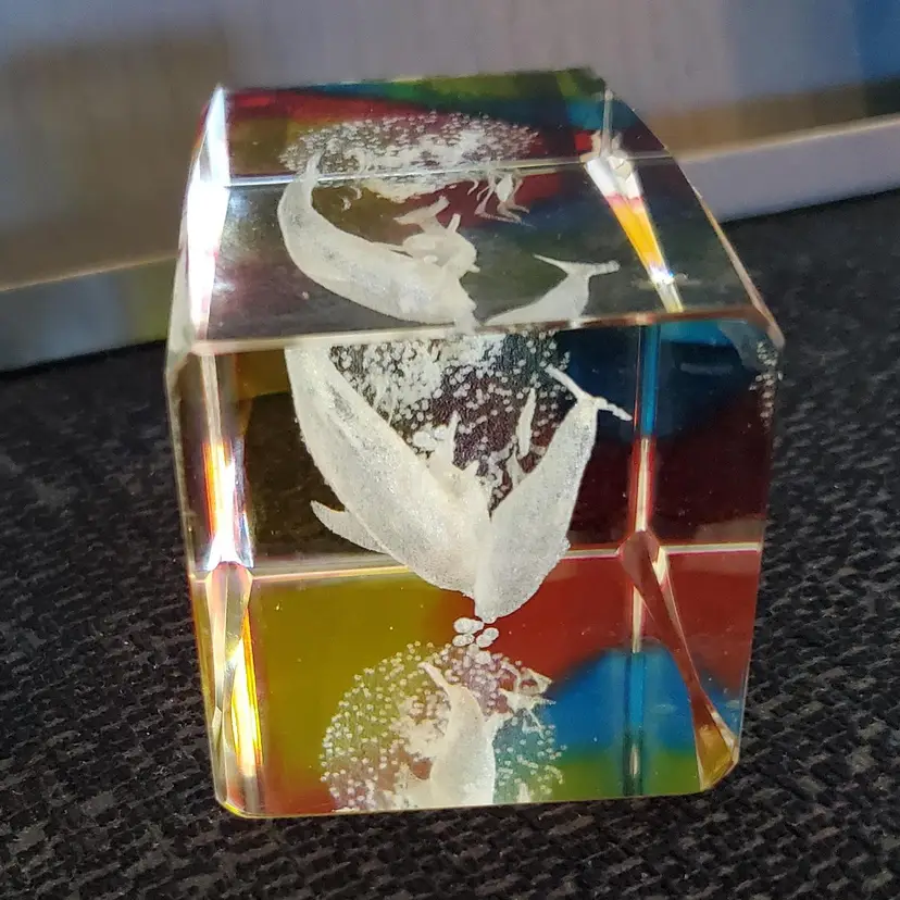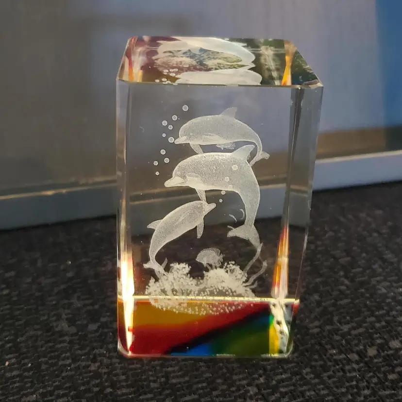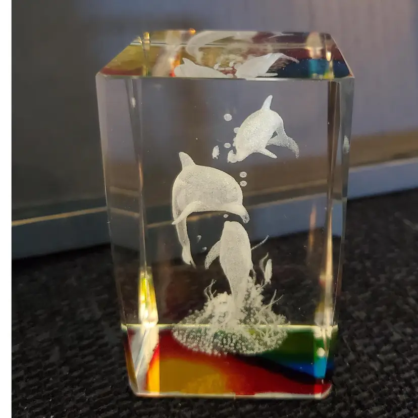 Beautiful heavy etched paper weight featuring dolphins playing above yellow, blue, and red colored glass. No chips cracks or repairs. One tiny scratch on the bottom. 3 " high by 2 " wide and deep. Very nice paper weight.