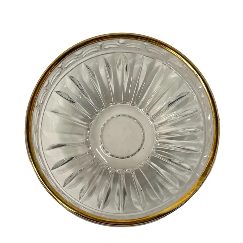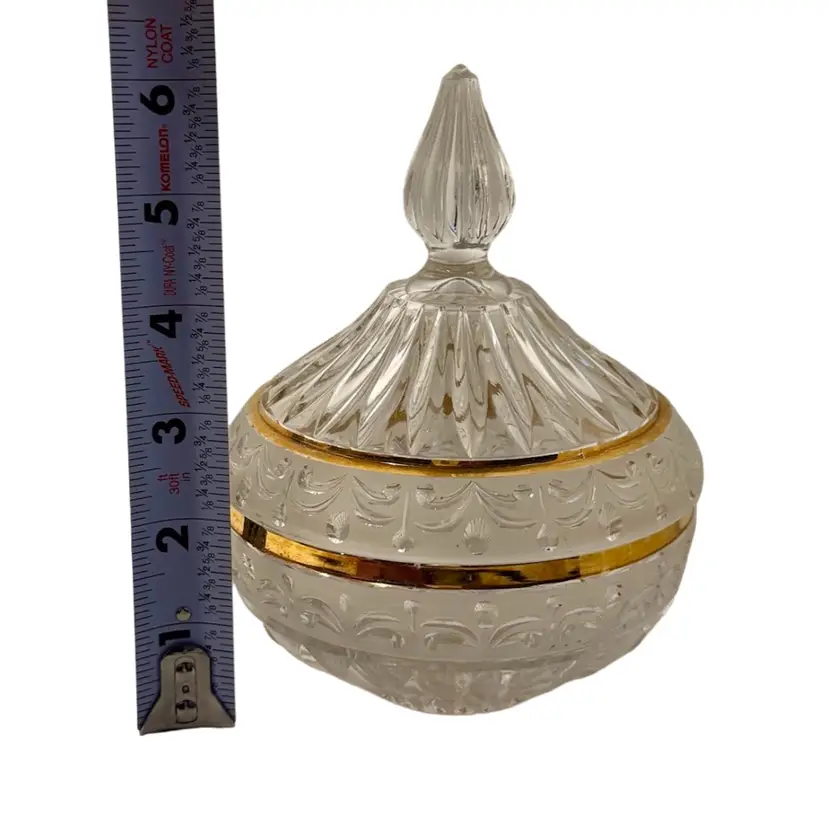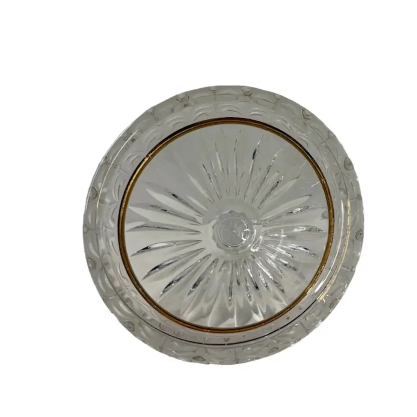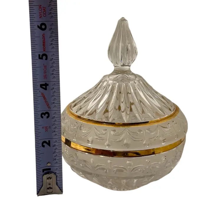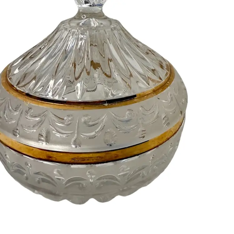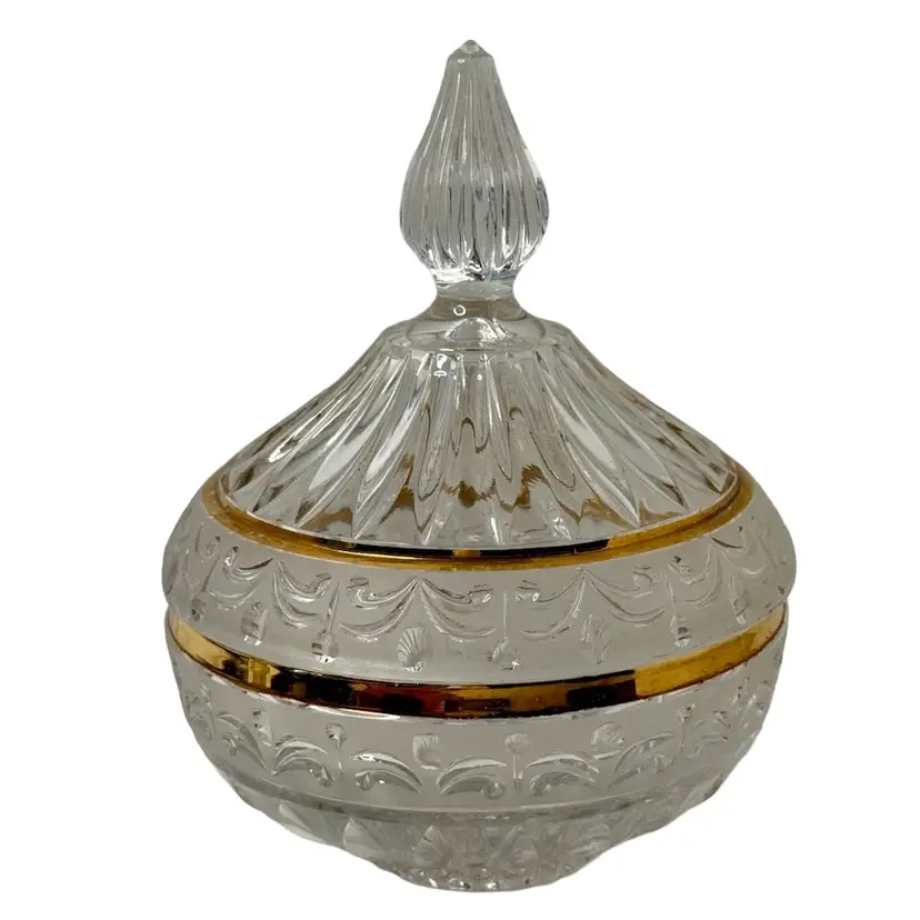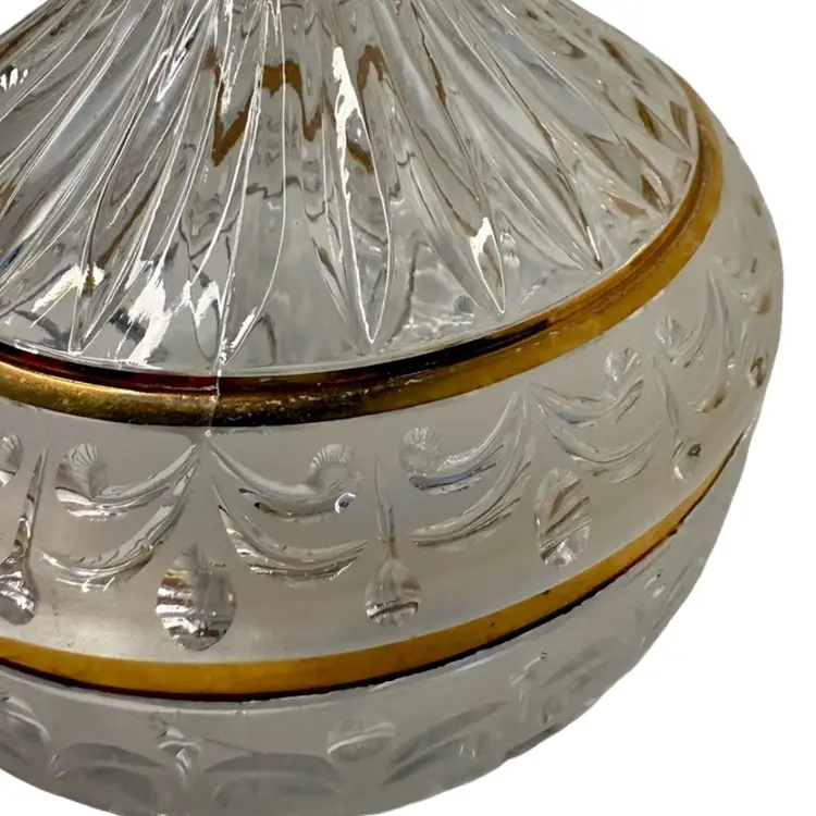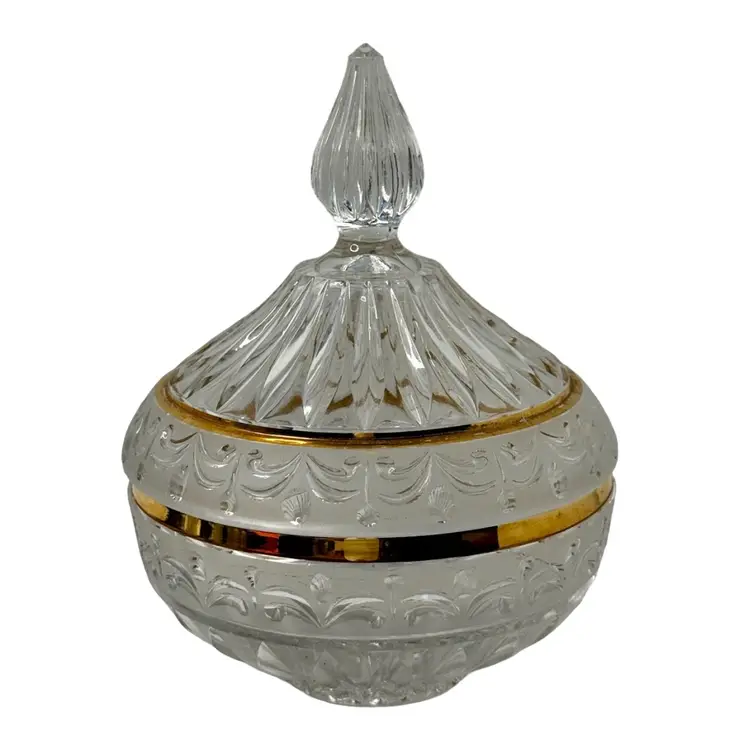Crystal d’ Adriana Candy Dish with Lid Satin Cut Center Band with Gold Trim, Finial handle.