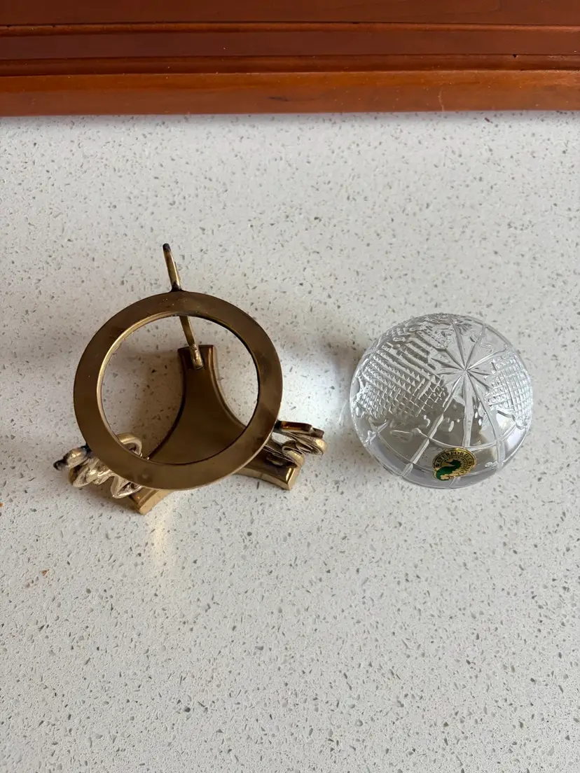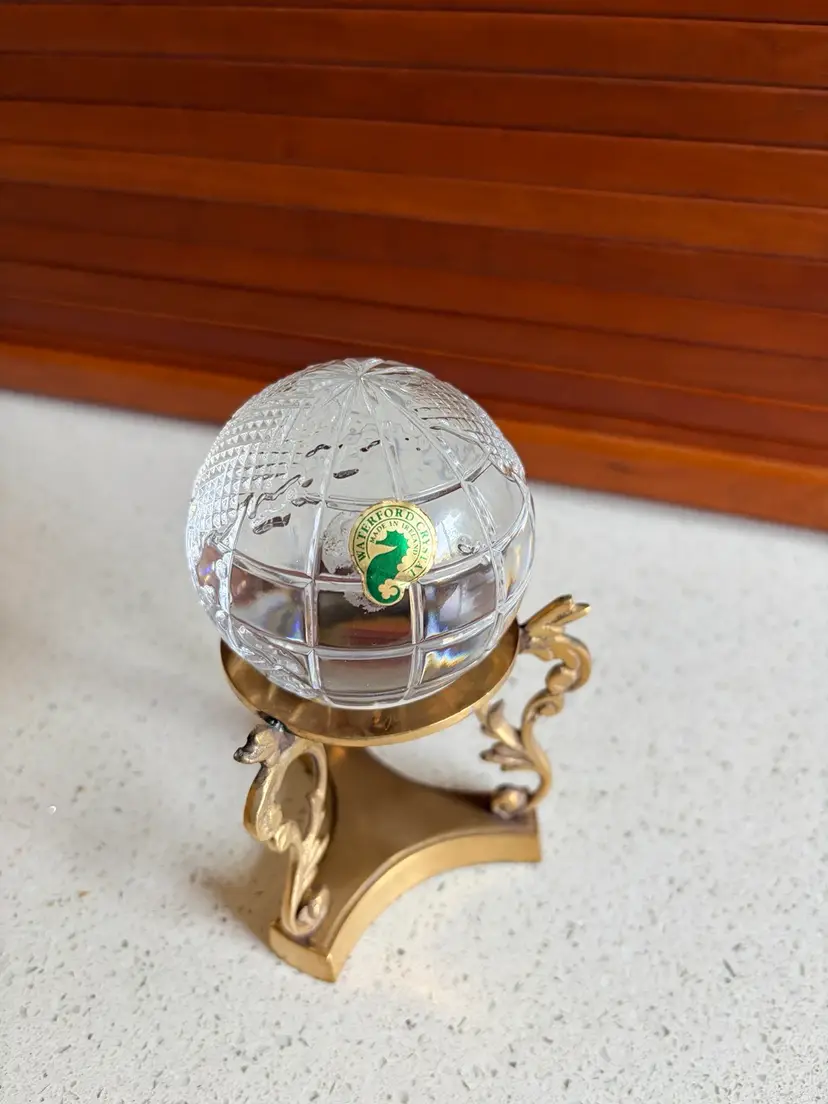 Crystal globe with world map etched on a heavy ornate brass stand.