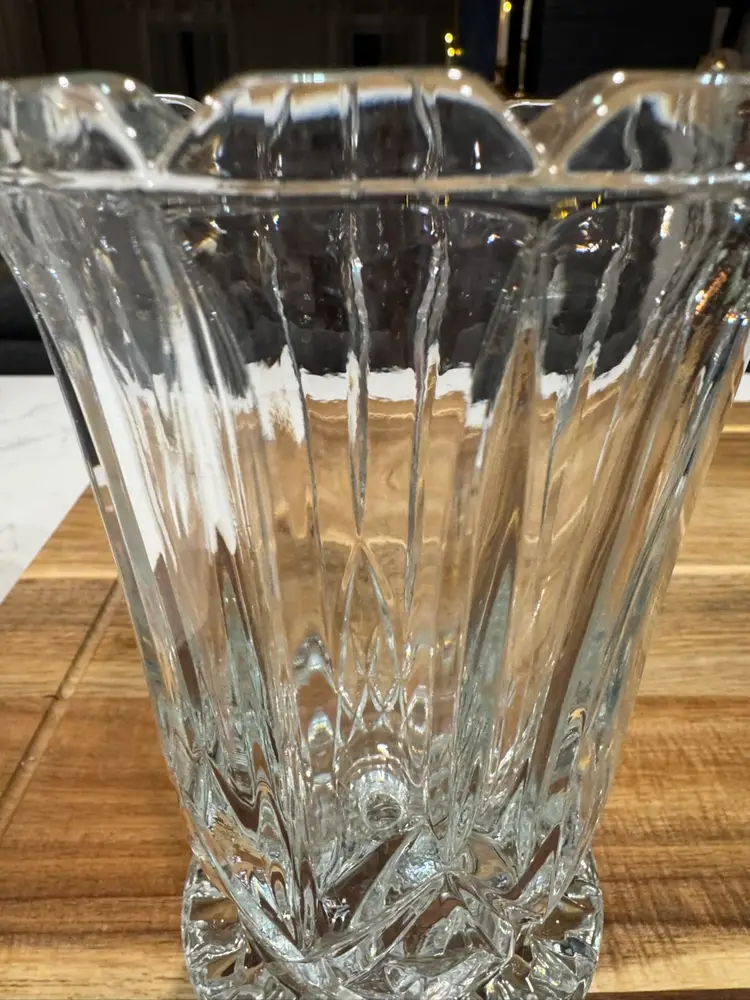 Vintage crystal hurricane with fluted body and diamond accents. Mid century European