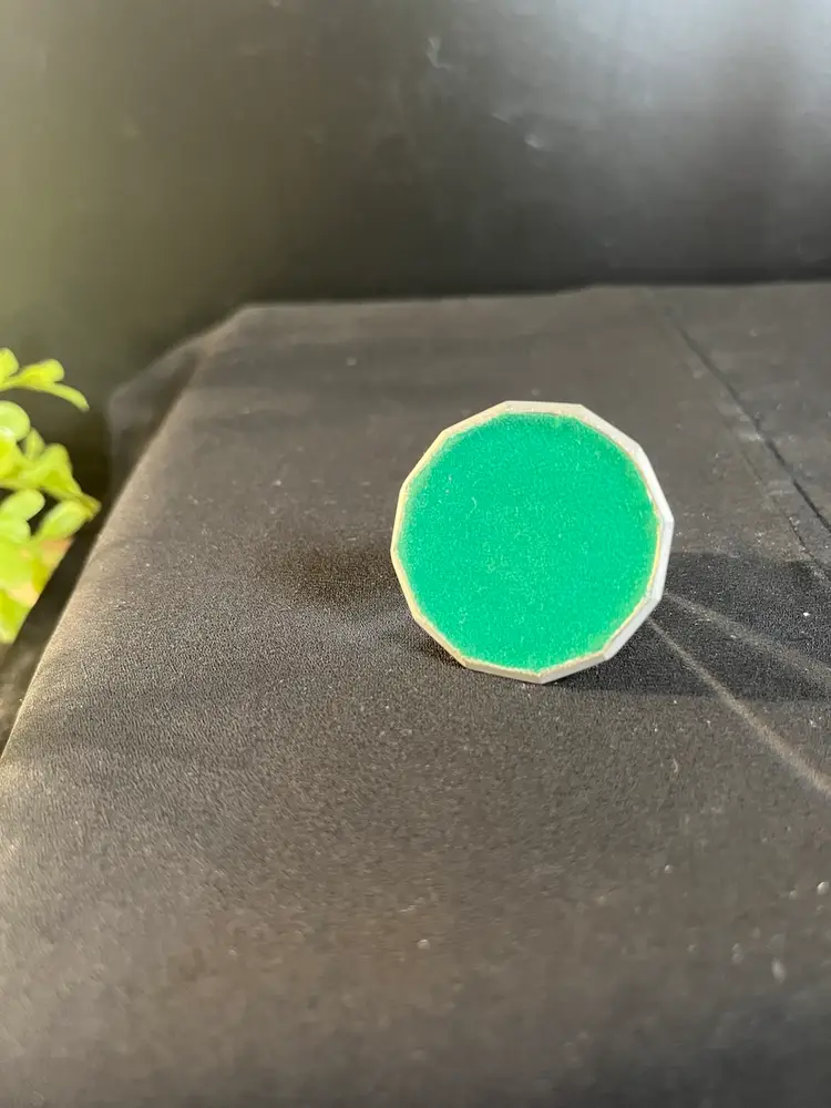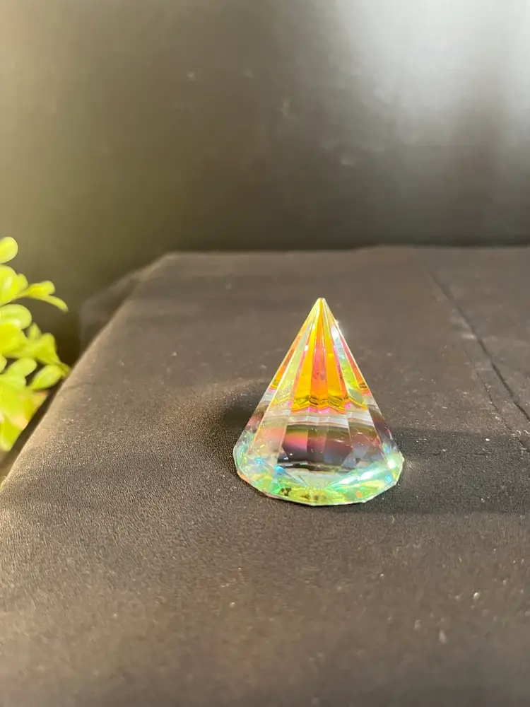 I have been unable to find a makers mark. These were produced in different heights-this one is 1 3/4"H. It absolutely shines in the sunlight and the colored reflections it throws is total awesomeness. Green felt covers the bottom of the base. This is in excellent condition and has NO call outs. It measures approx 1.75"H, 1.5" diameter at base, 1.2 Oz. It is not UV reactive. Rectangular press glass riser is NOT included.