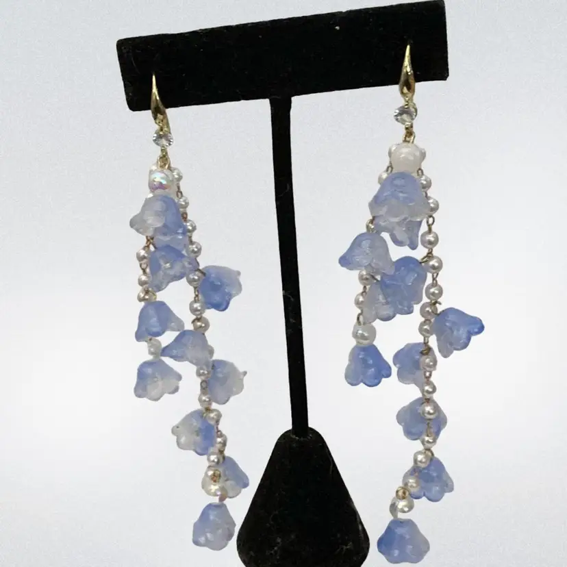 Beautiful 925 blue flower crystal / opalescent faux pearl cascading shoulder duster earrings 4.8 inch long