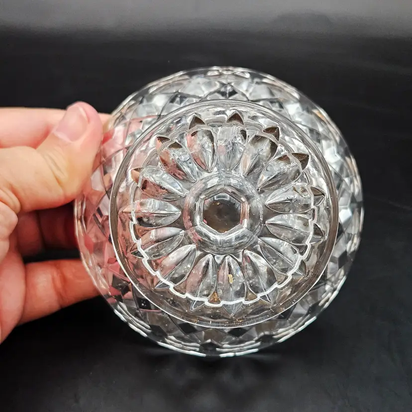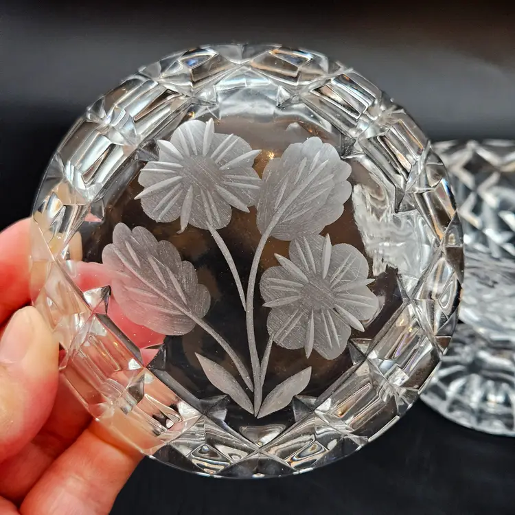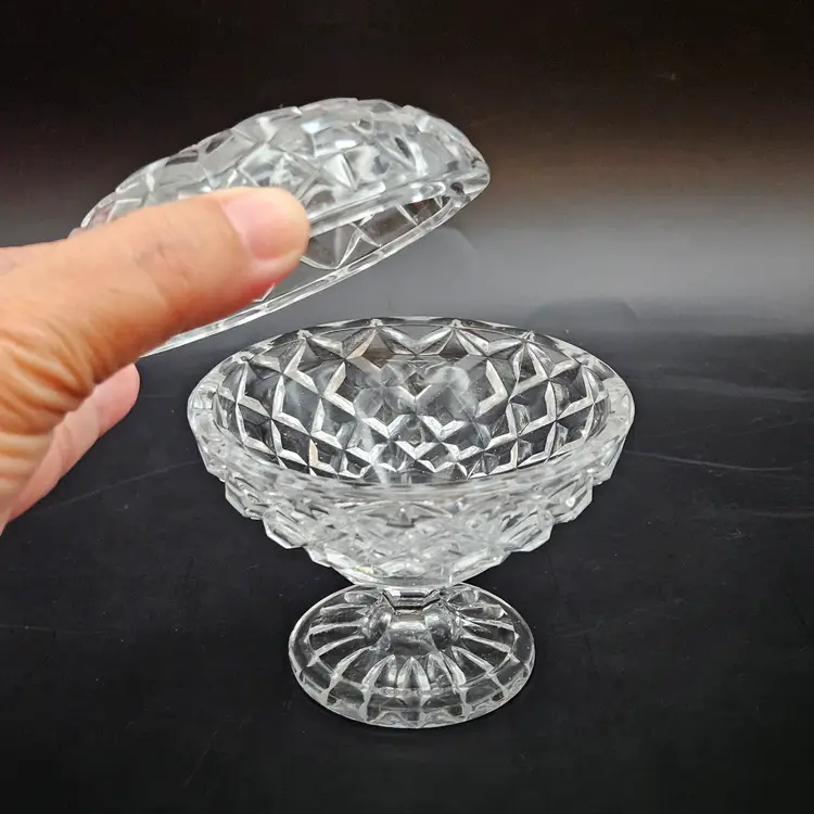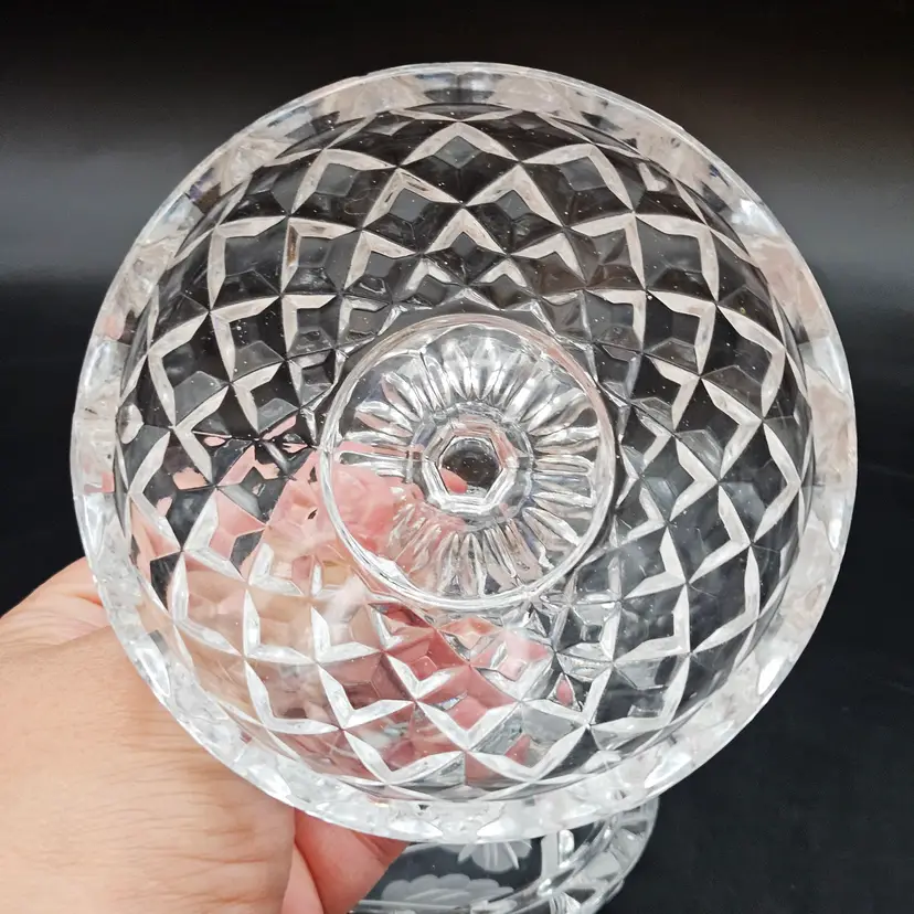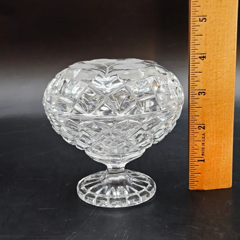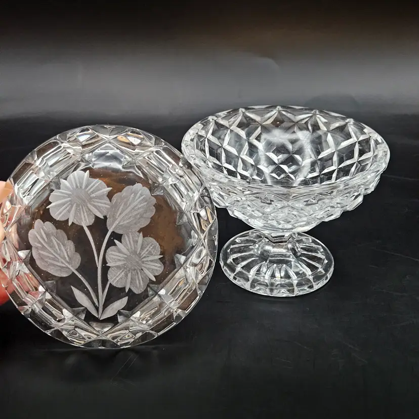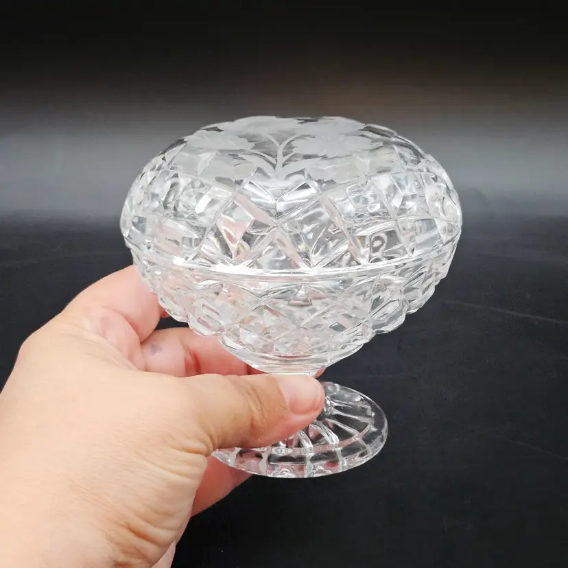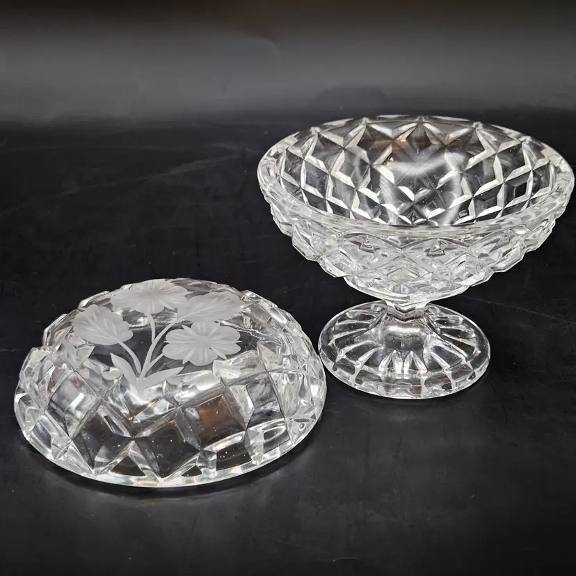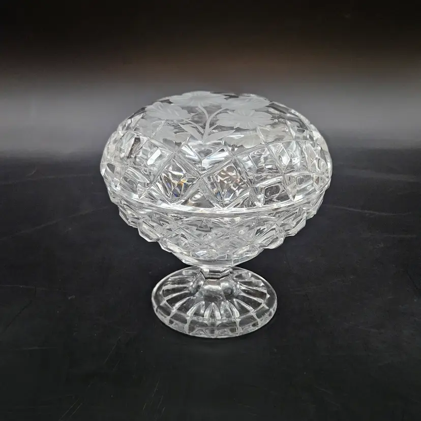 Material: Leaded cut glass/crystal Style: Pedestal compote with lid Design: Crosshatch/diamond cuts plus etched floral motif