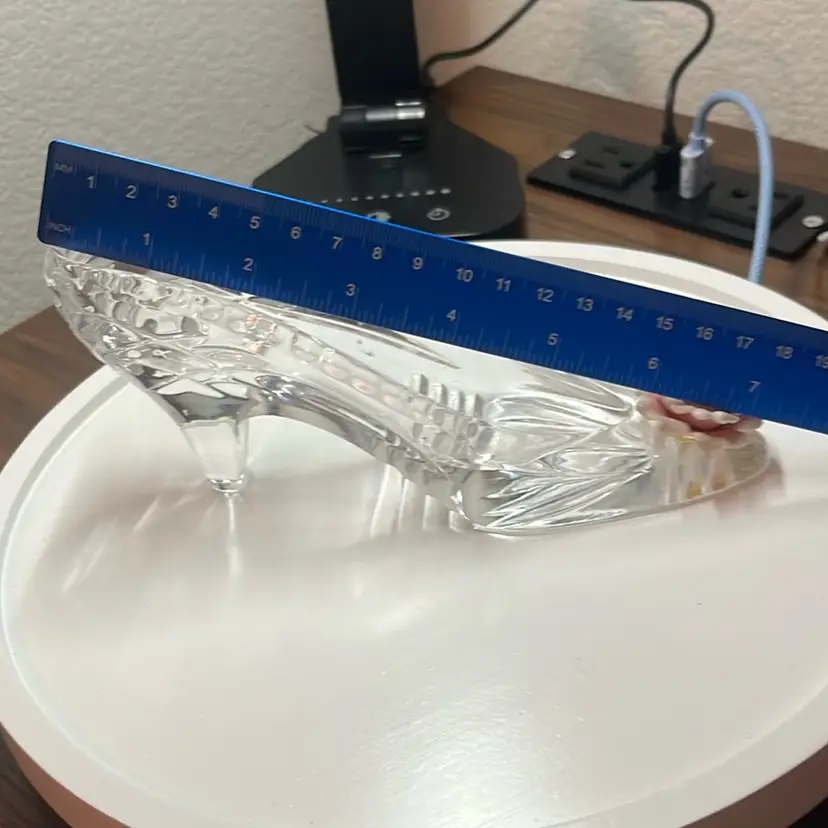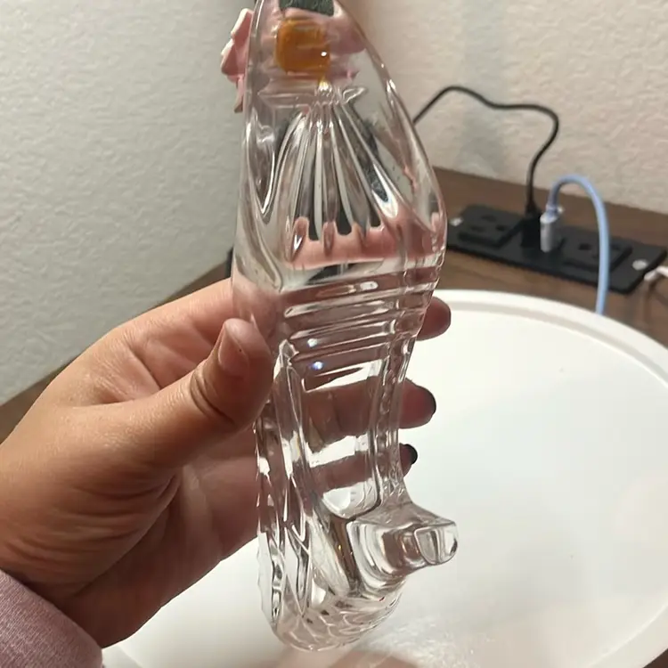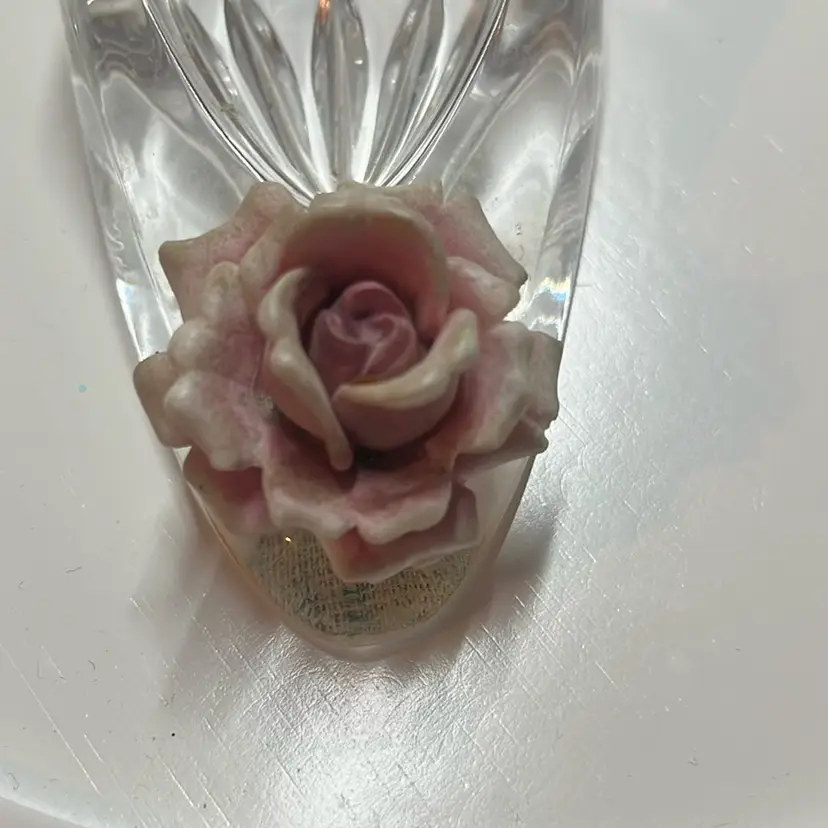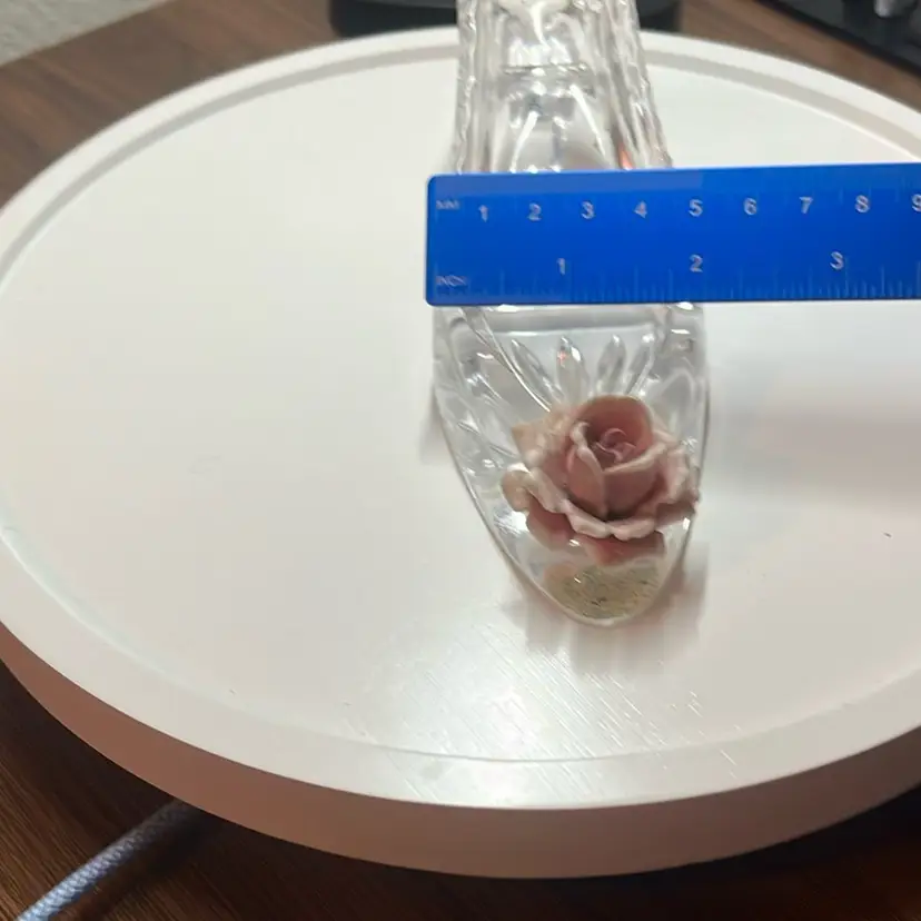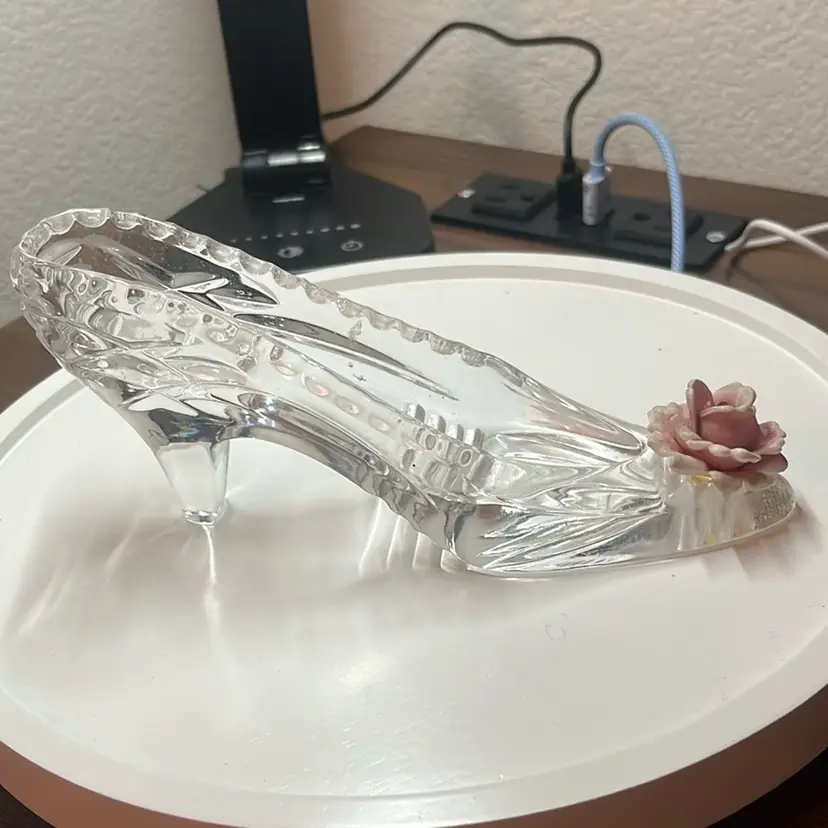 Crystal glass shoe with porcelain rose on the bottom that glows. No chips or cracks not even on the petals!
