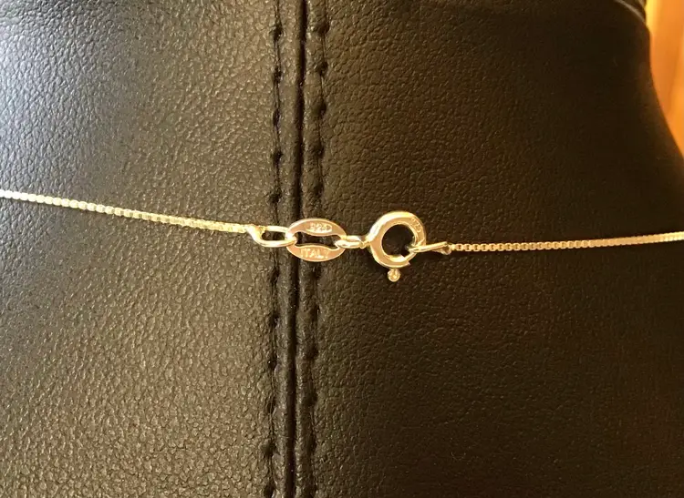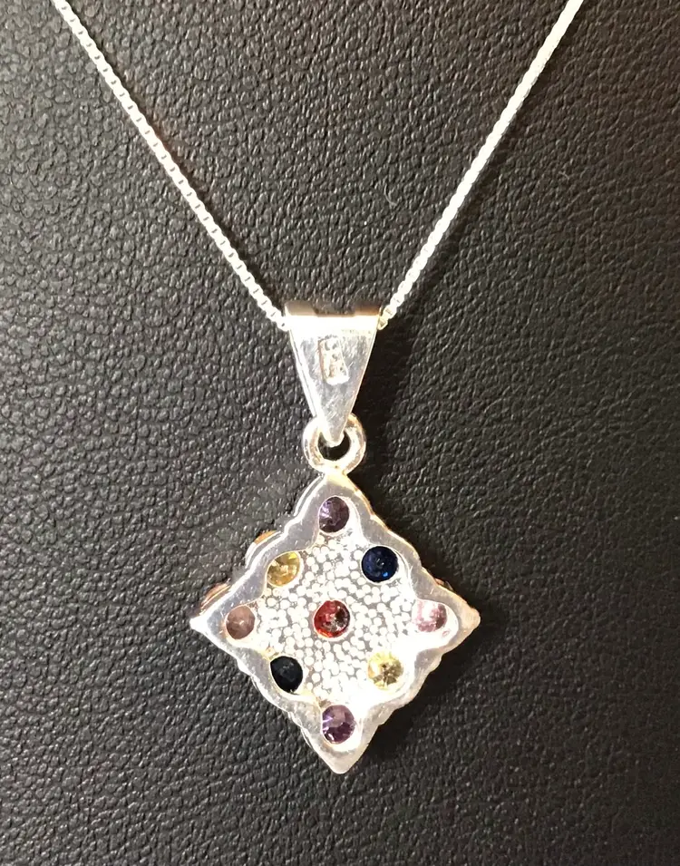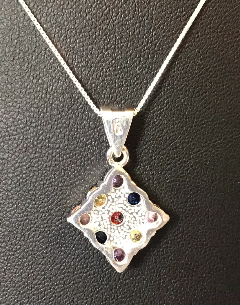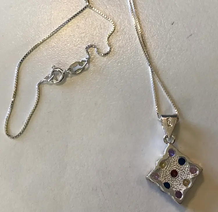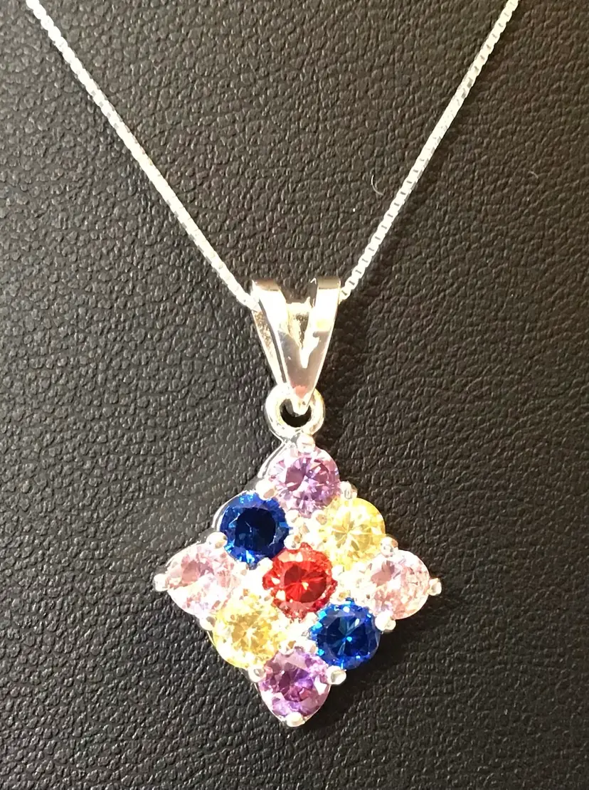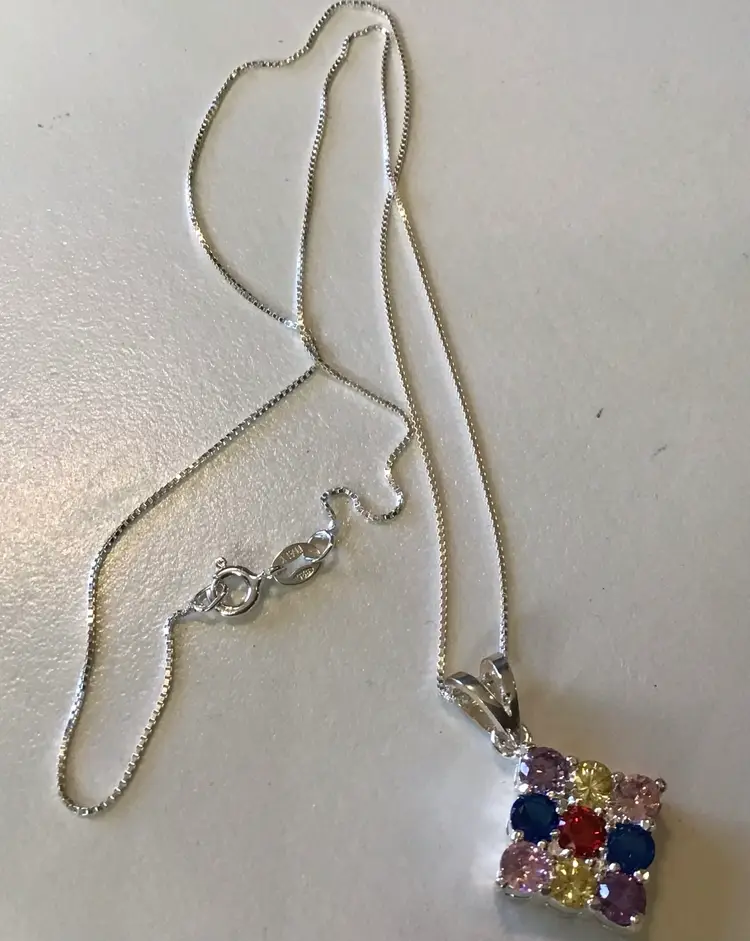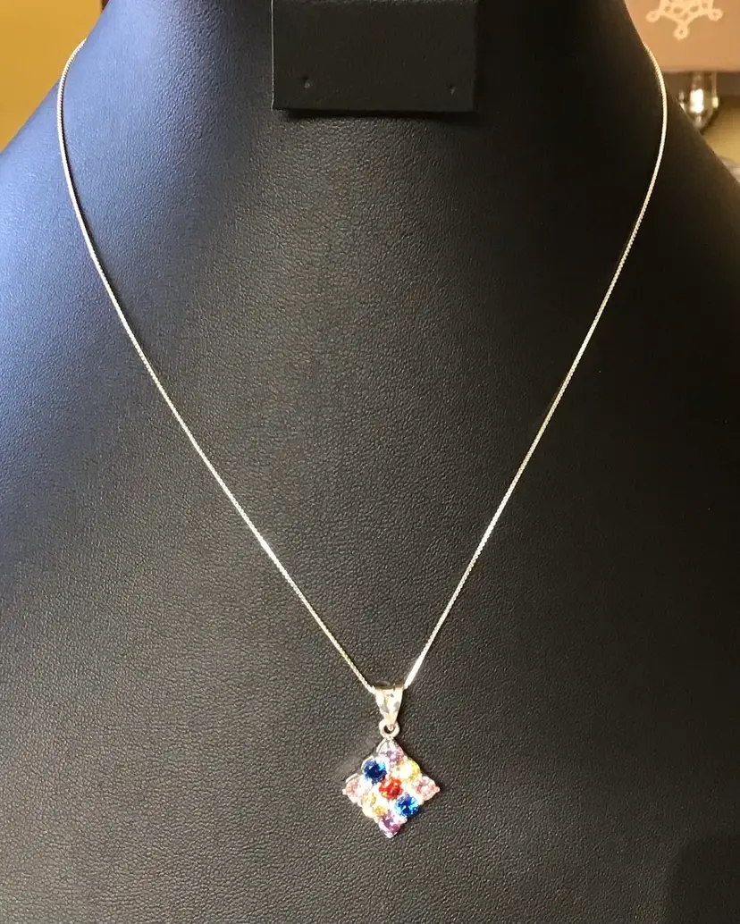 Multi color crystals in square setting pendant on 18” 925 Italy box chain. #658