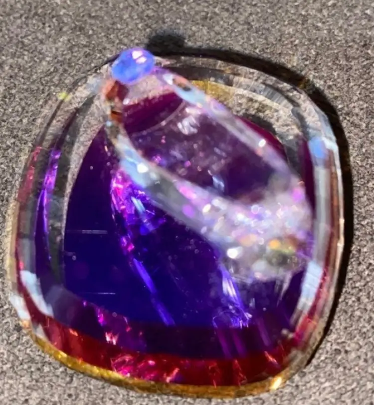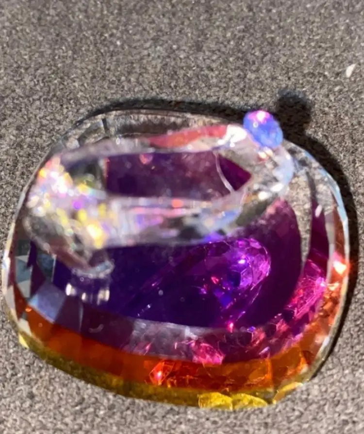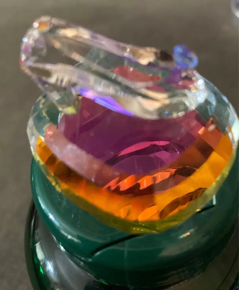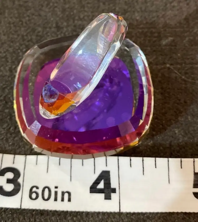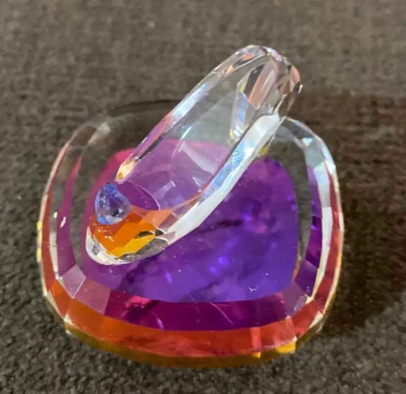 Crystal World Cinderella Glass Slipper Figurine 5226/9750 1.5” diameter . It is engraved Disney on one side and Crystal World 5226/9750 on the other side. Engravings don’t show in picture as they are very lightly engraved. Color changes with the angle and light.