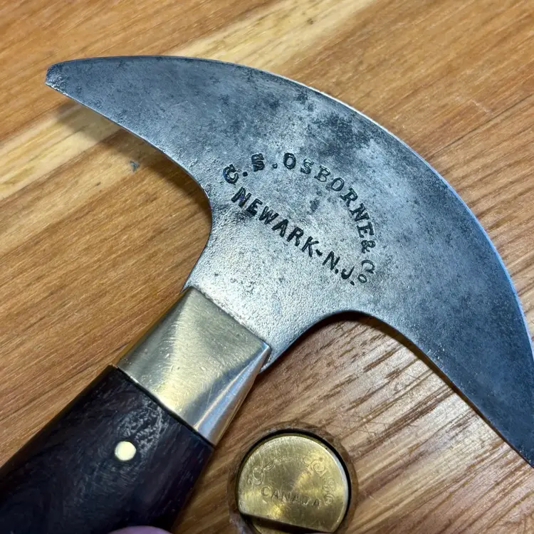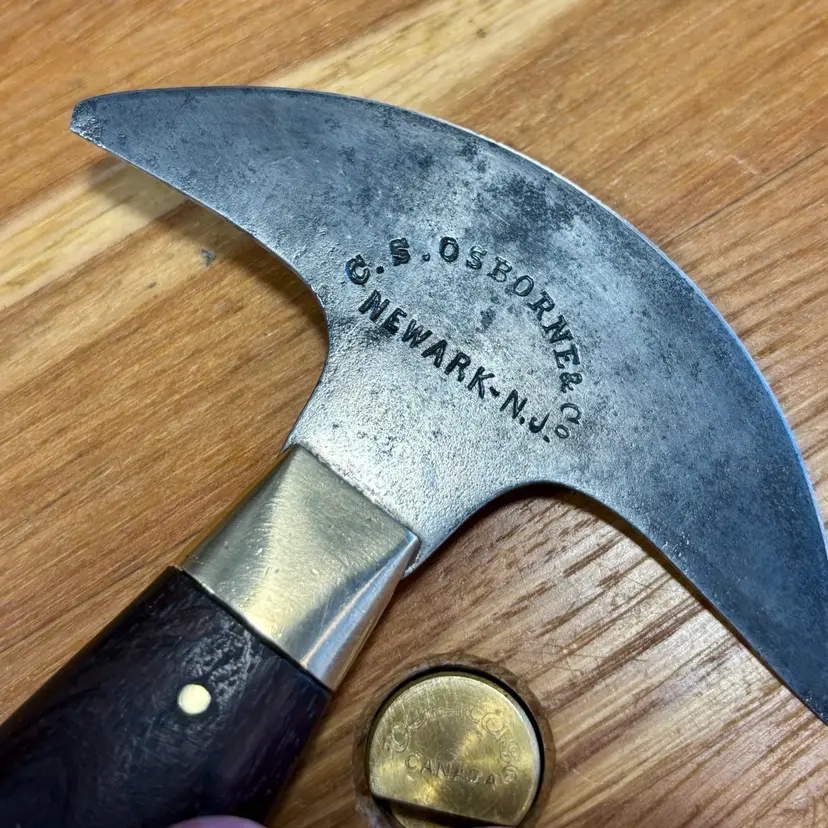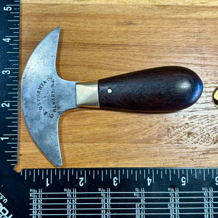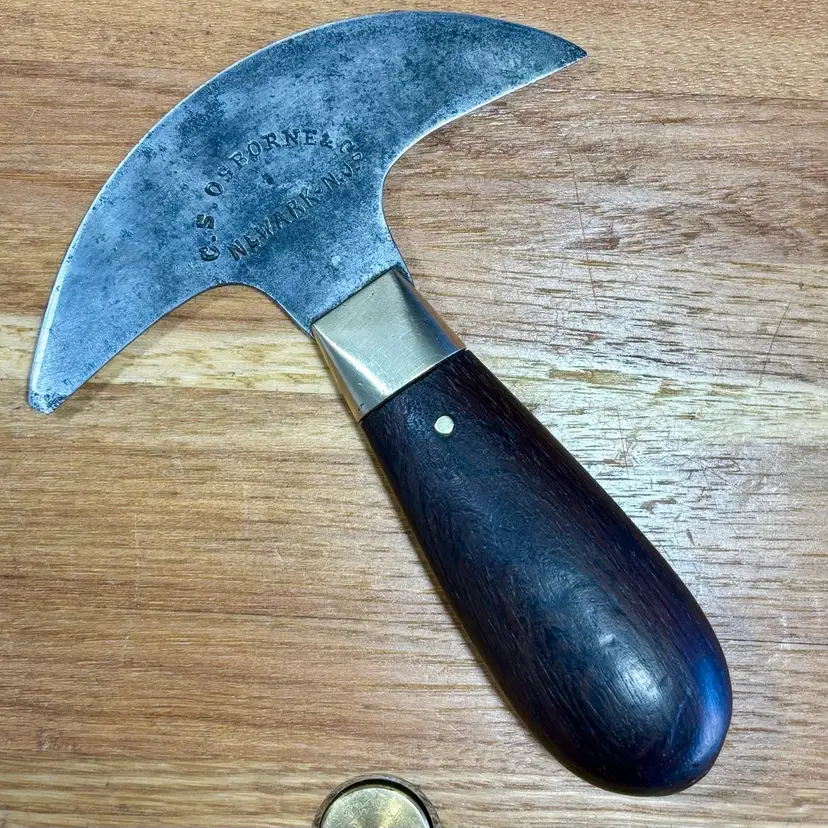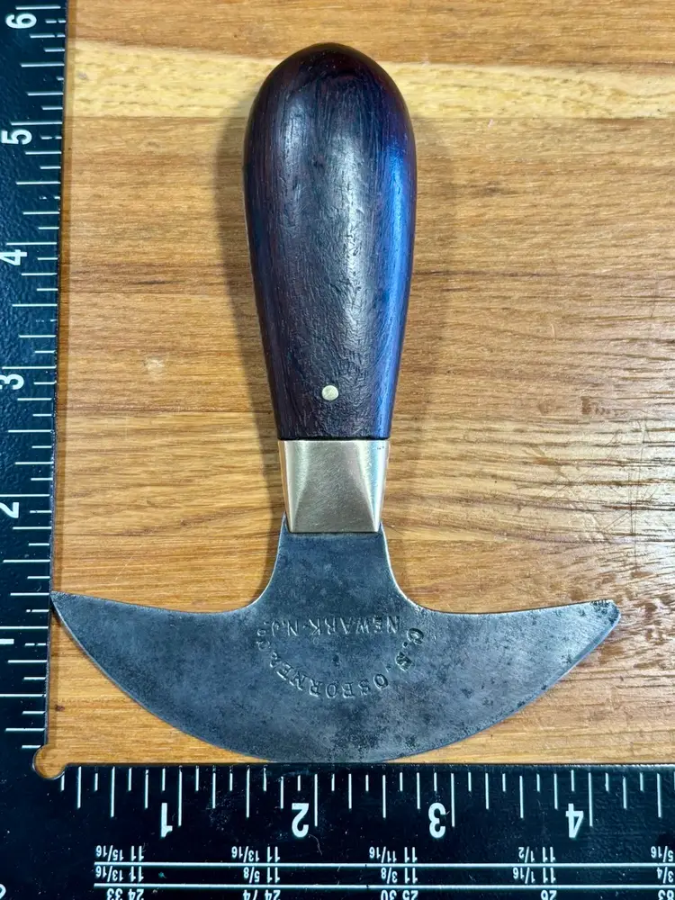 Antique C.S. Osborne Leather working half-moon head knife with really nice brass pinned rosewood handle. The blade has some minor staining/pitting from past rust and one corner has been broken off at some point. The handle is solidly fixed to the blade with no movement, but there is a slight gap between the rosewood and brass ferrule (See pictures). The trademark is deep and highly visible, reading "C.S. Osborne & Co. Newark-N.J.". The reverse side has a deep stamp "EST-D 1826" with a scalloped border. The blade is sharp and cuts well. See pictures for details. Let me know if you have any questions.