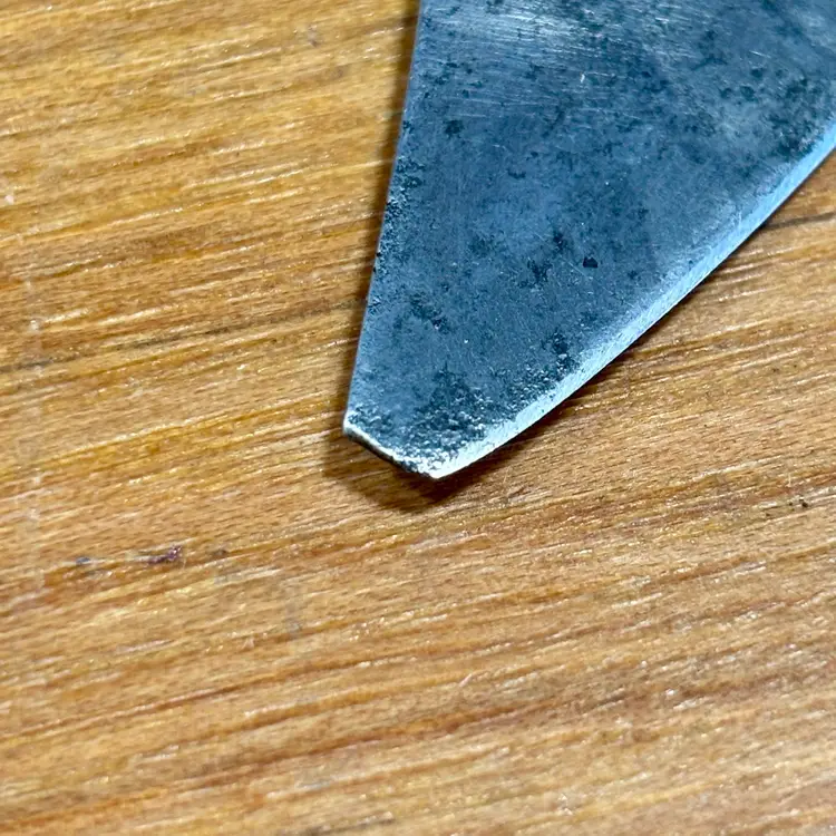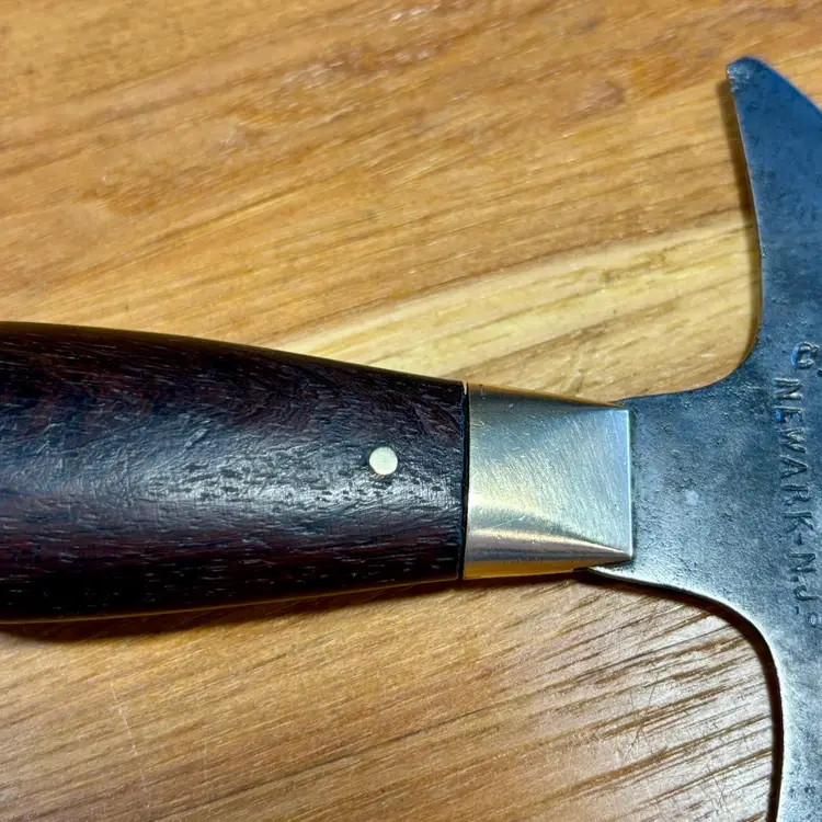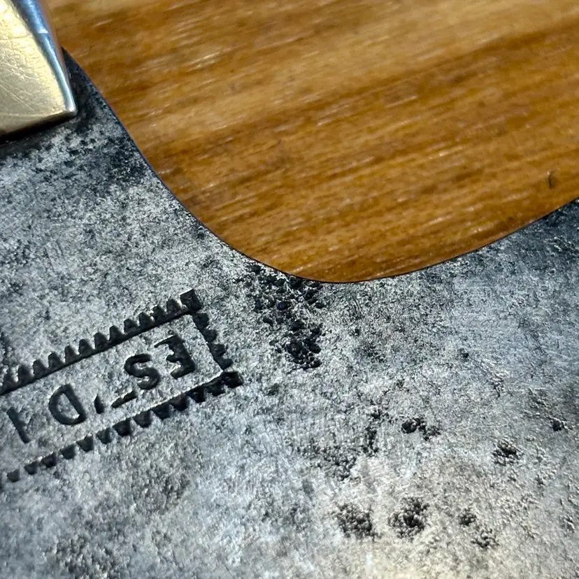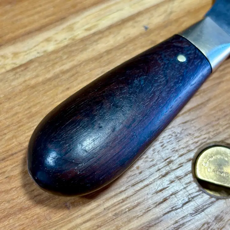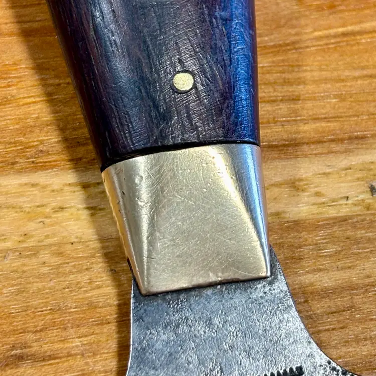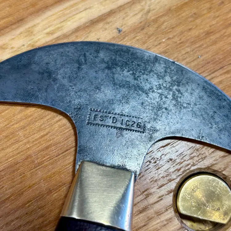 Antique C.S. Osborne Leather working half-moon head knife with really nice brass pinned rosewood handle. The blade has some minor staining/pitting from past rust and one corner has been broken off at some point. The handle is solidly fixed to the blade with no movement, but there is a slight gap between the rosewood and brass ferrule (See pictures). The trademark is deep and highly visible, reading "C.S. Osborne & Co. Newark-N.J.". The reverse side has a deep stamp "EST-D 1826" with a scalloped border. The blade is sharp and cuts well. See pictures for details. Let me know if you have any questions.