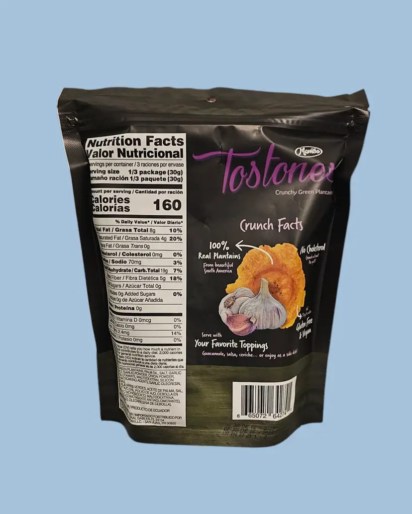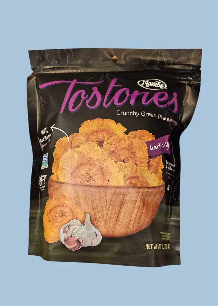 Add this Cuban favorite snack to your pantry and enjoy the bold, satisfying crunch of Mambo Tostones! Made from 100% green plantains and lightly seasoned with garlic, these twice-fried chips are a deliciously crispy, authentic treat. Gluten-free, cholesterol-free, and free of artificial ingredients, they’re perfect for guilt-free snacking or pairing with your favorite dips.