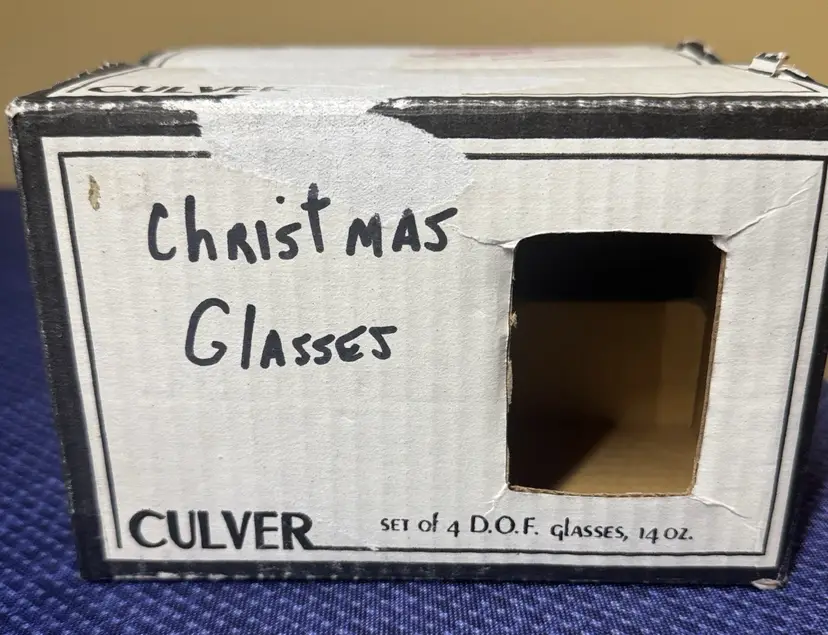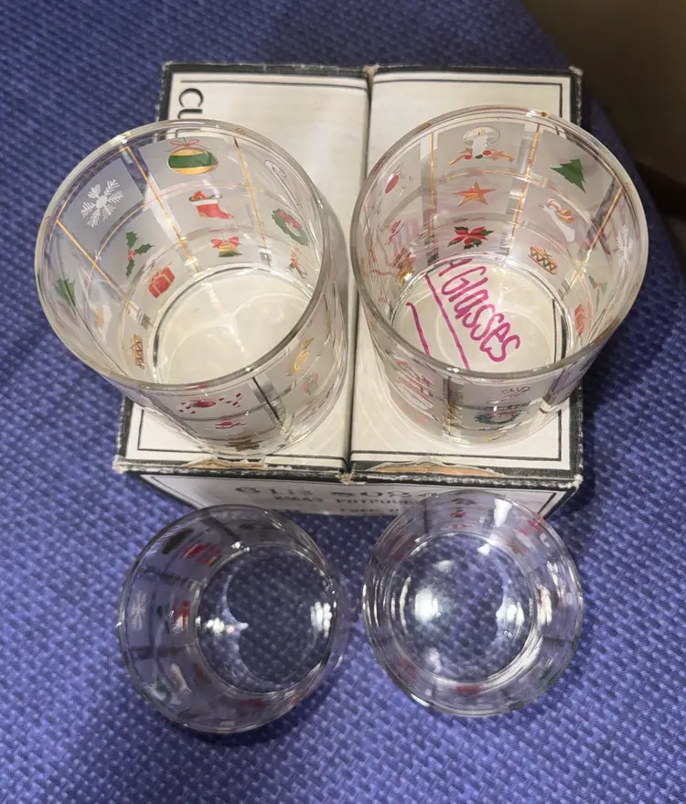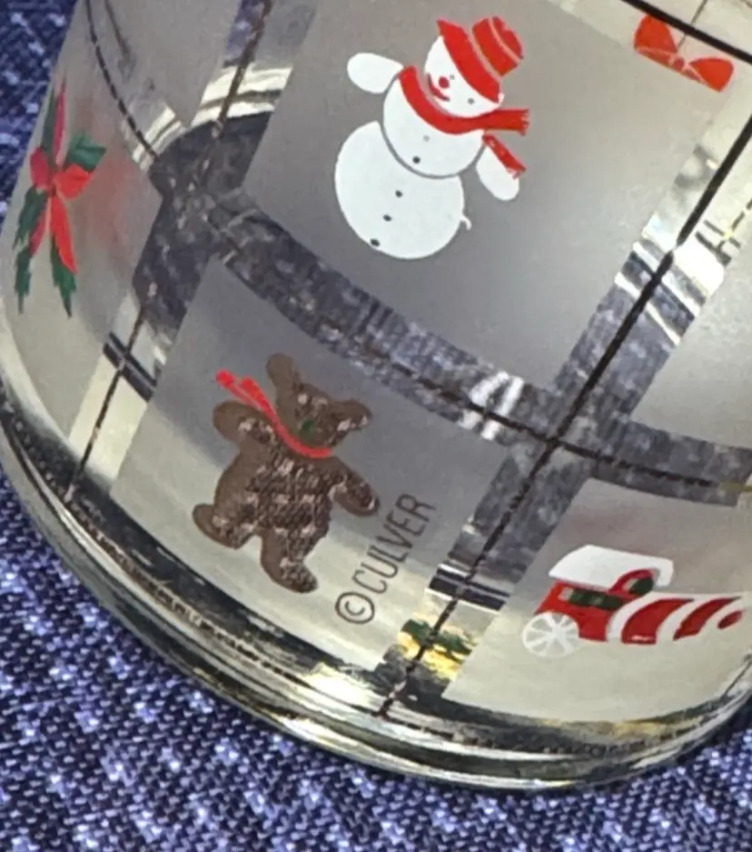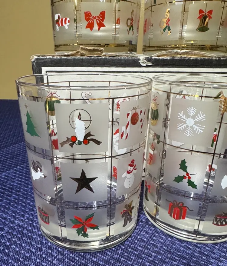 -Culver Industries -Christmas Potpourri Pattern -Double Old Fashioned Glasses -Made in the 1990s -4 1/8 inches tall -3 1/4 inches diameter -Hold 14 Fluid Ounces -come in original box -excellent condition No Chips, Cracks or Flea Bites -Sold as a Set of Four (12701112257)