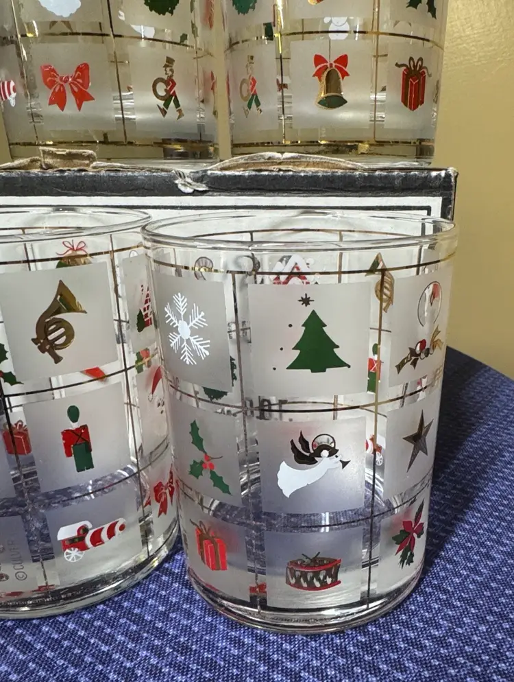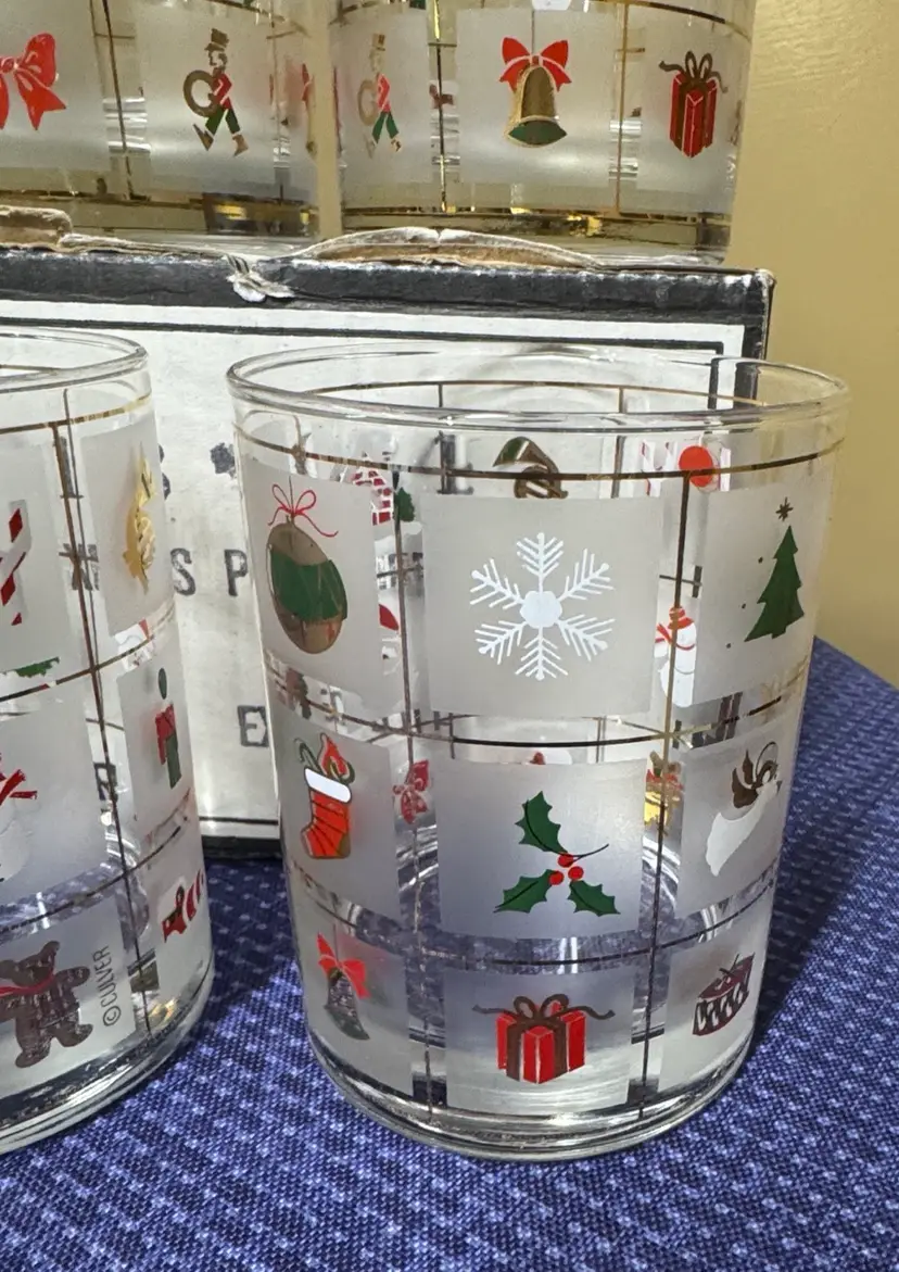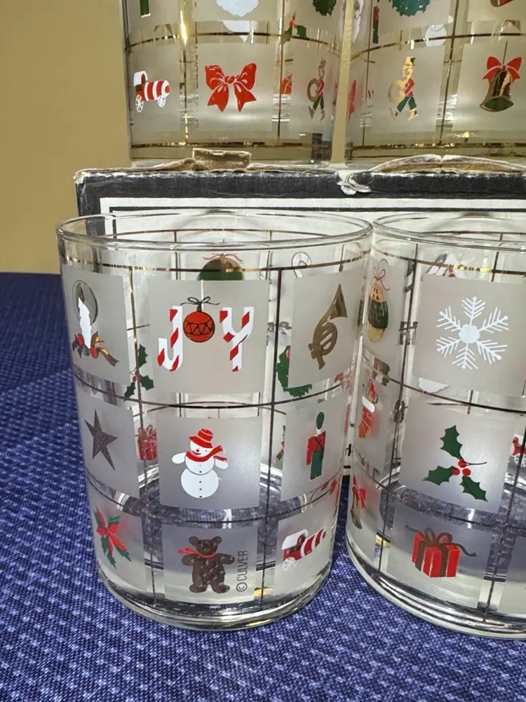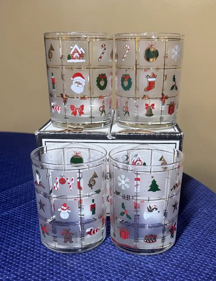 Set of four festive holiday glasses with Christmas-themed designs. Perfect for holiday gatherings. Fun set of four Culver Christmas Potpourri double old fashioned glasses. These glasses feature red, green, white and 22 kt gold decorations. They hold 14 fluid ounces and are perfect for a Christmas gathering. A festive gift as well.