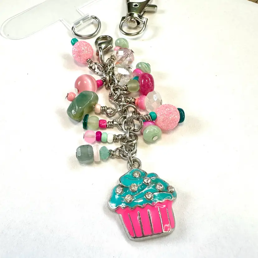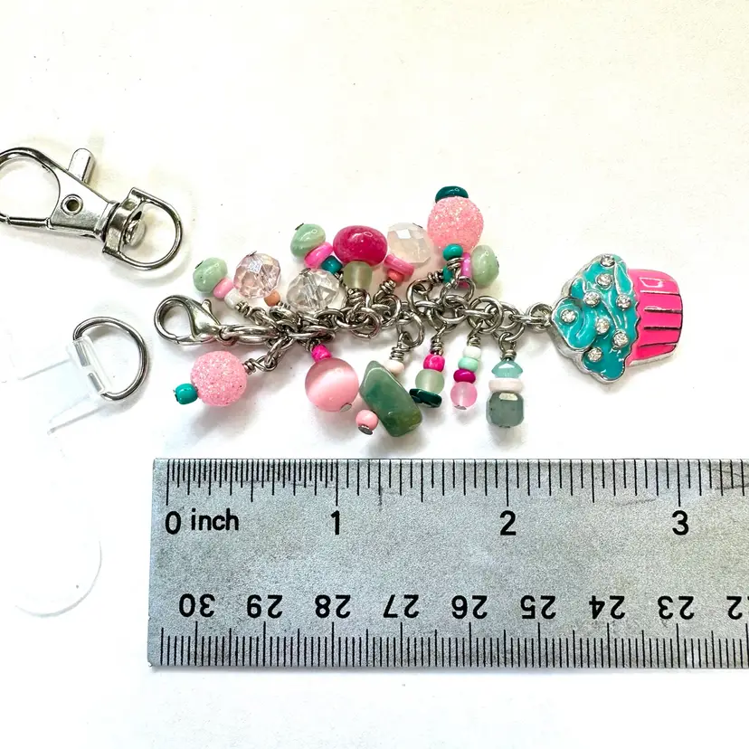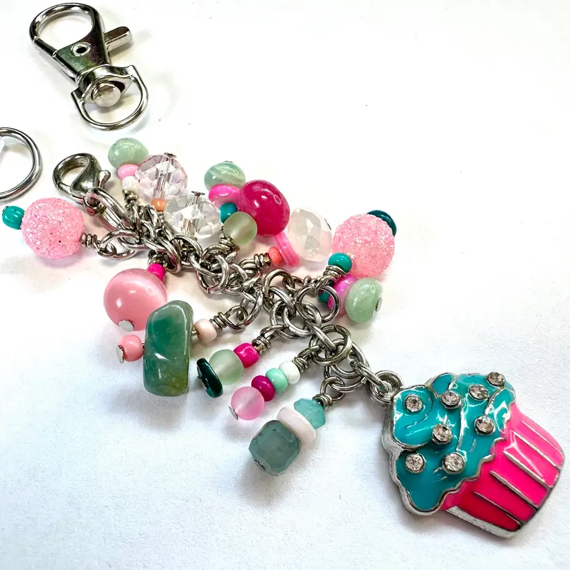 Features a silver tone, enameled cupcake charm with rhinestones and other various shades of blue, pink, and green beads made of glass, stone, and acrylic Silver tone findings Cell phone charm holder which fits between the phone and the case included Also includes a swivel hook for optional use as a purse charm Lobster clasp allows for quick and easy removal when needed without removing case Made by me with repurposed jewelry pieces