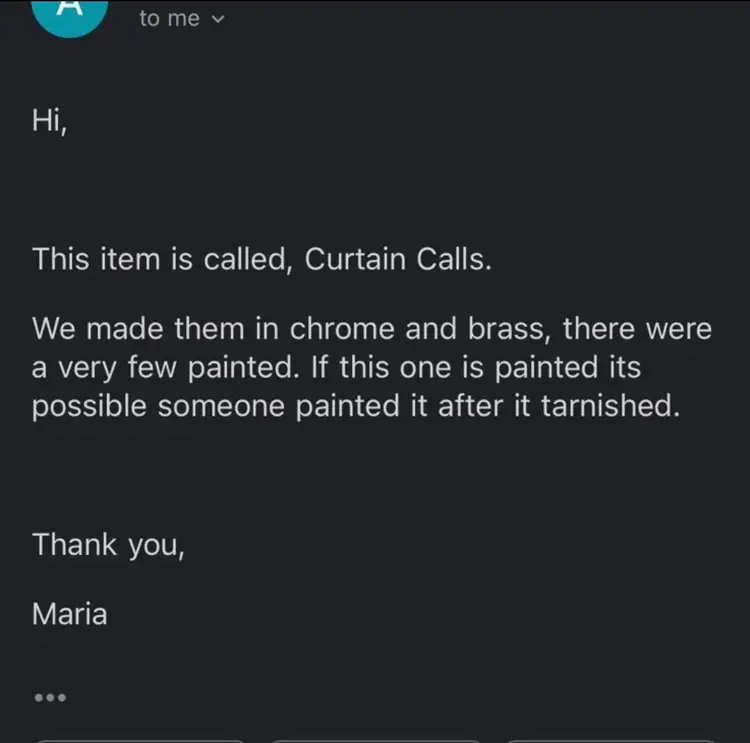 Curtis Jere curtain call sculpture 1983. Can not find a signature on the piece. Has a matte finish. I have taken a picture of what the damage looks like. Some of the bottoms are bent. 2 pieces have bends on them If you need more pictures just ask.