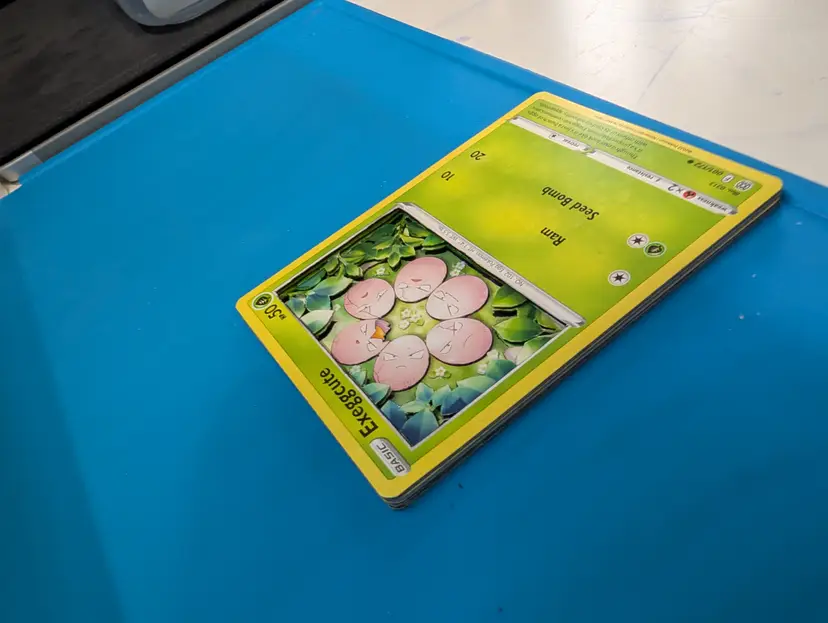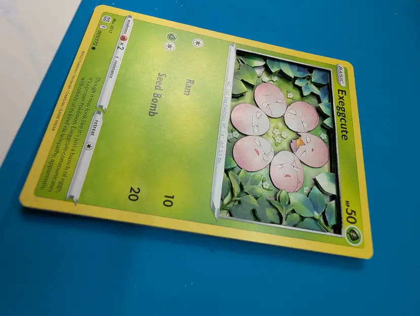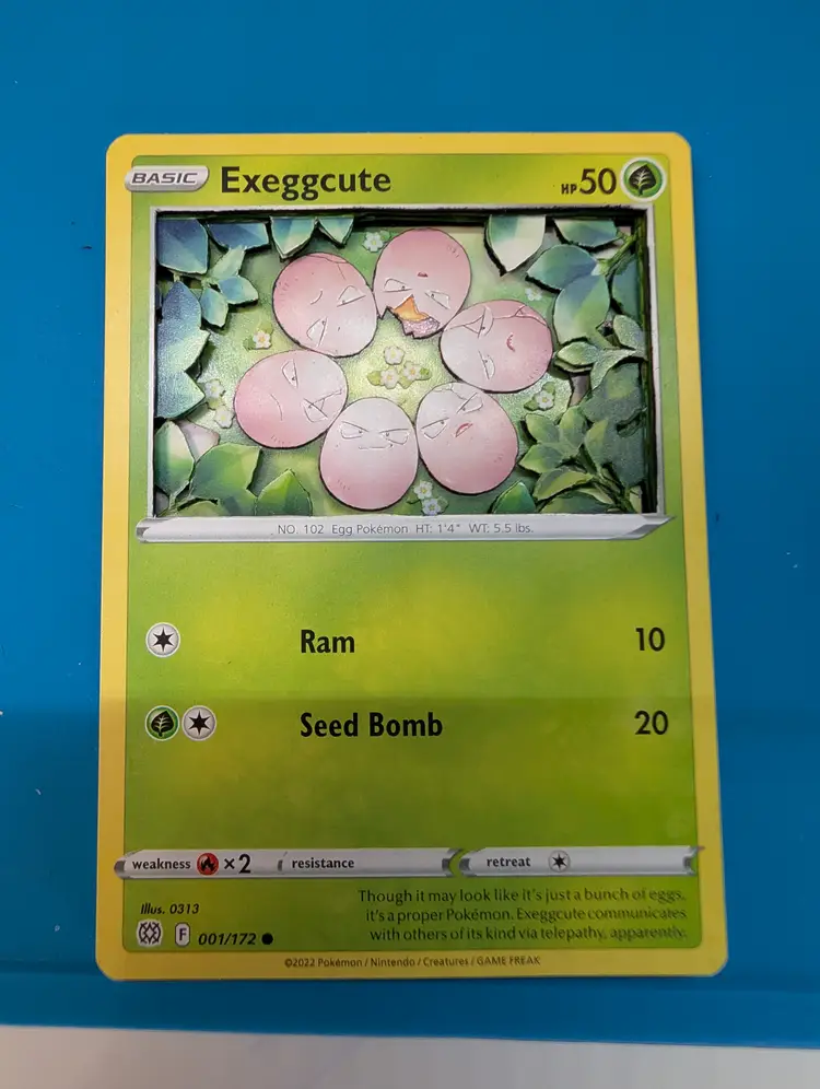 Hand cut 3d Pokemon card featuring Exeggcute.