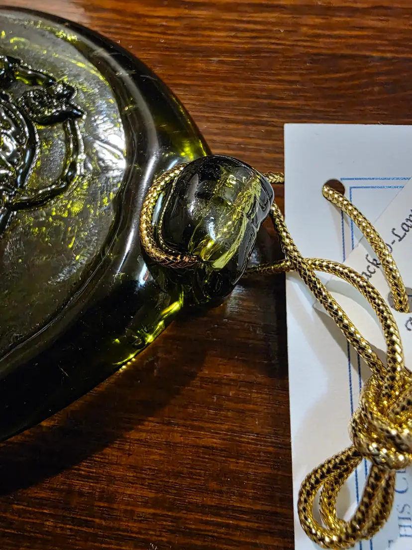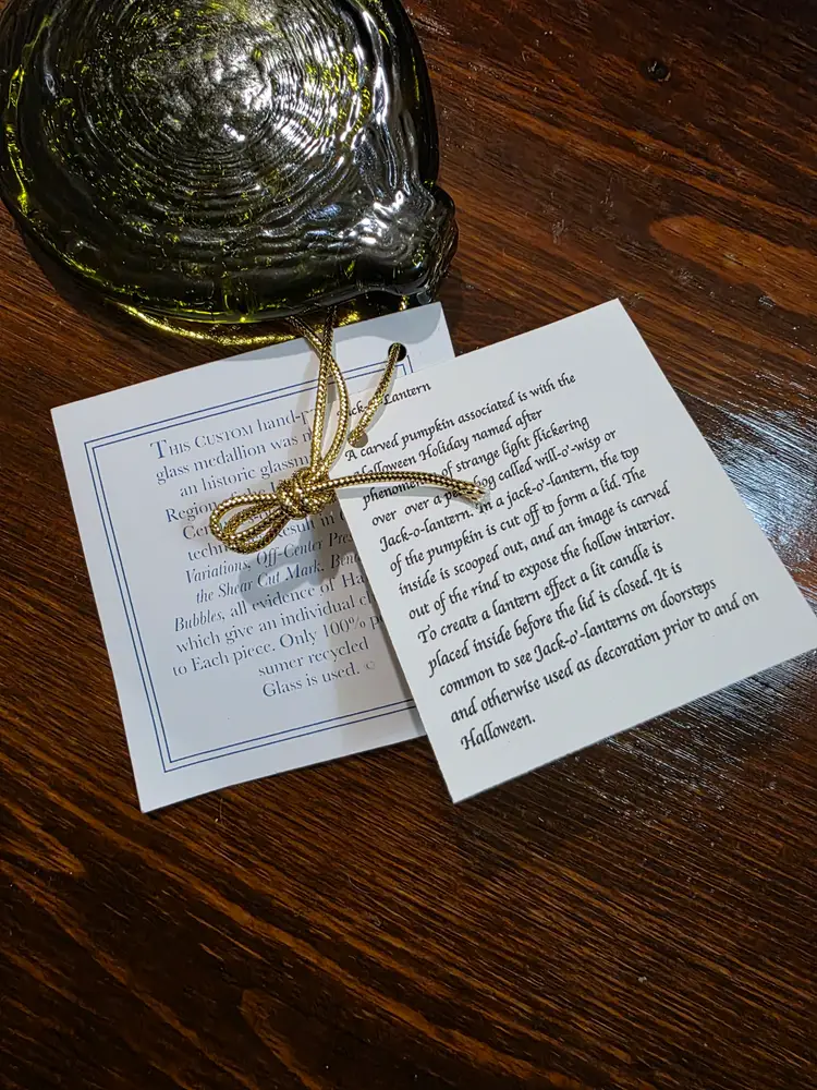 Custom Hand Pressed Green Glass Salem Jack-o-lantern Ornament. Piece is in excellent condition with no chips or cracks and comes with original tags. Ornament is approximately 3 inches round diameter and 1/4 inch in thickness. Piece is Green in color and has a Pressed Jack-o-lantern design in the Ornament with the town Salem written under it. Very nice looking collective piece great for the Halloween season or as a year round Ornament.