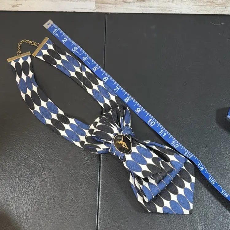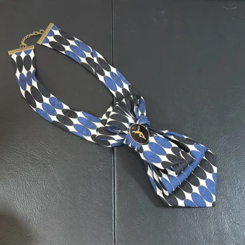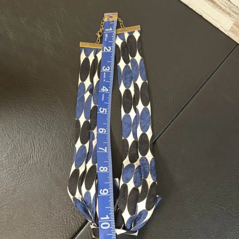 ✨ Item Details: • Handmade by me using upcycled men’s ties • Features a striking blue, black, and cream geometric print • Central detail includes a vintage gold-tone button accent • Adjustable chain closure for comfortable fit • Lightweight, soft, and easy to wear • Perfect as a statement piece for any outfit!