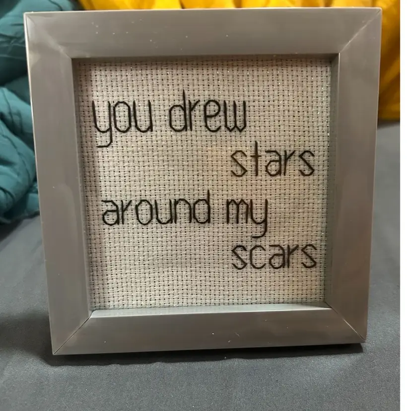 Mini lyric cross stitches! Perfect size to display anywhere! They are 4 inch by 4 inch. Frames available in grey, silver, turquoise, black, and gold. I would love to stitch any lyrics that make your heart glow. If it can’t fit in one, I can do two or more and will bundle them with 10% off 🫶