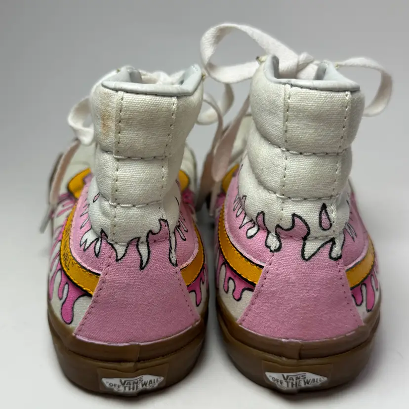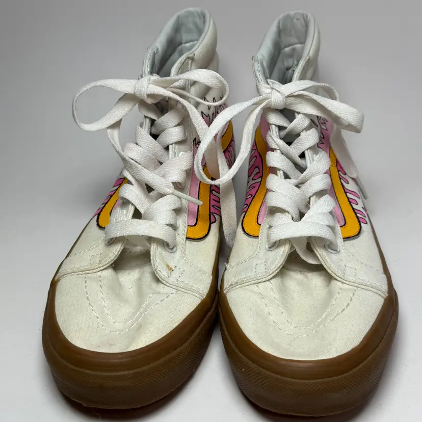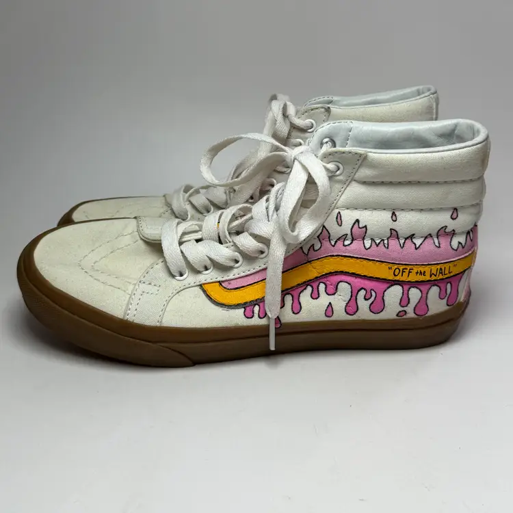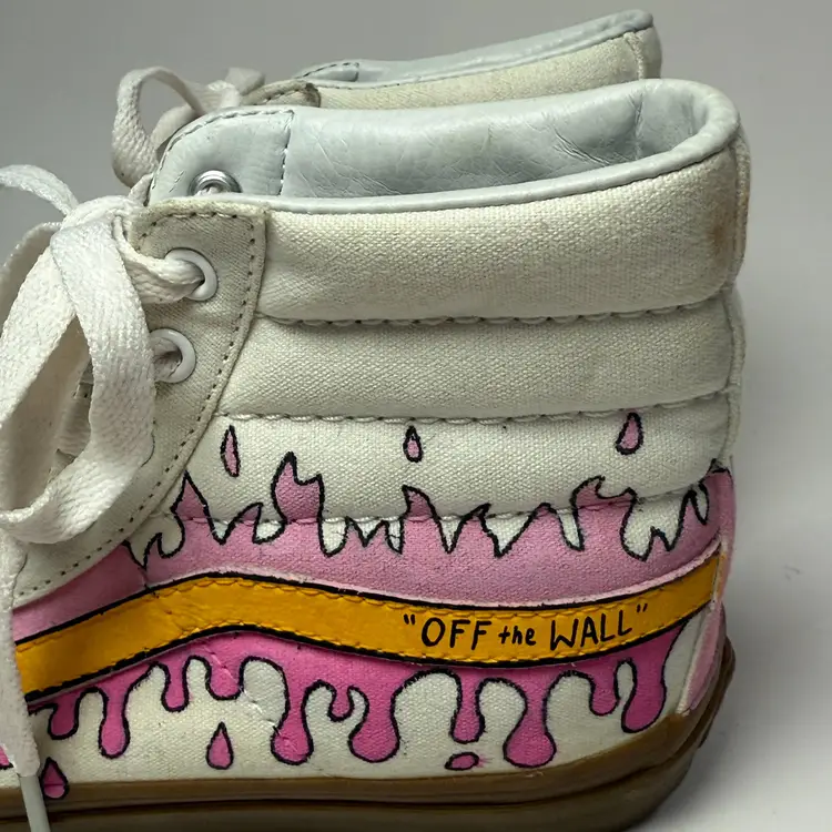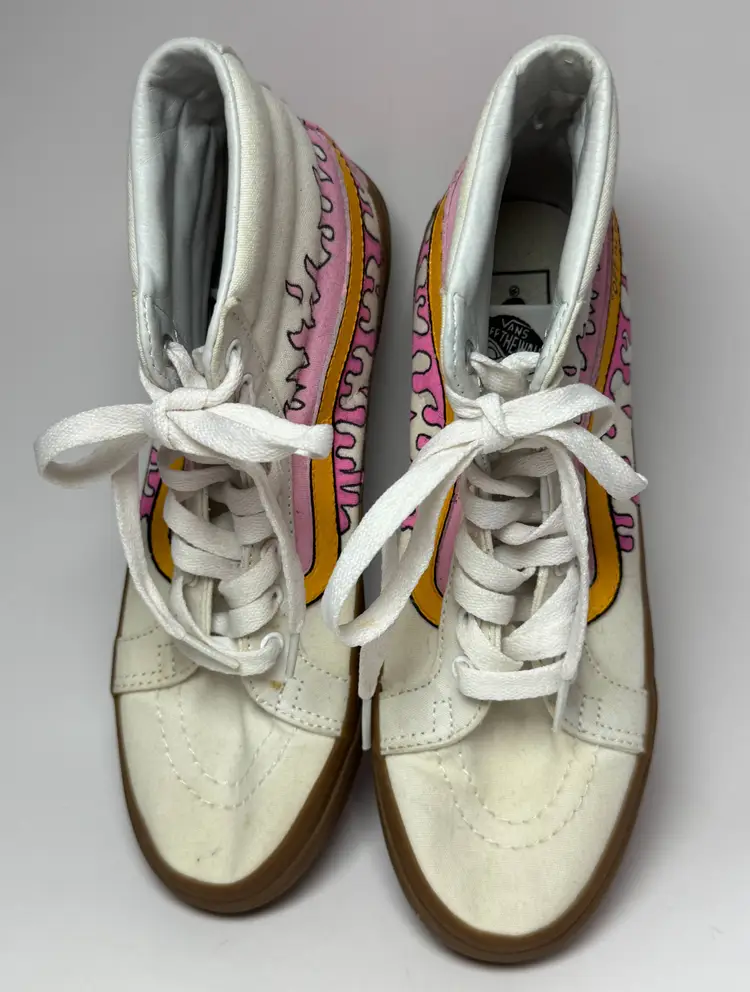 Custom Painted Vans Sk8-Hi High Top Women's Size 9 Men's Size 7.5 Pink Yellow Drip Flame. Very good condition with some light wear. A few small stains which may come out in wash.