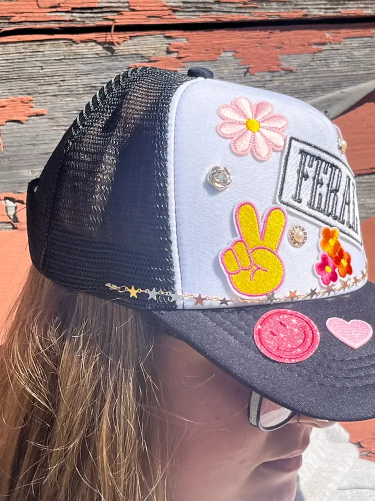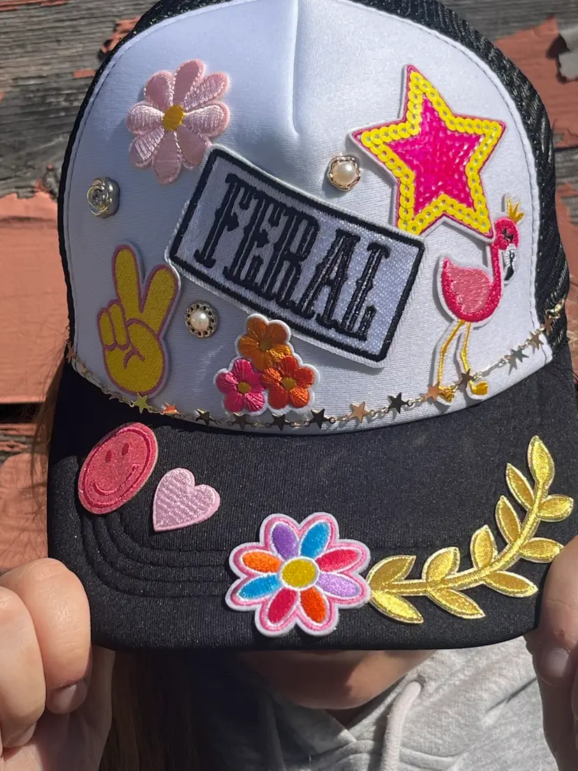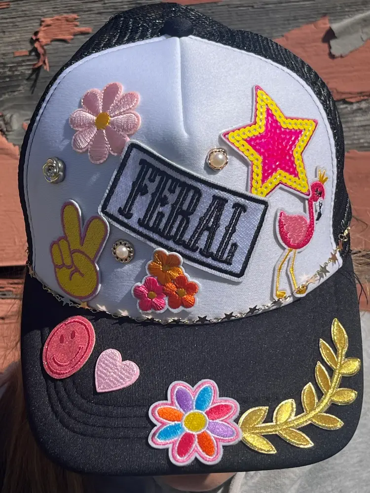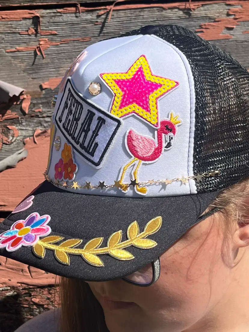 “Feral” main patch with lots of style added to it to showcase your pizzazz. Gold star chain for brim trim.
