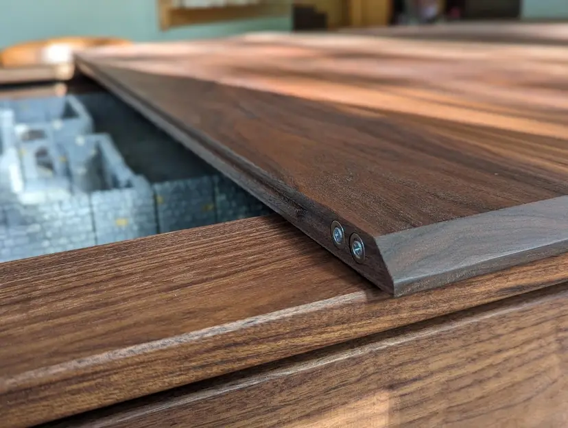 Materials Each piece is handmade to order in our Texas workshop using only the best lumber sourced from our localhardwood suppliers. The one pictured is made in black walnut, but can also be made in Oak or Cherry. The vaulted section has Championship Invitational Pool Table Cloth with a padded base that is stain and water-resistant, and can be in a color of your choice. The four-piece divided top is held together with high-strength magnets.