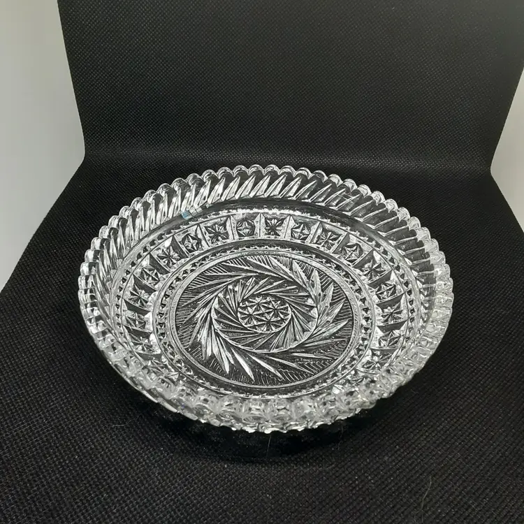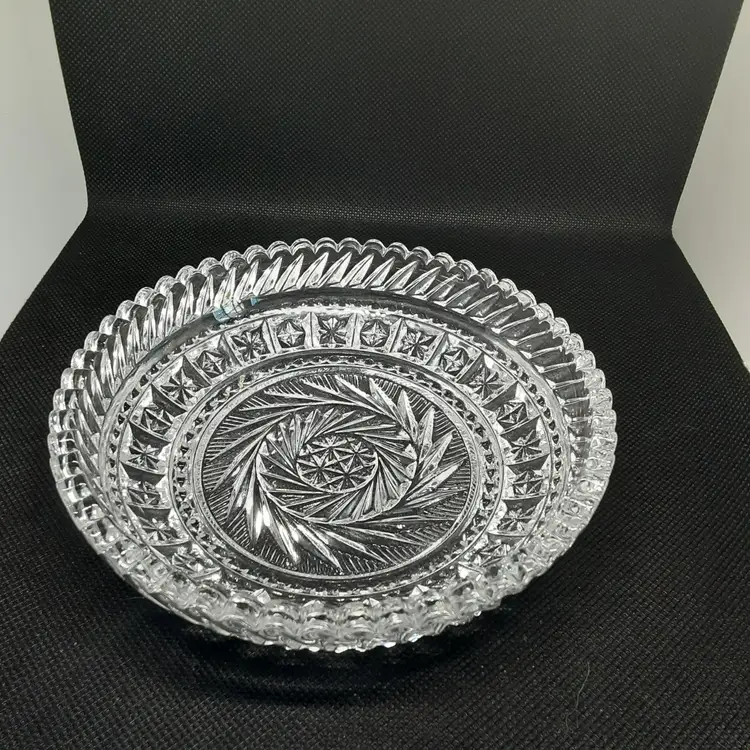 This vintage candy dish is a delightful addition to any home decor. The round, clear crystal material gives it an elegant and timeless look, perfect for any occasion. The art deco style and decorative features make it a unique piece that is sure to impress. Measuring at 5 1/2 inches in diameter and 1 1/2 inches deep, this candy dish is perfect for displaying your favorite treats or simply as a decorative piece. Hand wash only and made with care, this original piece is sure to be a cherished addition to your collection.