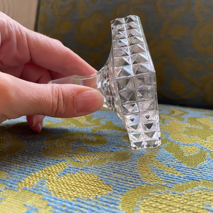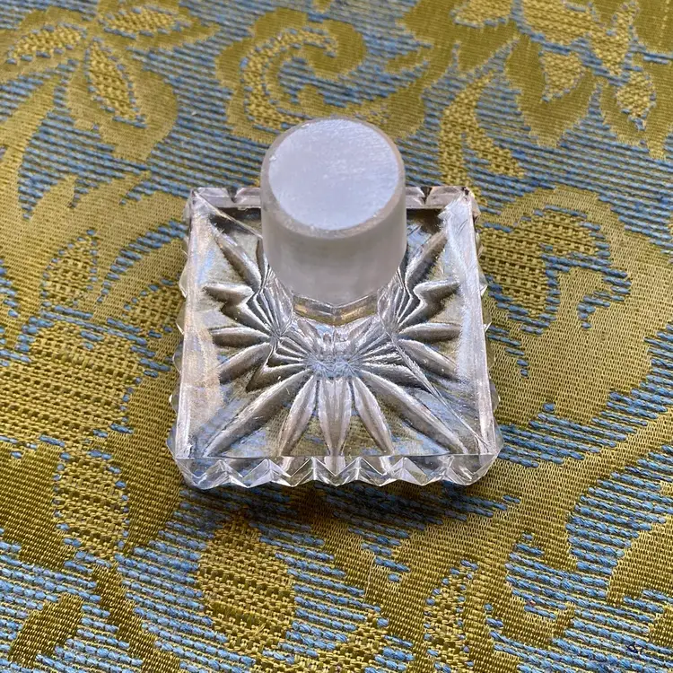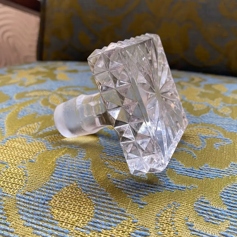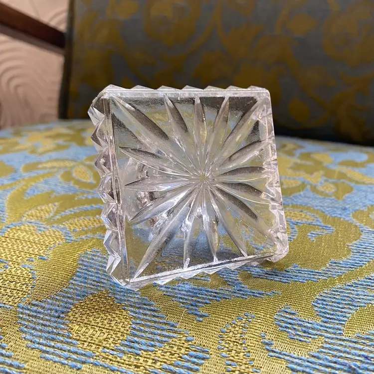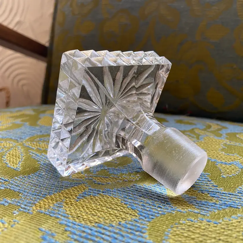 Heavy cut crystal decanter stopper with pyramid points around the square edges and a radiant burst on the top. Etched base for a better seal. Excellent condition! 3” square / stopper measures 7/8” diameter at the bottom edge.