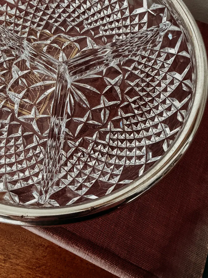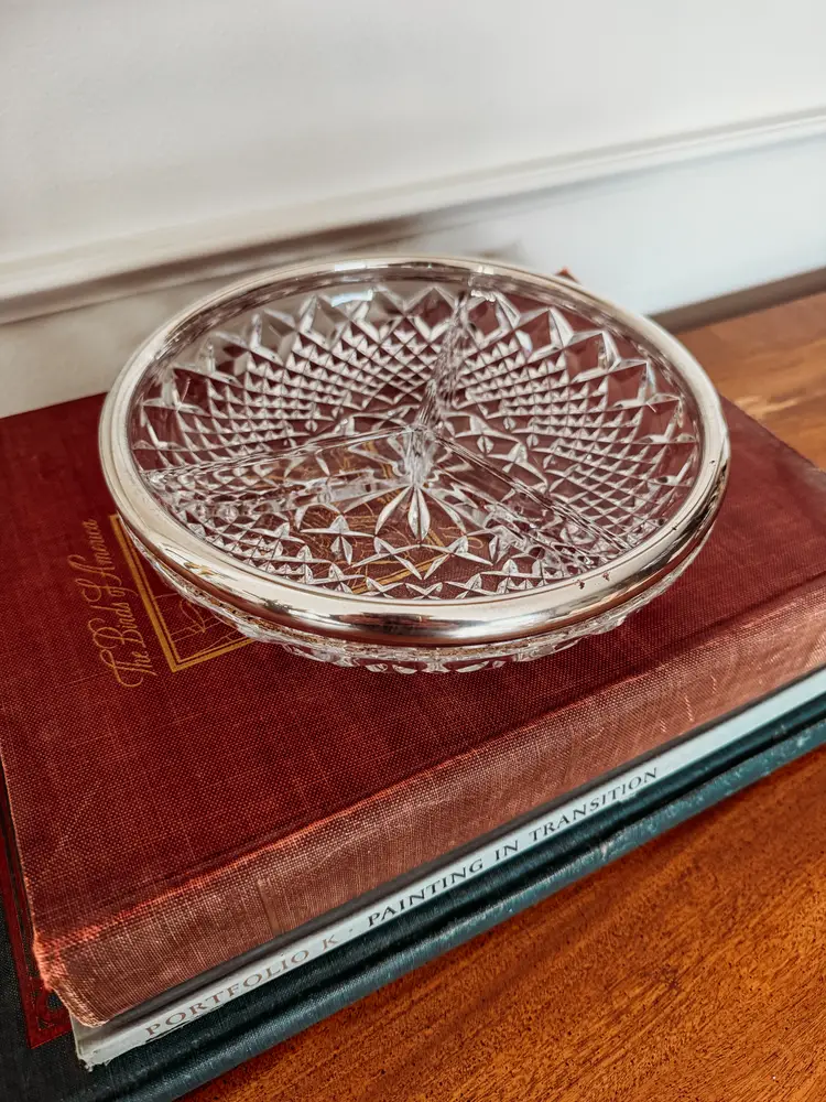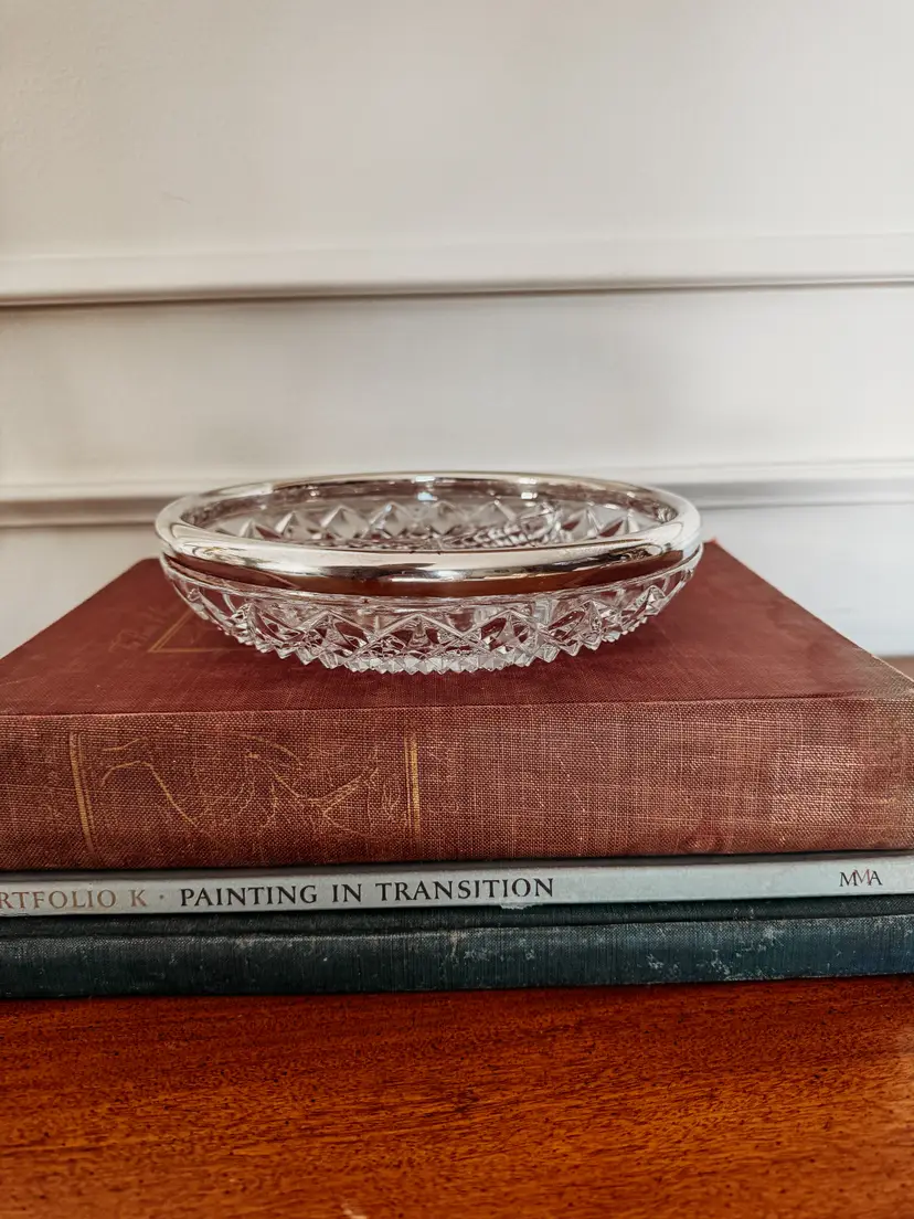 8" in diameter. The silver rim was recently polished and is not attached to the crystal. It could be glued in place, but honestly it makes it easier to clean to keep them separate. A stunning sparkly piece!