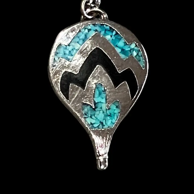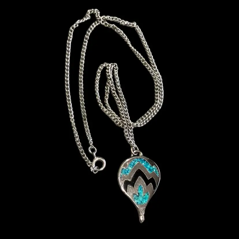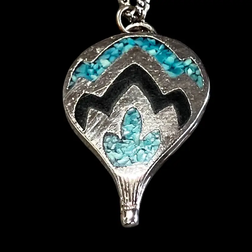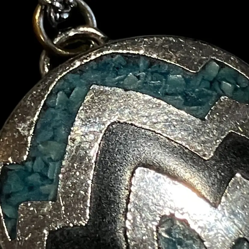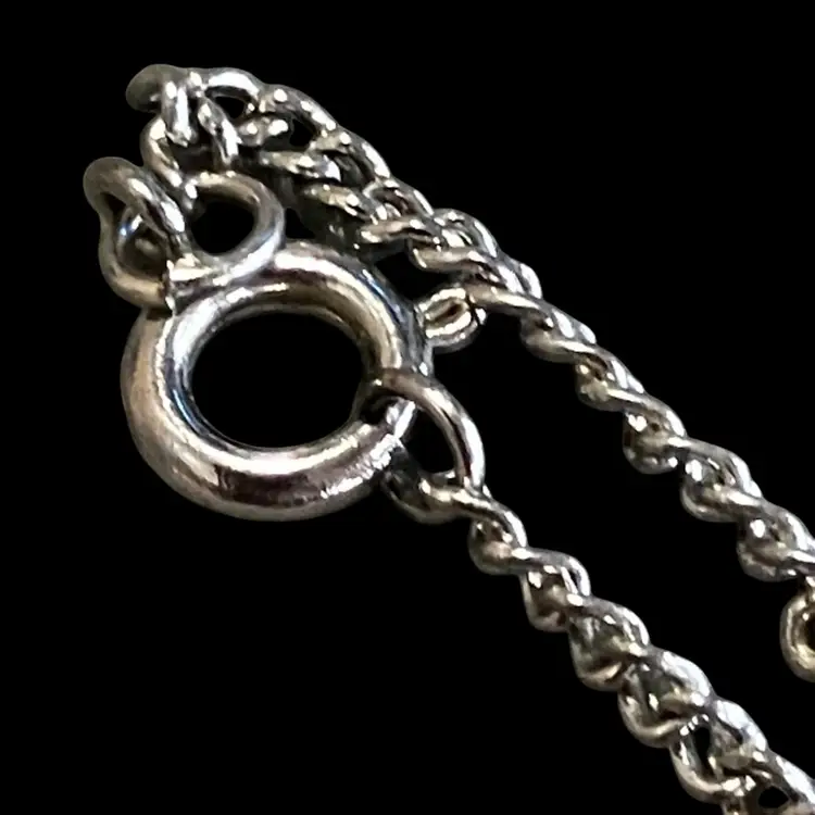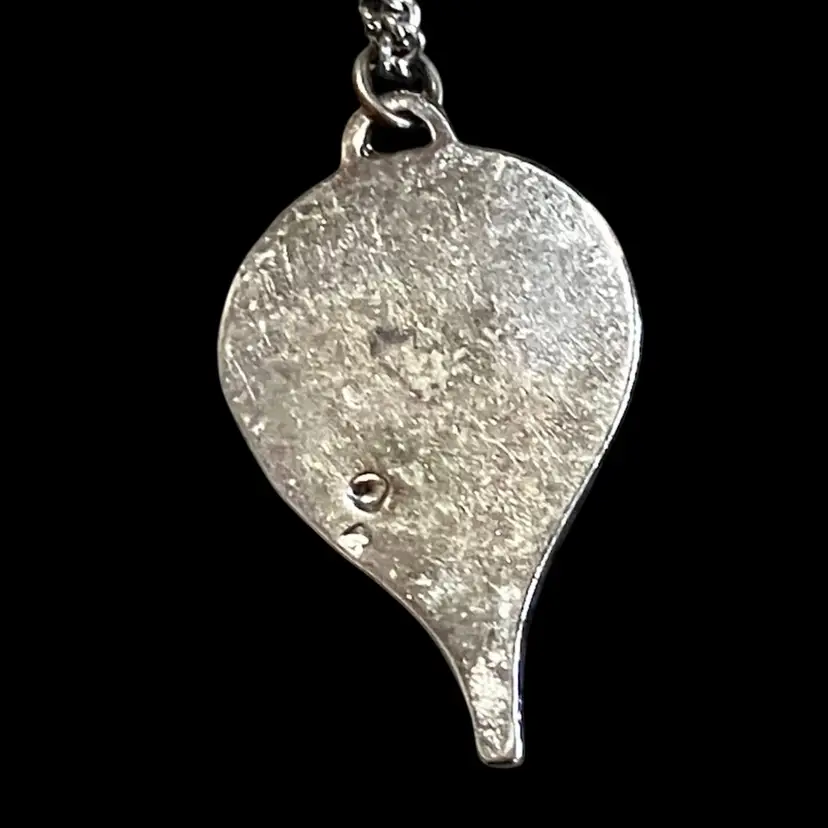 Silver tone metal pendant on an 18” chain. Has a little wear spot on the back in the middle.