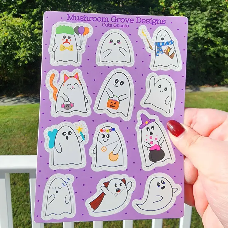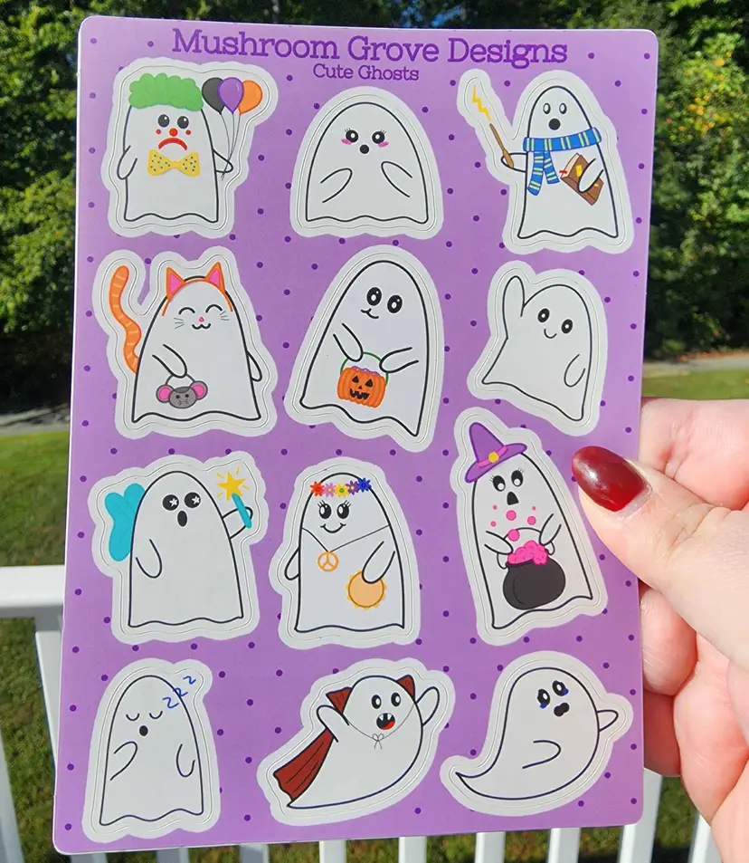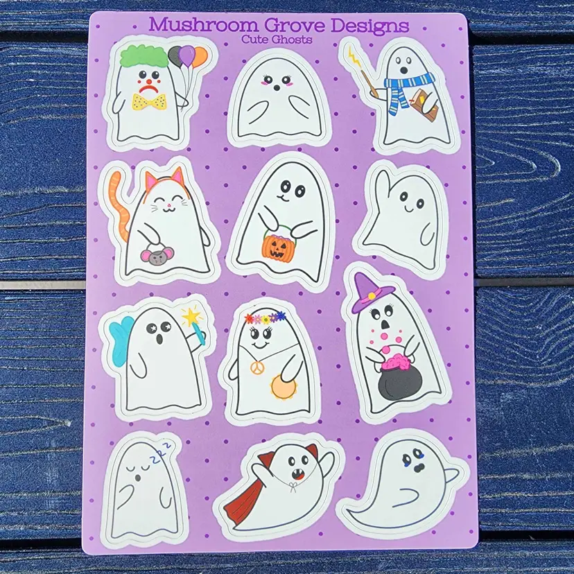 This sticker sheet features 12 adorable ghosts, most dressed for Halloween but also cute year round. Each sticker sheet measures 5x7 inches (12.7x17.8 cm) with each ghost measuring approximately 1x1.5 inches (2.54x3.81 cm).