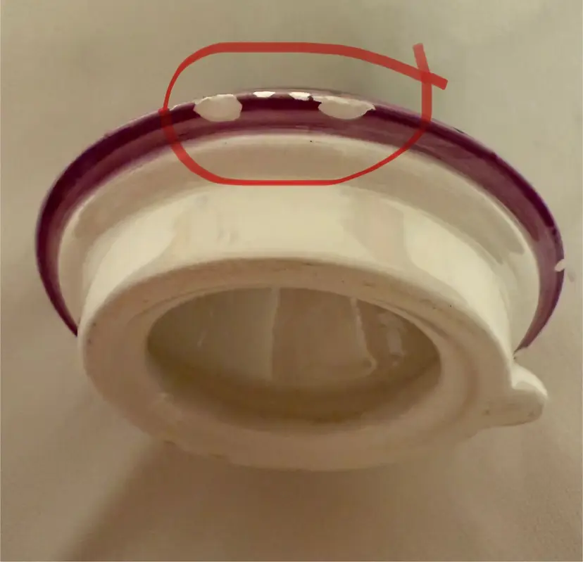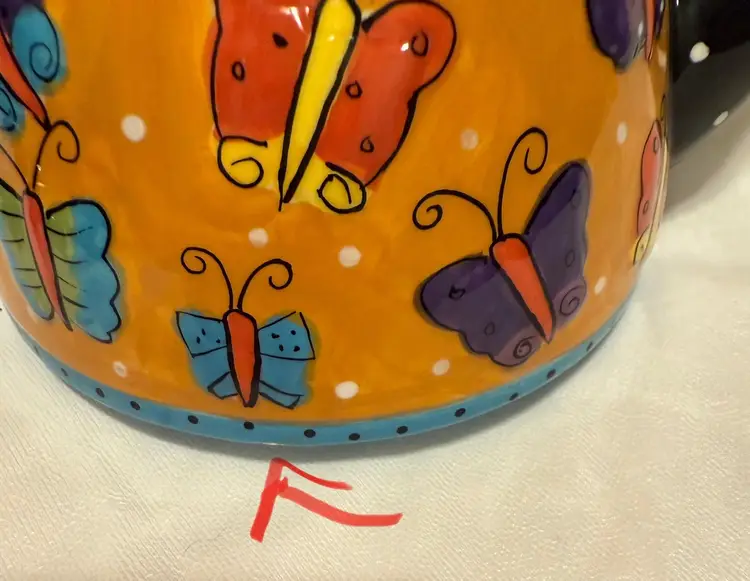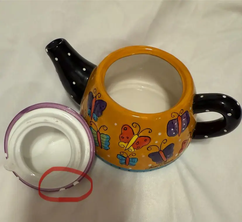 Super cute decorative butterfly teapot Please read description Pic 1- tiny chip on spout, almost looks like polka dots Pic 2 - where the chip is (underneath) in pic 3 Pic 3 - tiny chip bottom of pot, not visible Pic 4 - 2 tiny chips underside of lid (not visible on) Pic 5 - same chip as pic 4 Pic 6 - where that chip is (not visible when on pot) No big chips and no cracks 6” X 5”