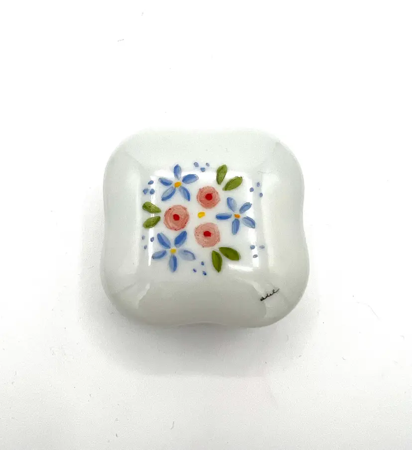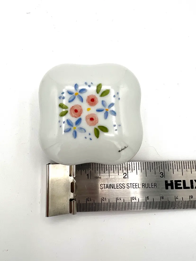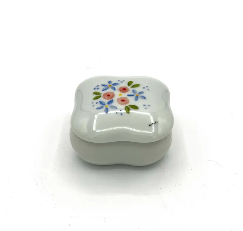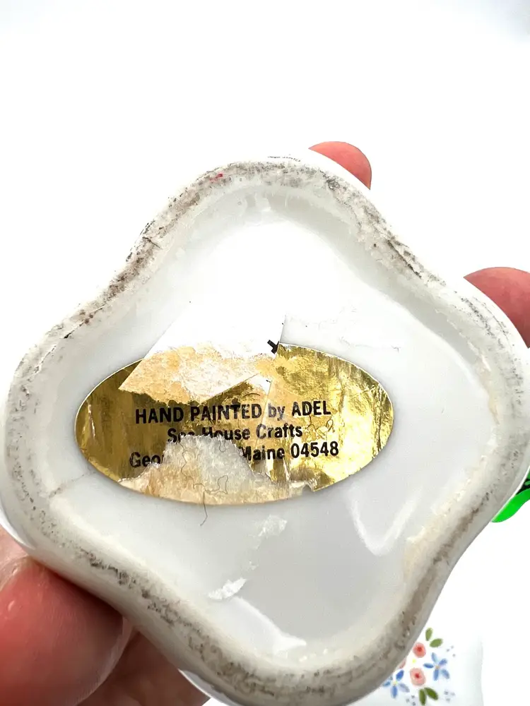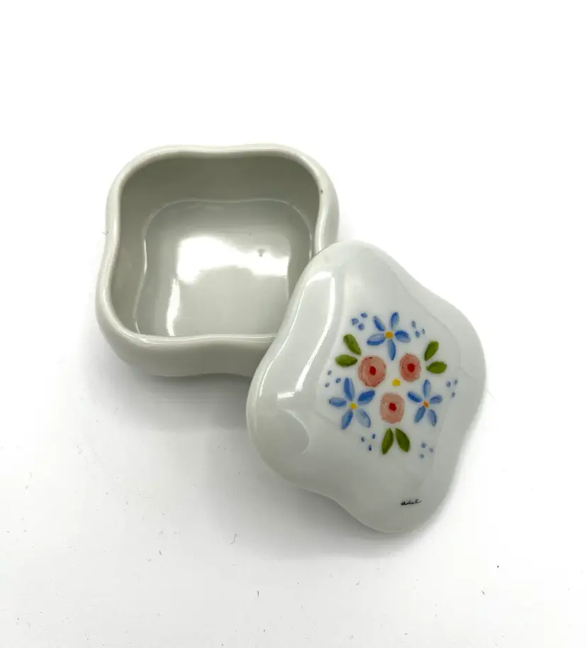 Adorable small trinket box made out what appears to be porcelain. It is signed by Adel. Short of 2.25” wide and long. In excellent condition.